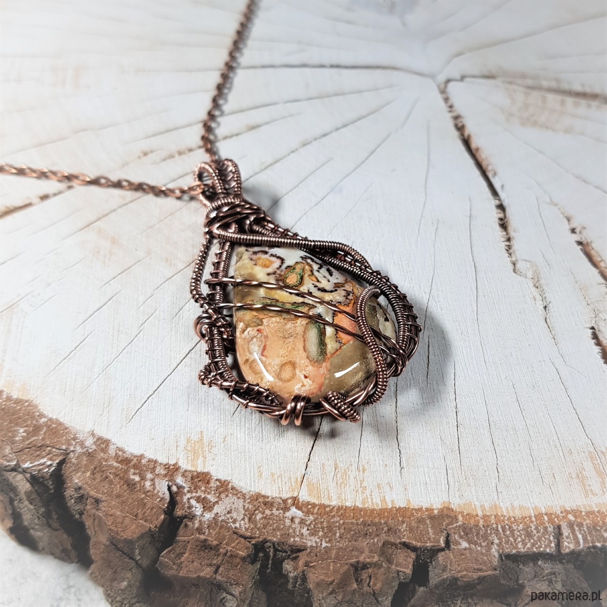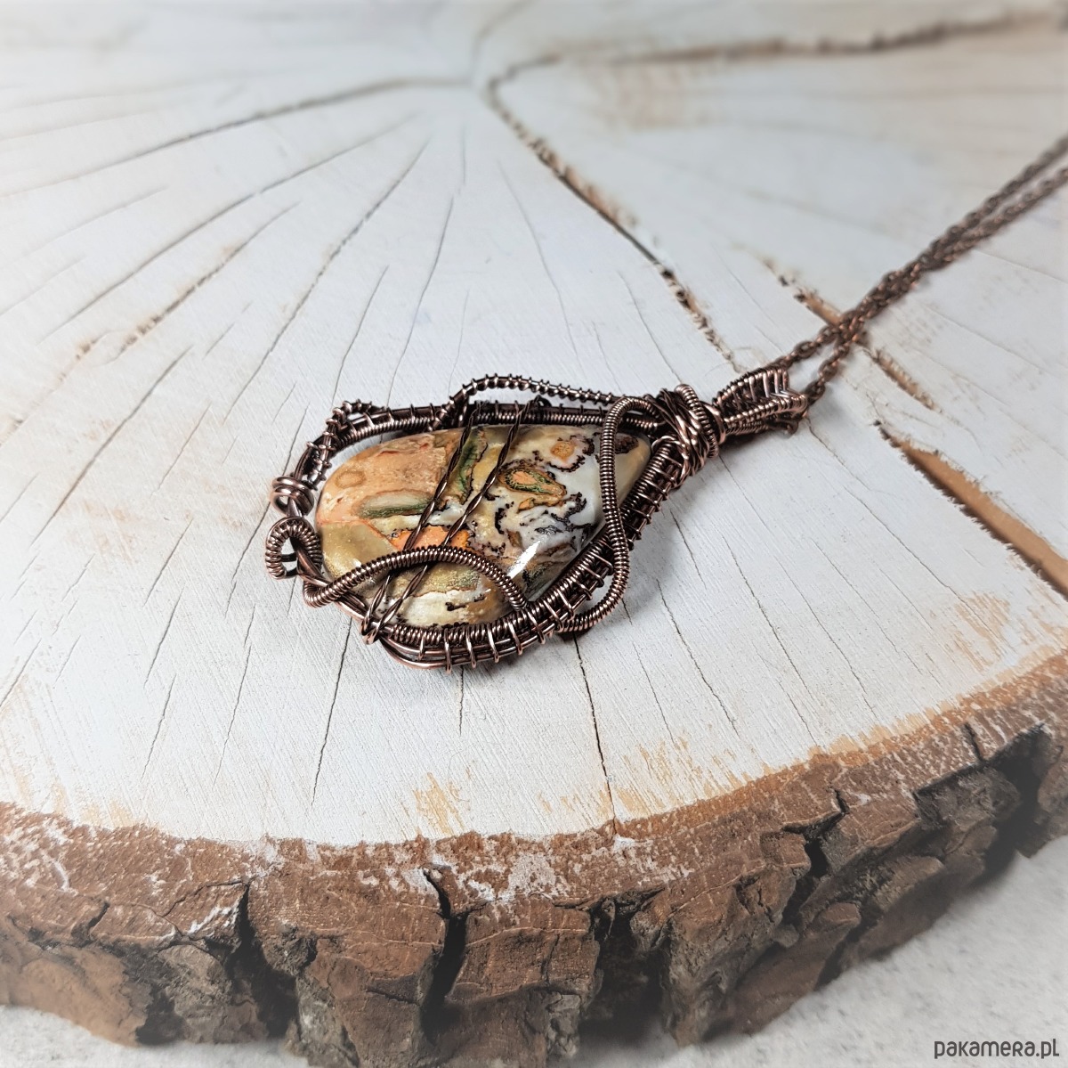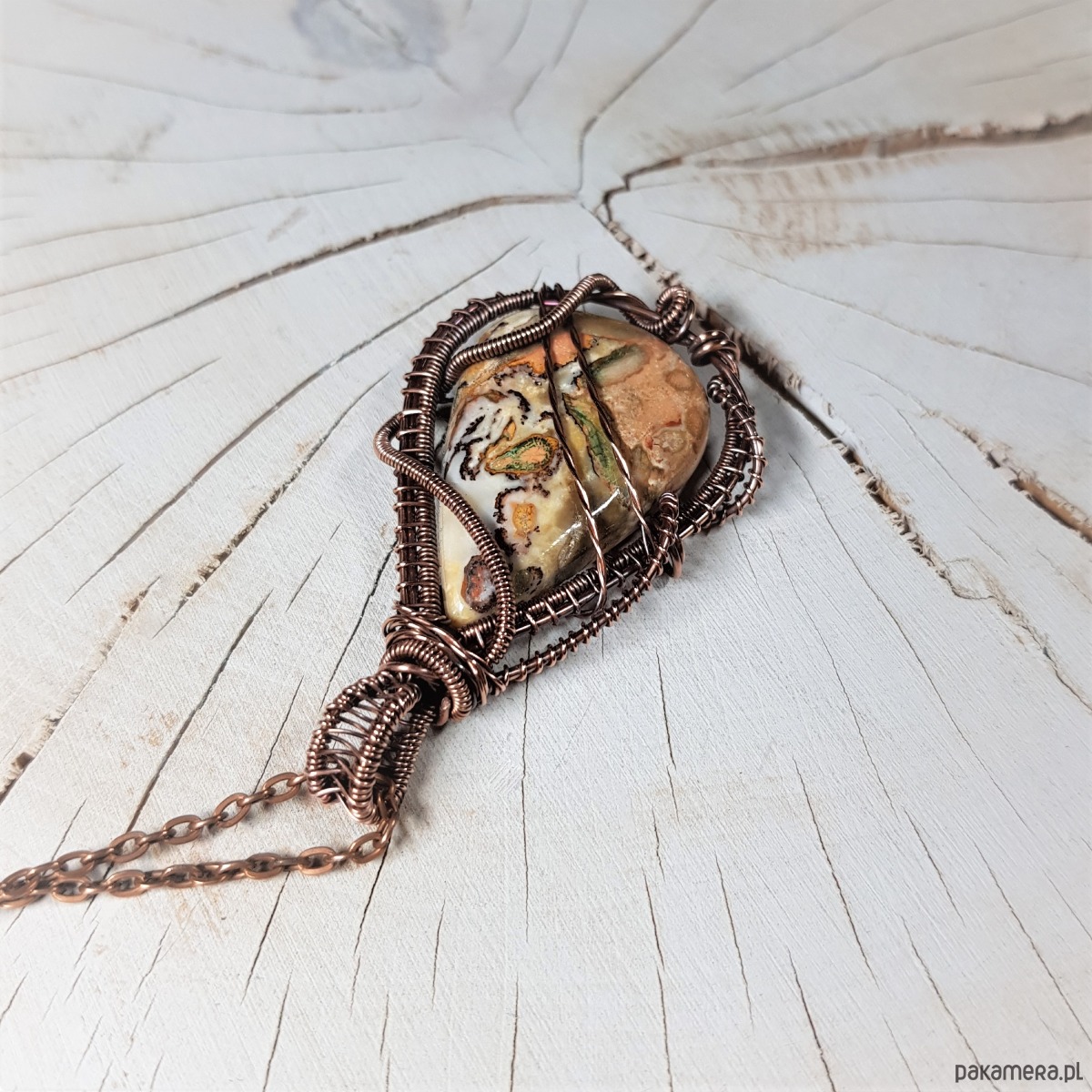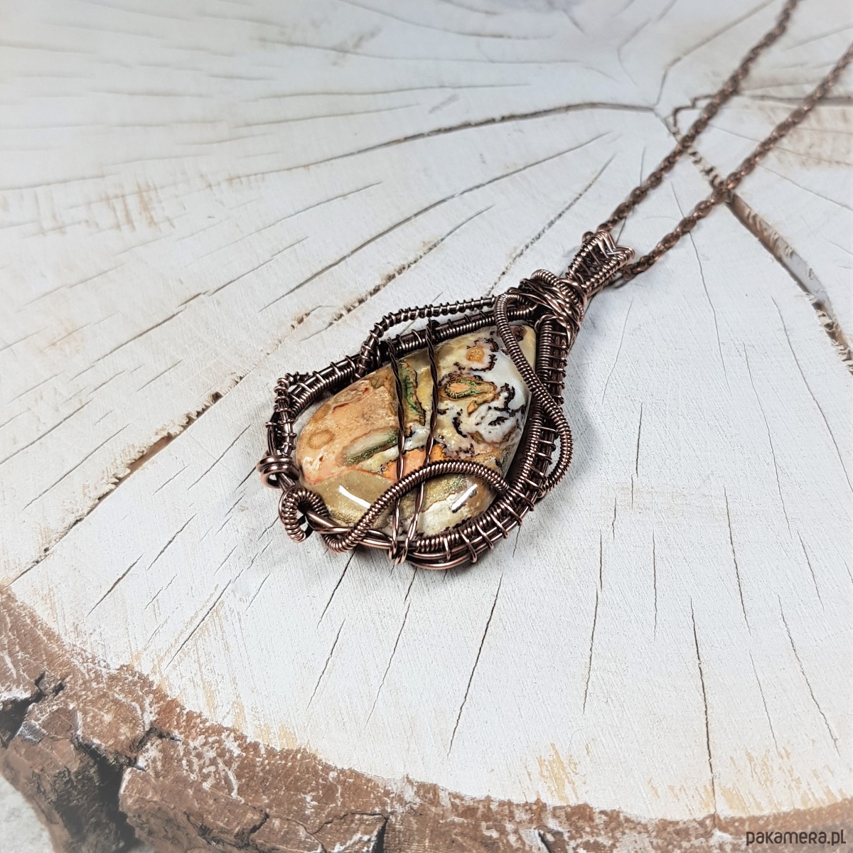 Zawieszka na łańcuszku z naturalnego indonezyjskiego jaspisu picasso w pięknych pastelowych kolorach tworzących drobny wzorek. Naszyjnik zrobiony ręcznie z miedzi pracochłonną metodą wire-wrappingu, następnie oksydowany i wypolerowany w celu uzyskania efektu szlachetnego postarzenia. Wymiary wisiorka 60x35, zawieszony na łańcuszku standardowej długości około 50cm.