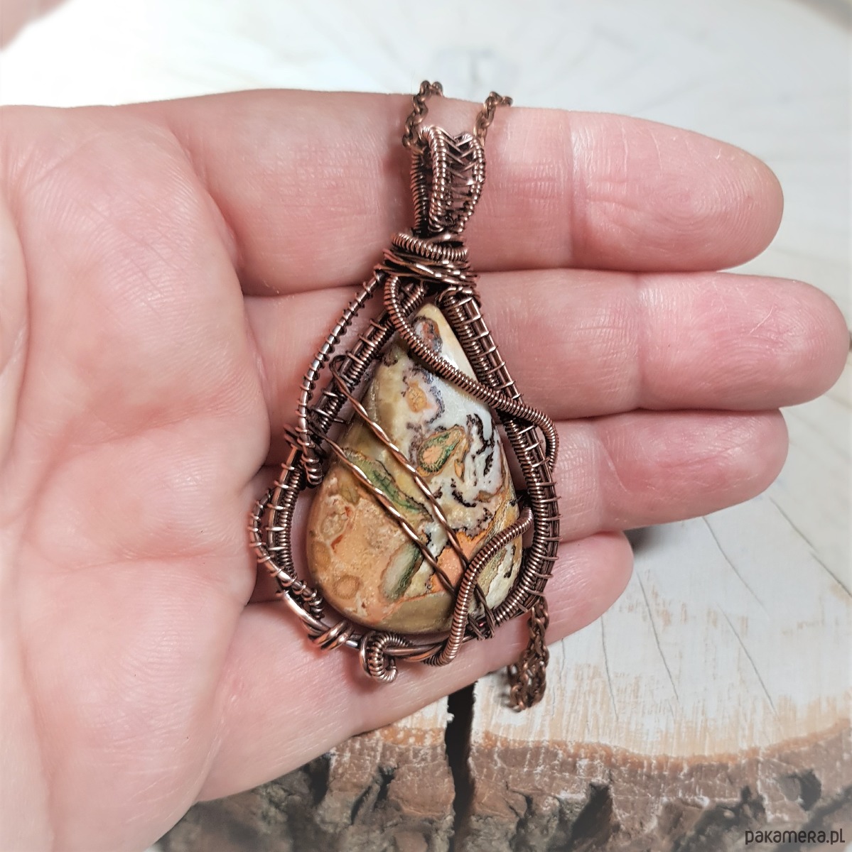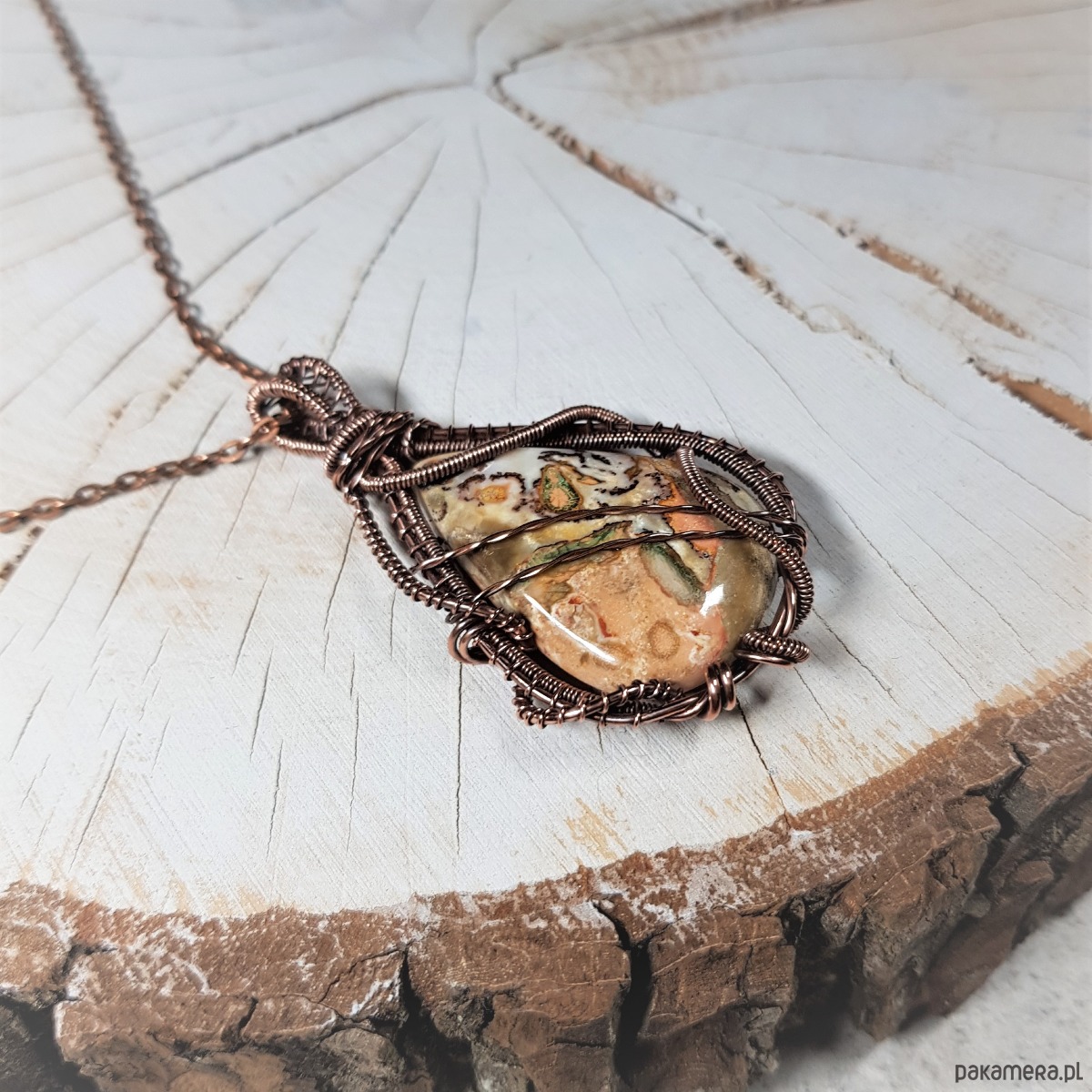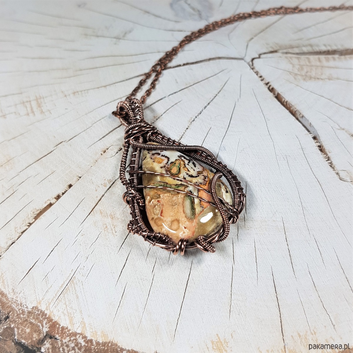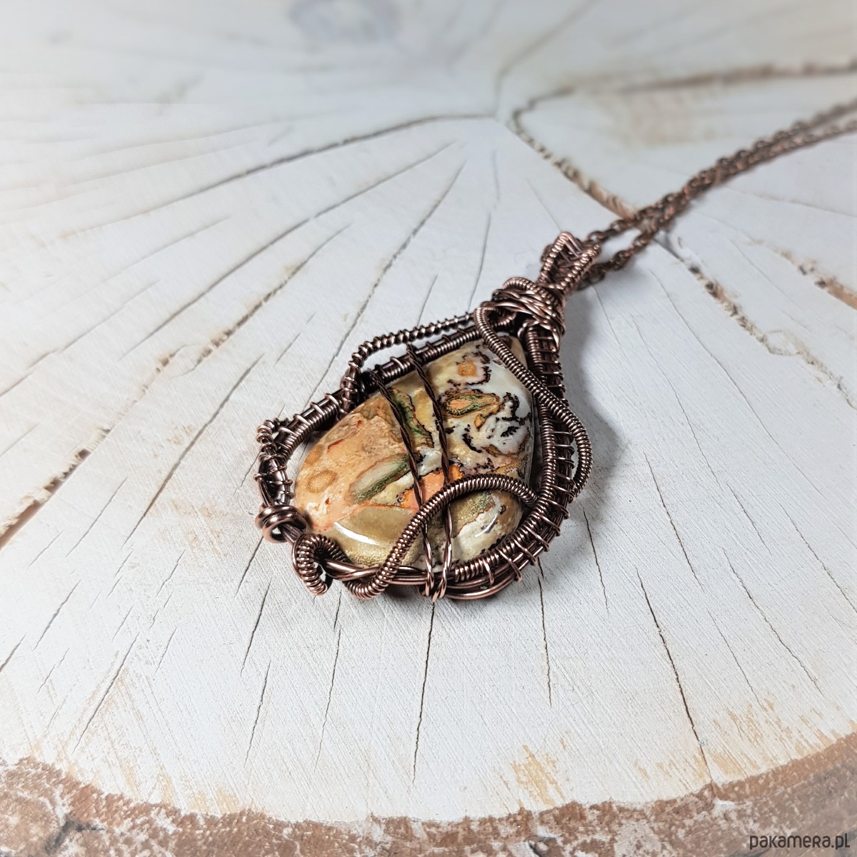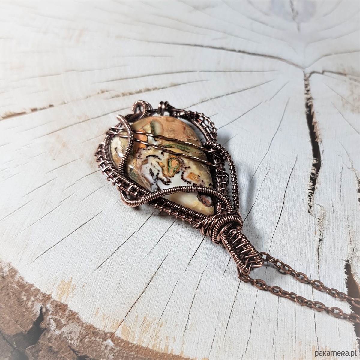 Zawieszka na łańcuszku z naturalnego indonezyjskiego jaspisu picasso w pięknych pastelowych kolorach tworzących drobny wzorek. Naszyjnik zrobiony ręcznie z miedzi pracochłonną metodą wire-wrappingu, następnie oksydowany i wypolerowany w celu uzyskania efektu szlachetnego postarzenia. Wymiary wisiorka 60x35, zawieszony na łańcuszku standardowej długości około 50cm.