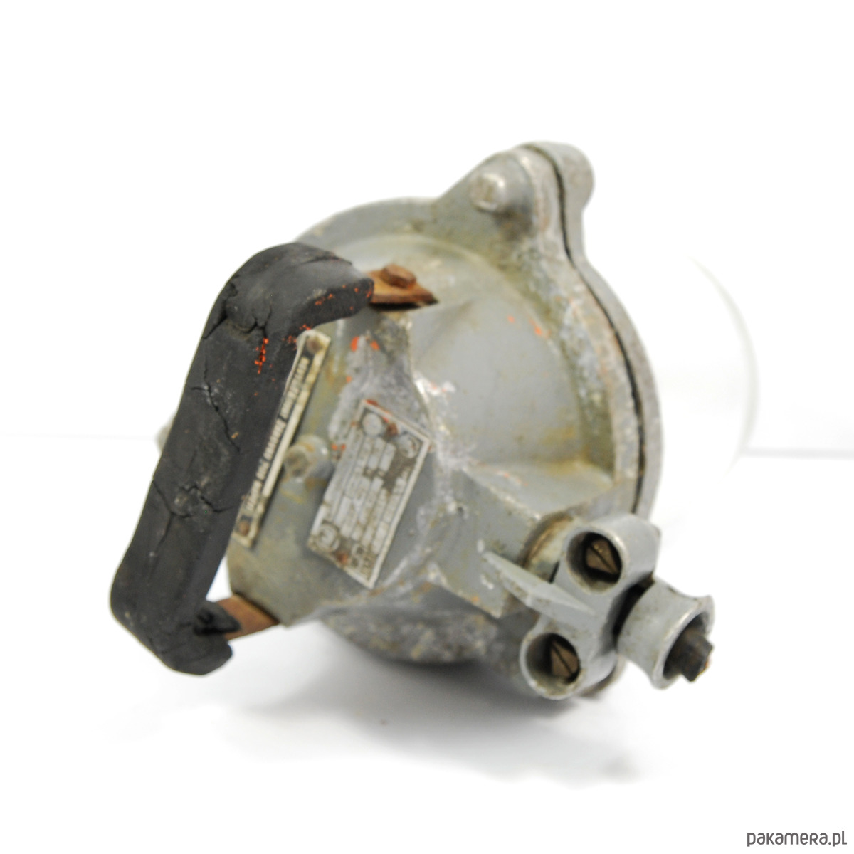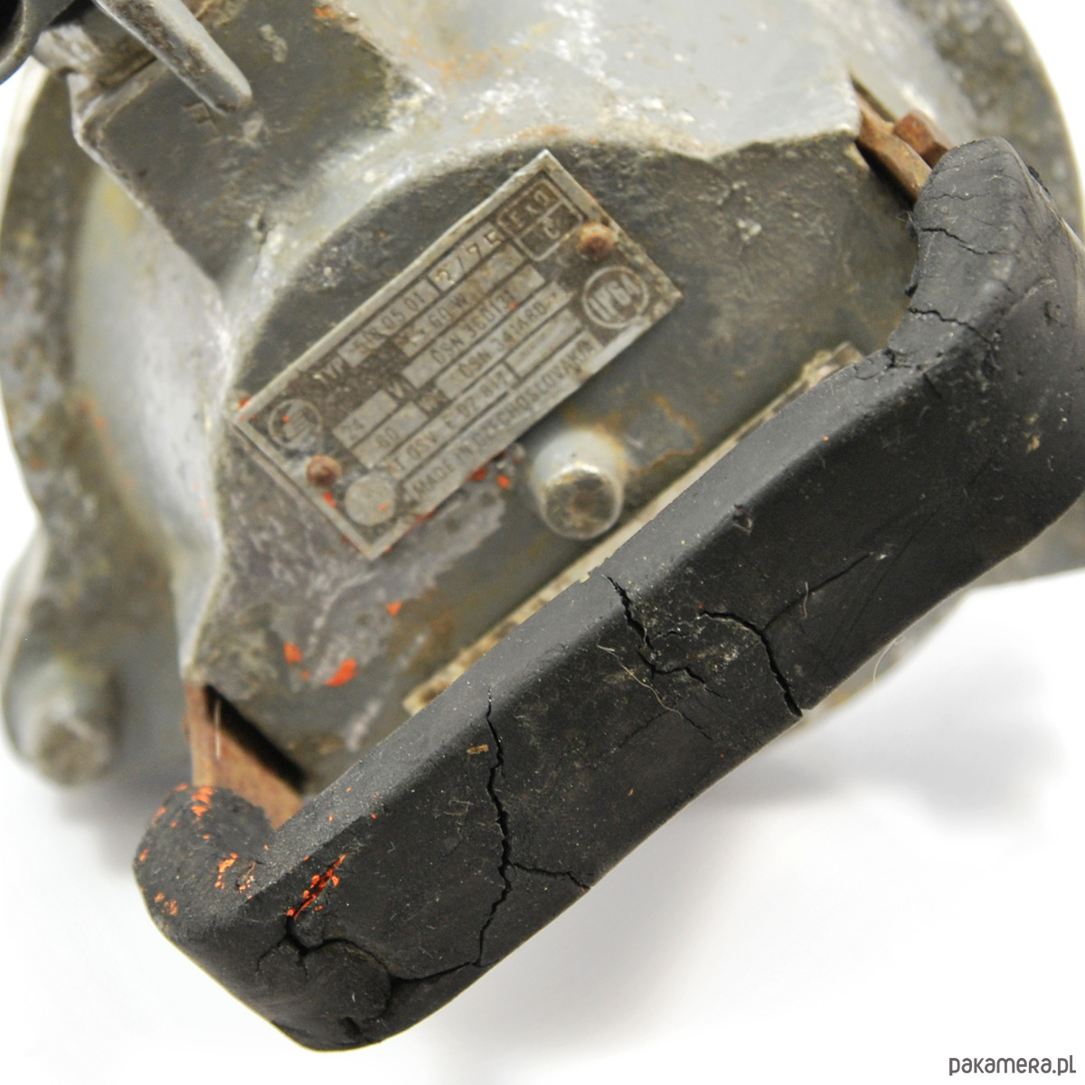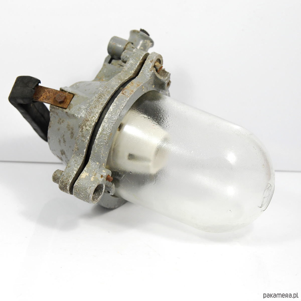 Industrialna lampa sufitowa typ 518-05 wyprodukowana w latach 60. w Czechosłowacji. Lampa z etykietą sygnaturową oraz uchwytem pokrytym gumą. Przedmiot w stanie oryginalnym dobrym, nosi ślady użytkowania. Guma popękana, obudowa z widoczną patyną. Lampa sprawna na pojedynczą żarówkę E27 do 100W.Wymiary:wysokość 32 cm | średnica 24 cm