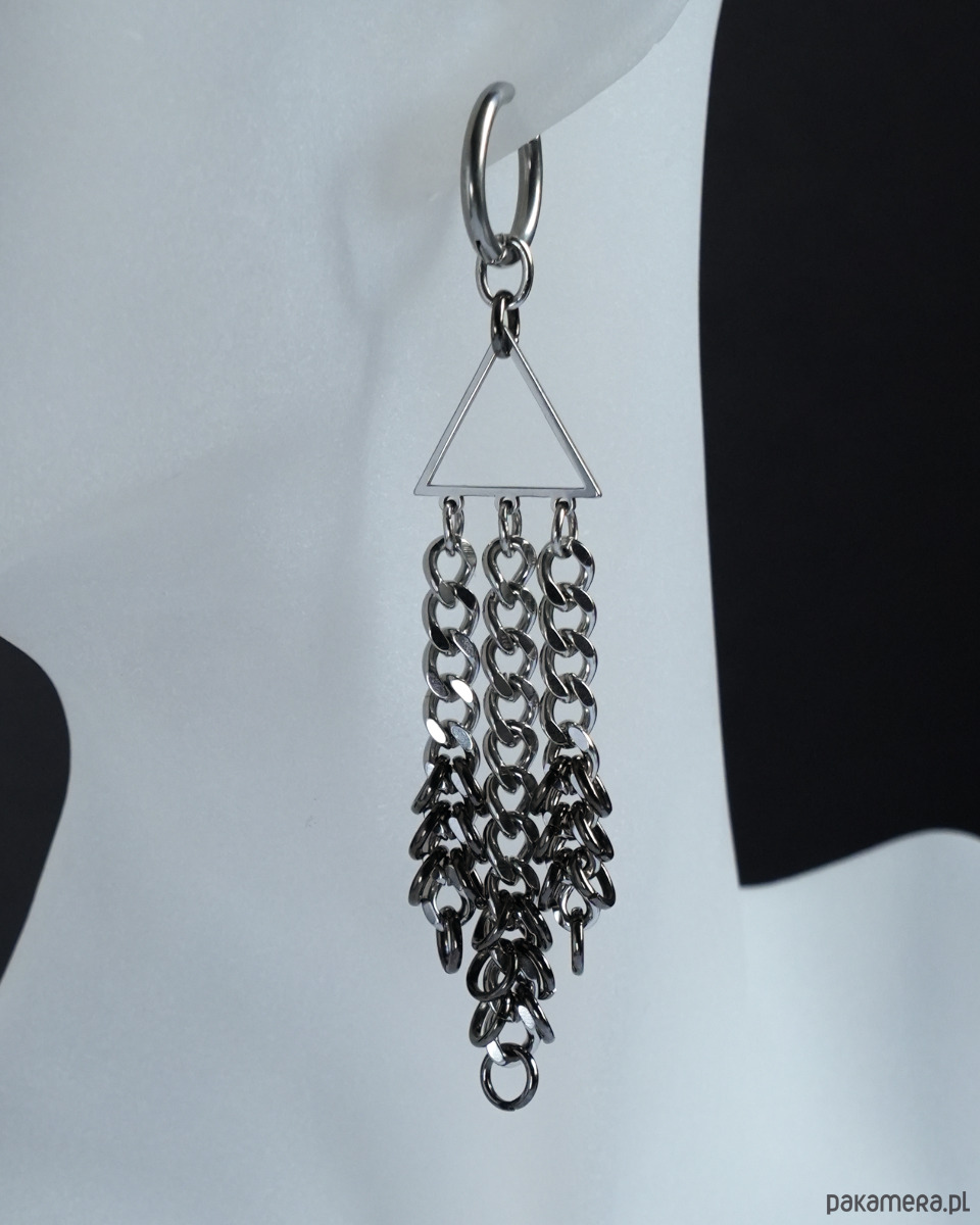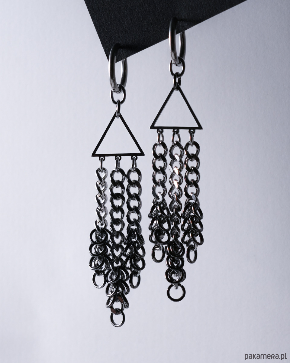 Kolczyki są dość masywne i ciężkie. Propozycja dla osób, które lubią wyrazistą, mocną i przykuwającą wzrok biżuterię. Będą świetne do stylizacji w klimacie rockowym, goth, dark aesthetic, modern industrial, alternatywa.