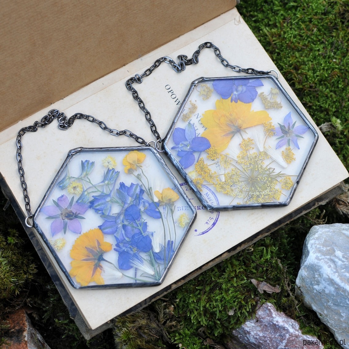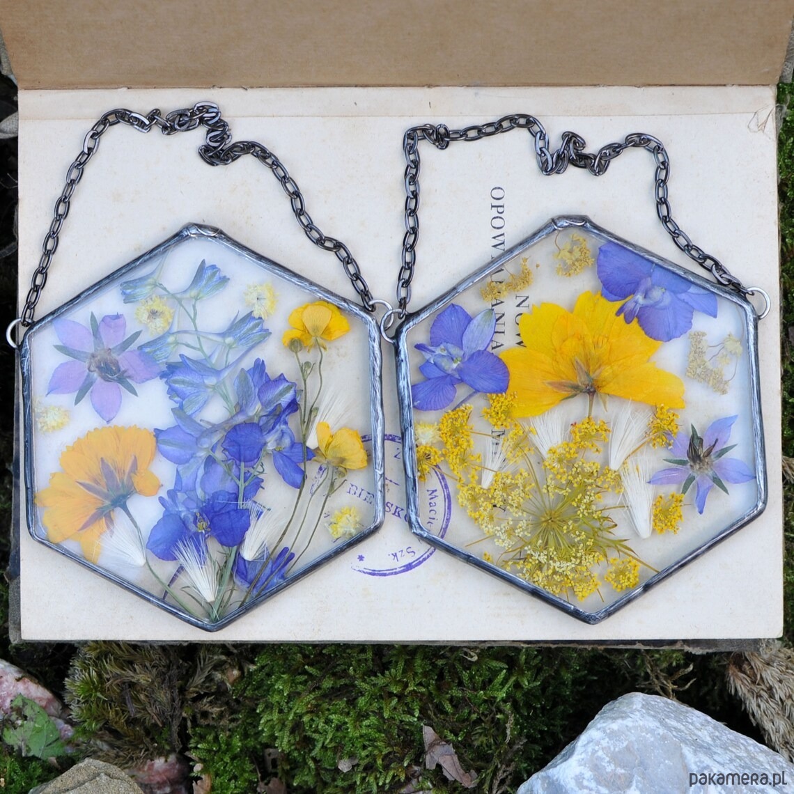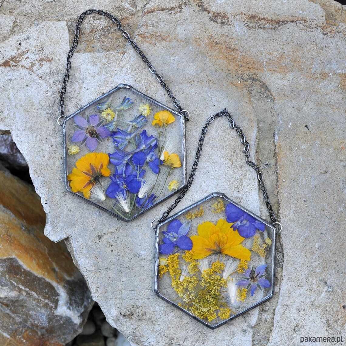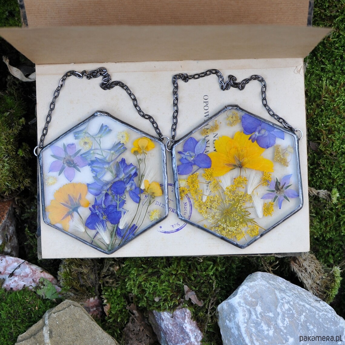 W szkle umieszczone są prawdziwe, suszone kwiaty.