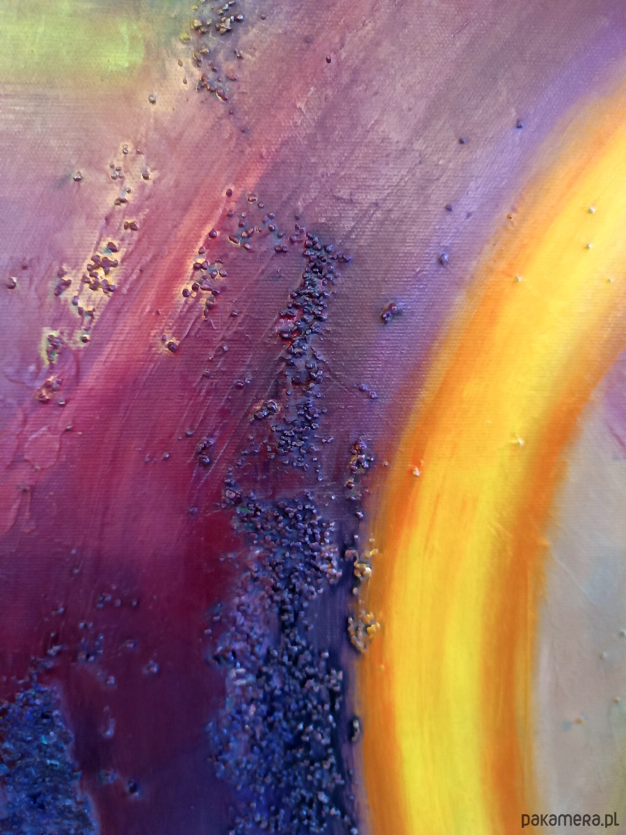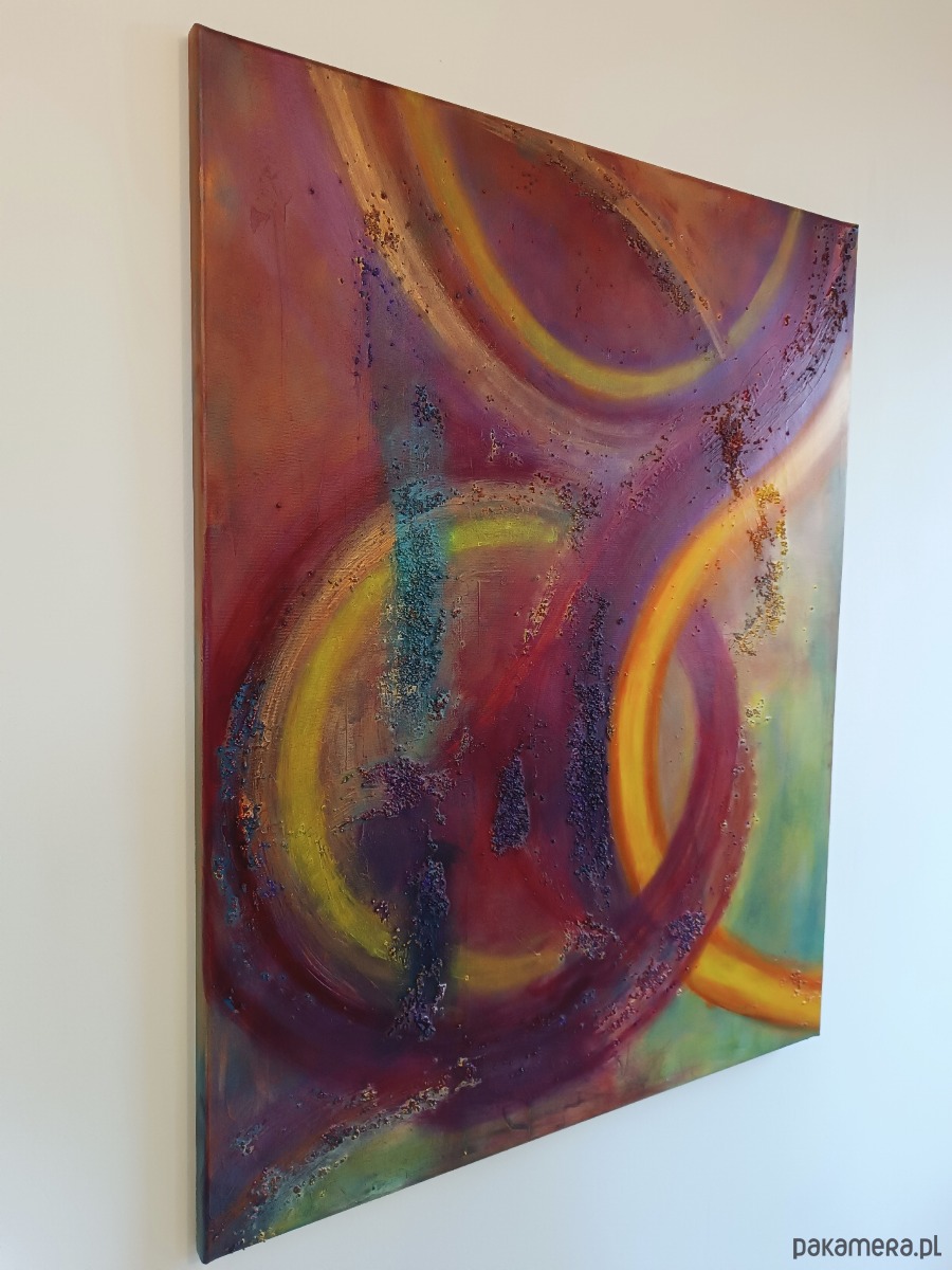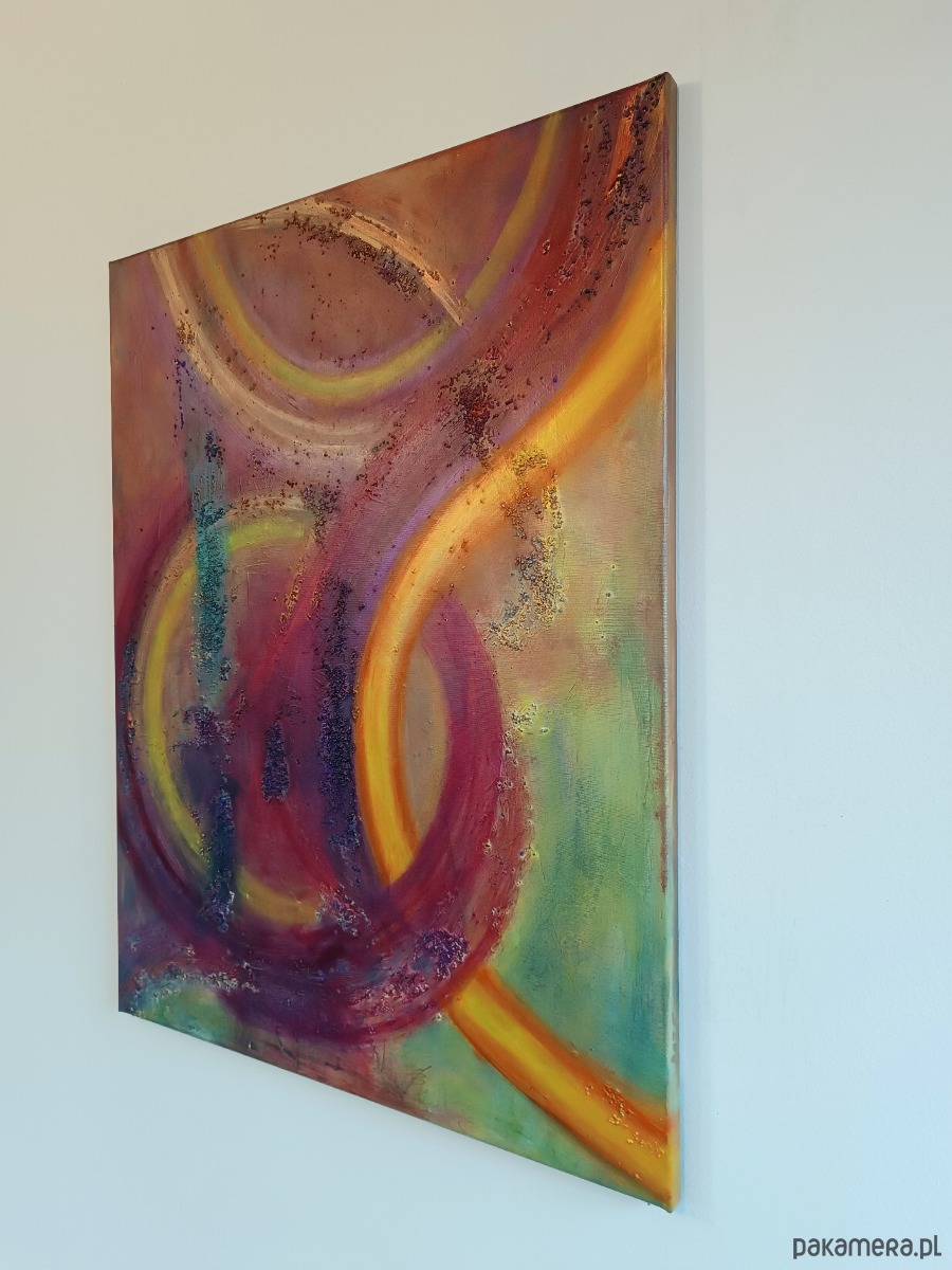 Obraz malowany pastami strukturalnymi i farbami akrylowymi, pięknie odbija światło dzięki metalicznym kolorom. W zależności od kąta jego padania, będzie przybierał mniej lub bardziej intensywne odcienie. Ożywi każde, nawet ciemne wnętrze.