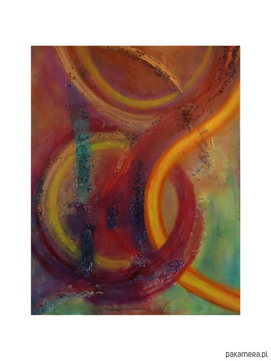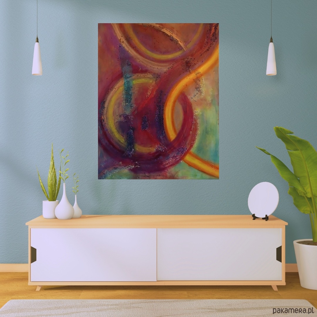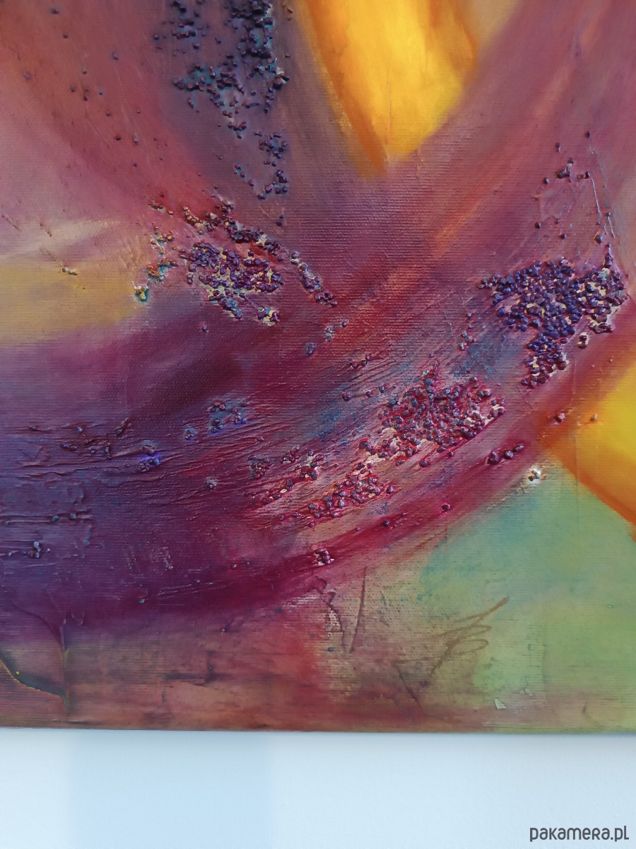 Obraz malowany pastami strukturalnymi i farbami akrylowymi, pięknie odbija światło dzięki metalicznym kolorom. W zależności od kąta jego padania, będzie przybierał mniej lub bardziej intensywne odcienie. Ożywi każde, nawet ciemne wnętrze.