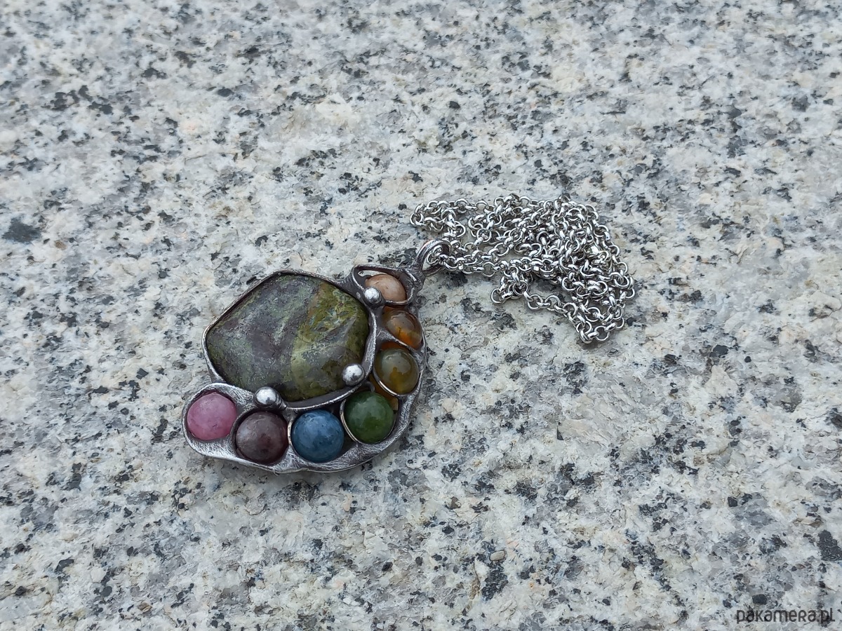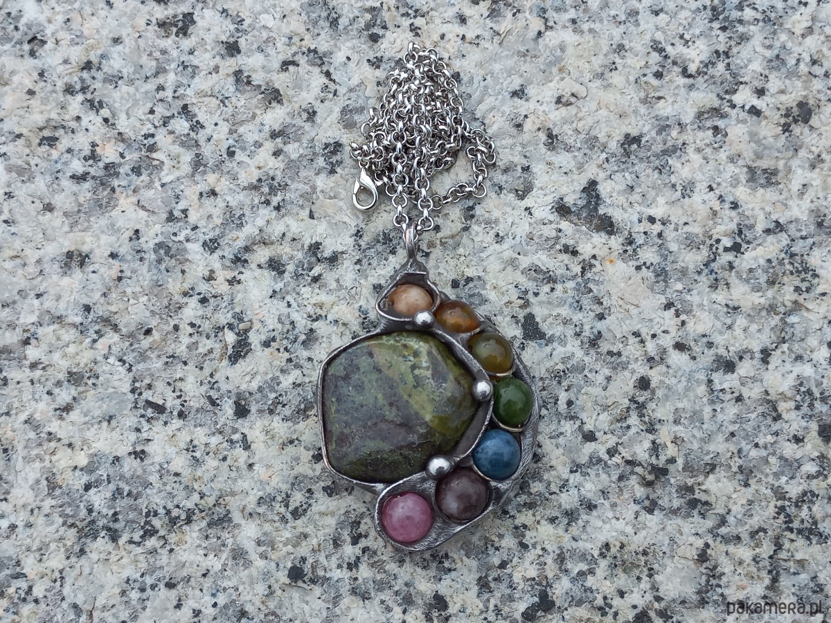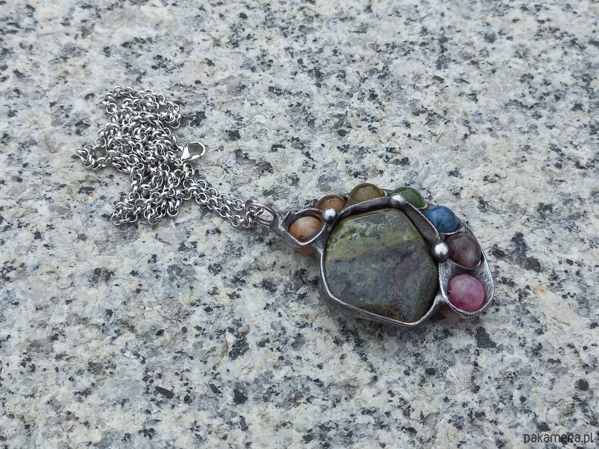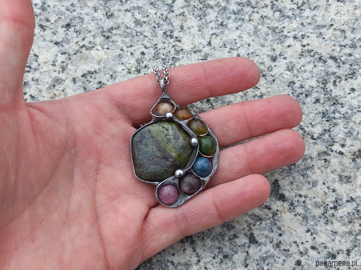 Wisiorek wykonany z miedzi, cyny, agatów i jaspisu. Wymiary ok. 5 na 3,5 cm. Zawieszony na łańcuszku o długości ok. 50 cm.