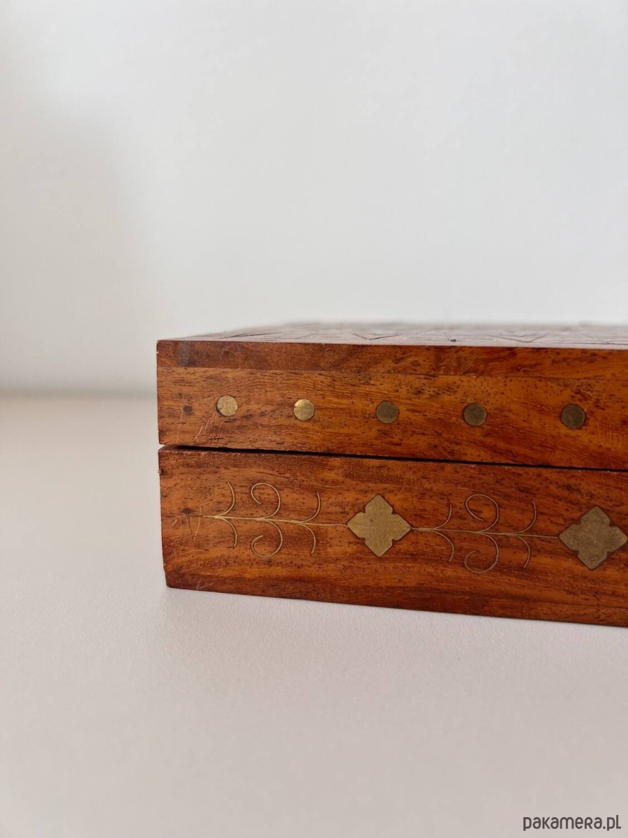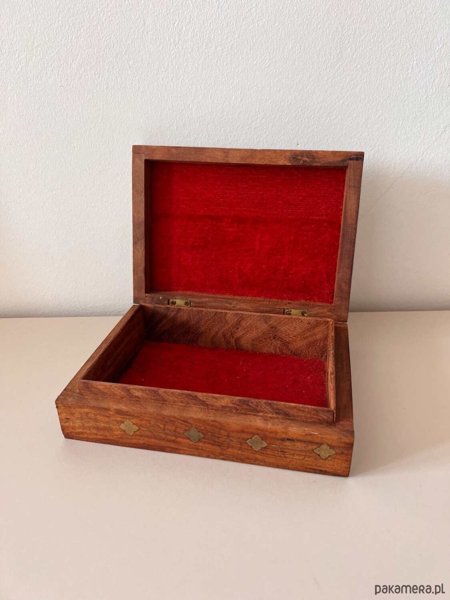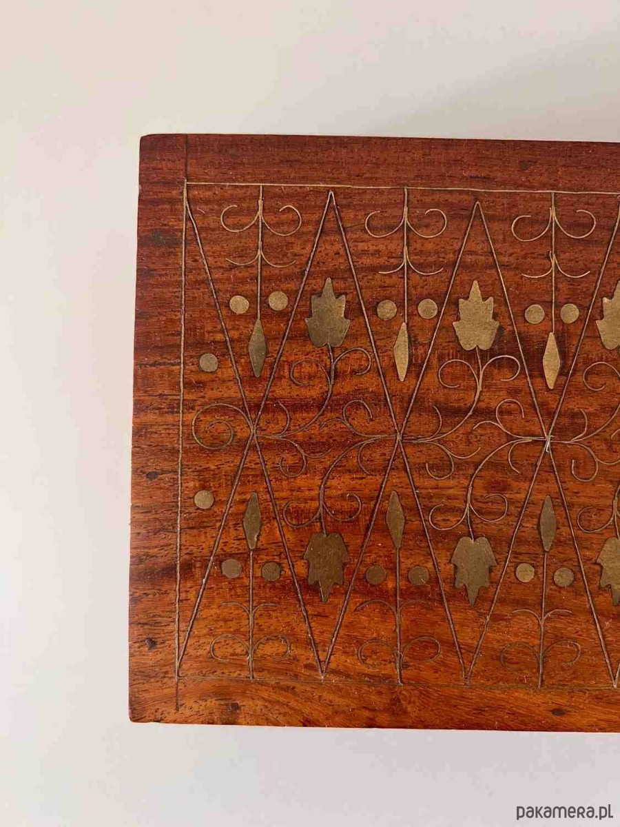 Drewniana szkatułka inkrustowana mosiądzem. Motyw roślinny i eleganckie, czerwone wnętrze.