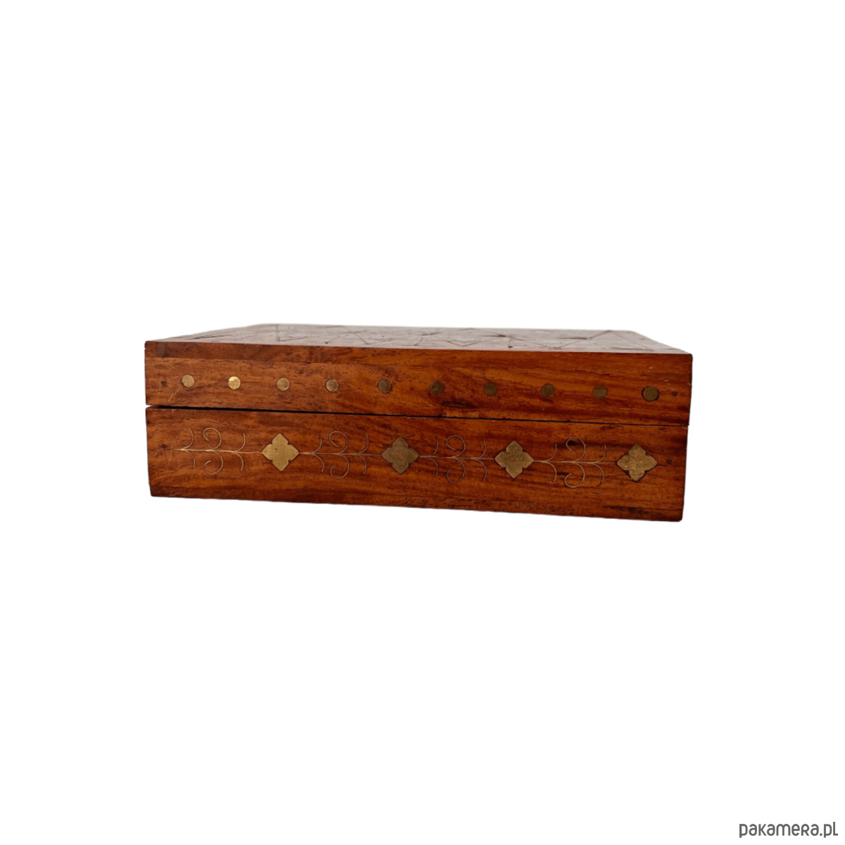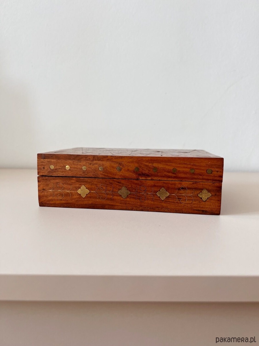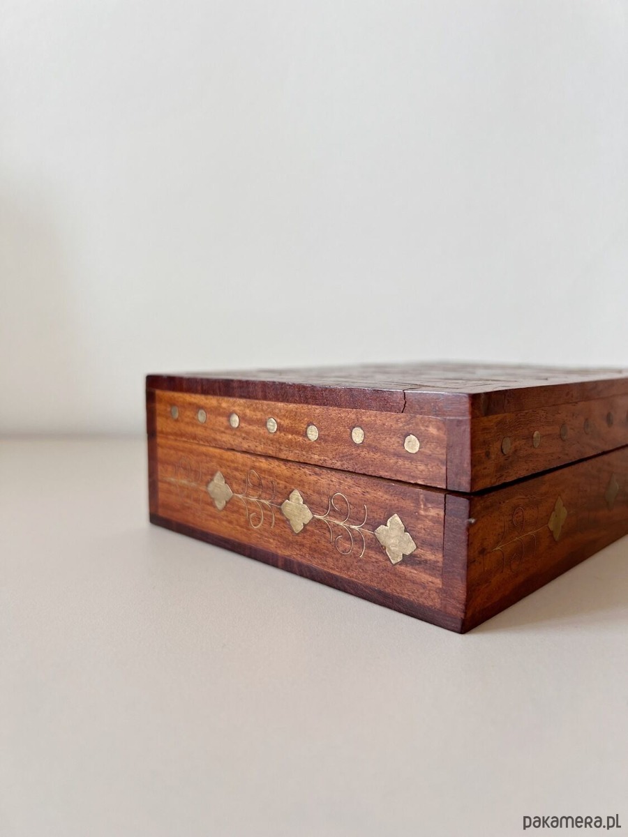 Drewniana szkatułka inkrustowana mosiądzem. Motyw roślinny i eleganckie, czerwone wnętrze.