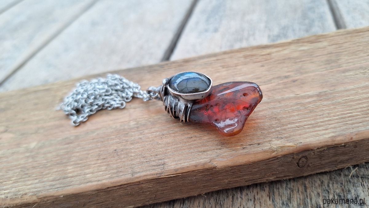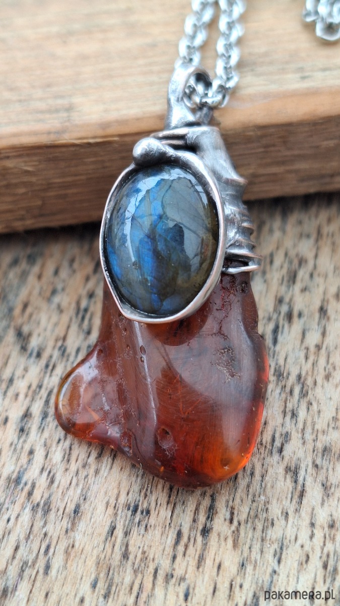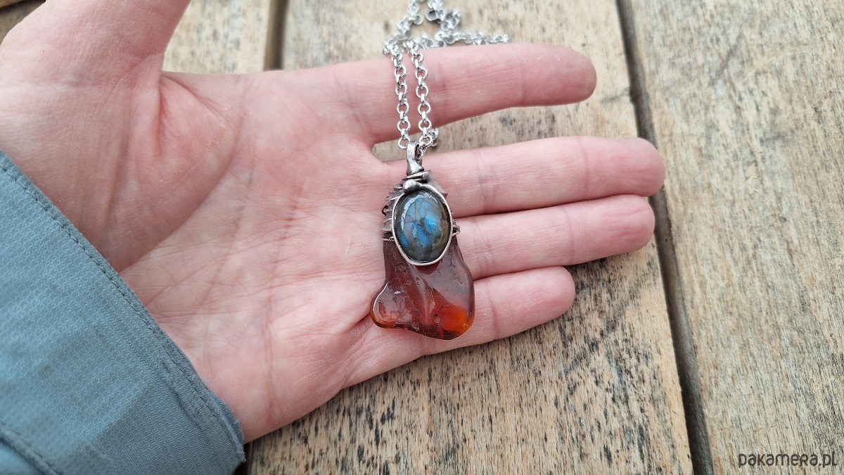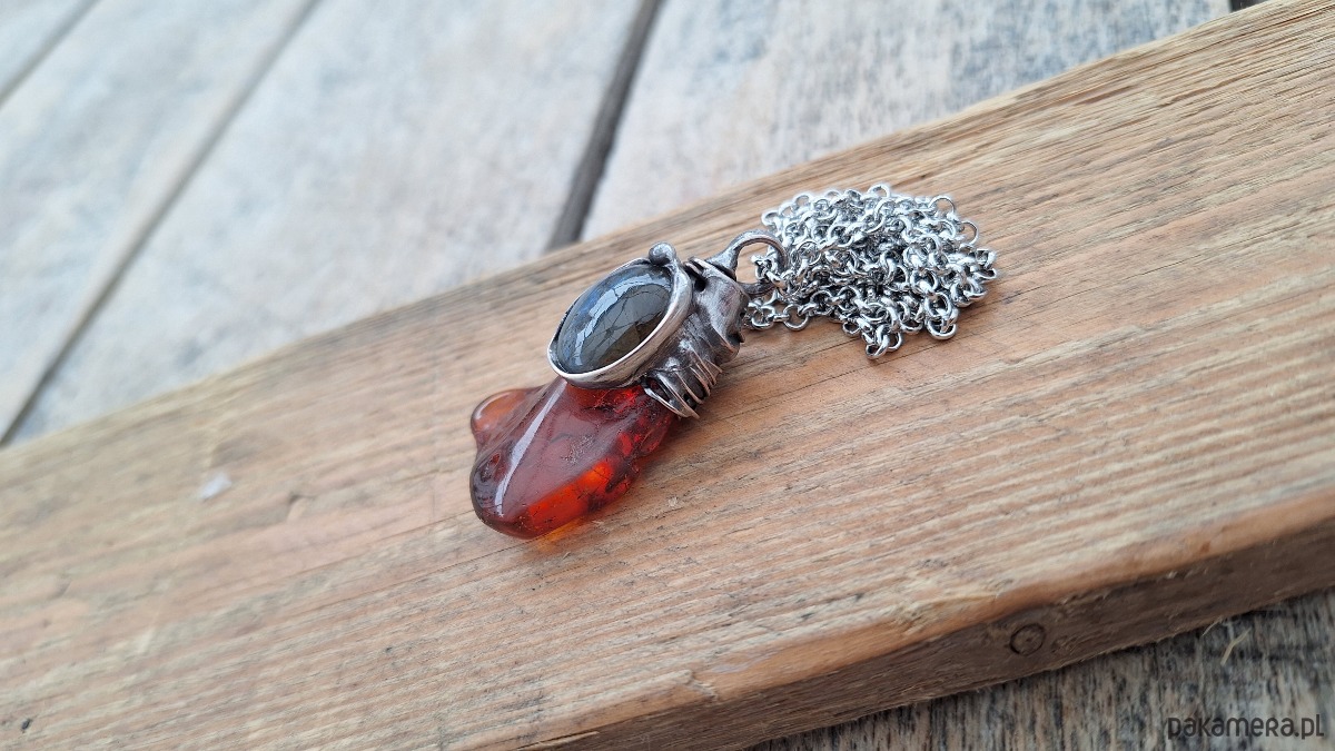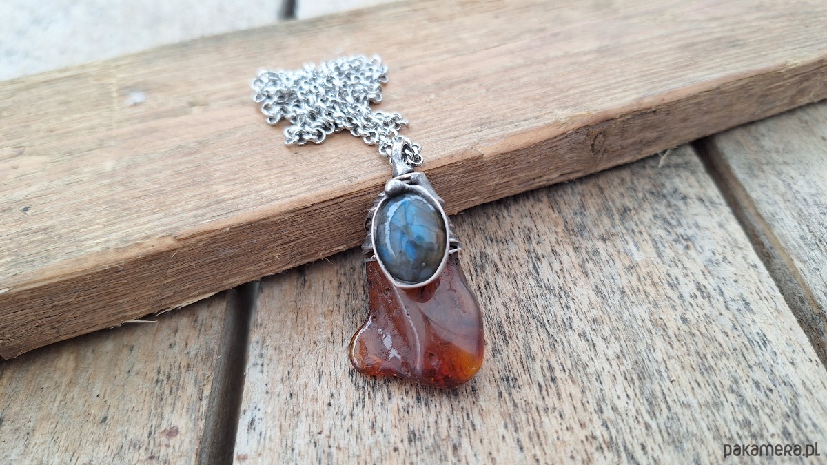 Wisiorek wykonany z miedzi, cyny, bursztynu i labradorytu. Wymiary ok. 4 na 2 cm. Zawieszony na łańcuszku o długości ok. 50 cm.