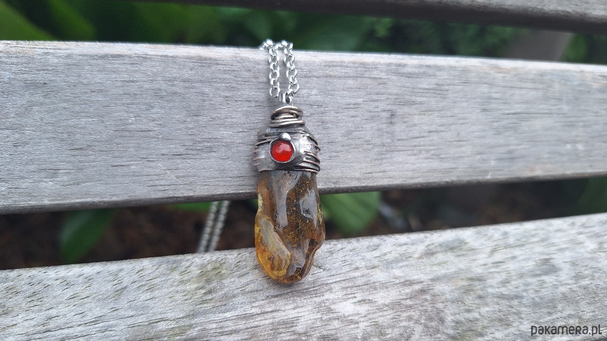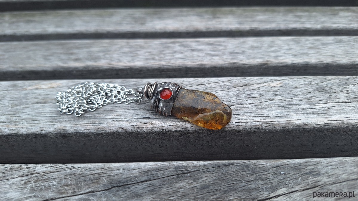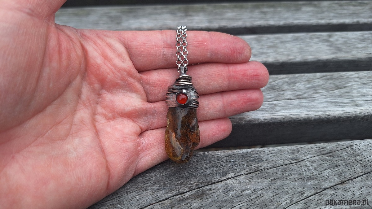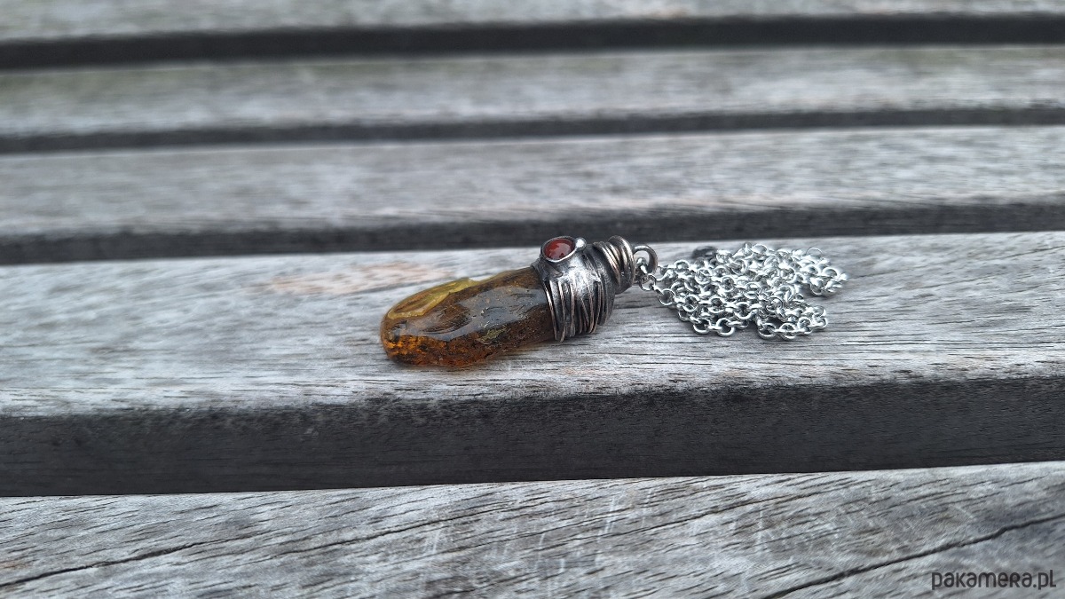 Wisiorek wykonany z miedzi, cyny, bursztynu i agatu. Wymiary ok. 4 na 1.5 cm. Zawieszony na łańcuszku o długości ok. 50 cm.