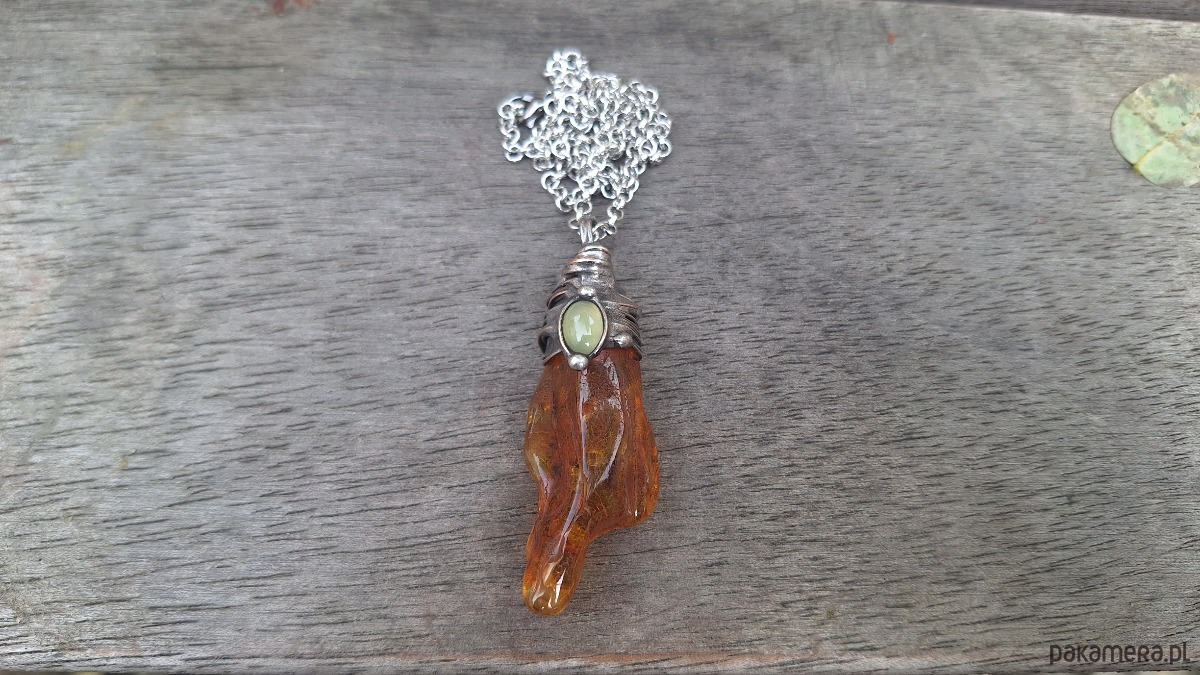 Wisiorek wykonany z miedzi, cyny, bursztynu i agatu. Wymiary ok. 5 na 2 cm. Zawieszony na łańcuszku o długości ok. 50 cm.
