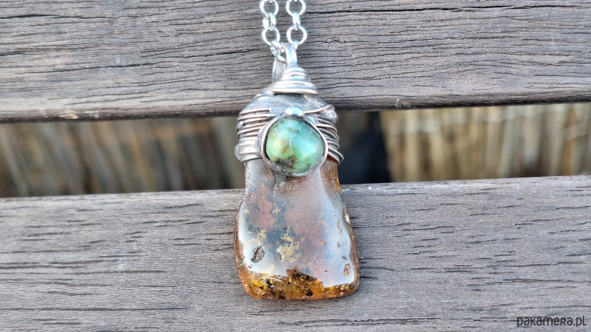 Wisiorek wykonany z miedzi, cyny, bursztynu i chryzoprazu. Wymiary ok. 4 na 2 cm. Zawieszony na łańcuszku o długości ok. 50 cm.