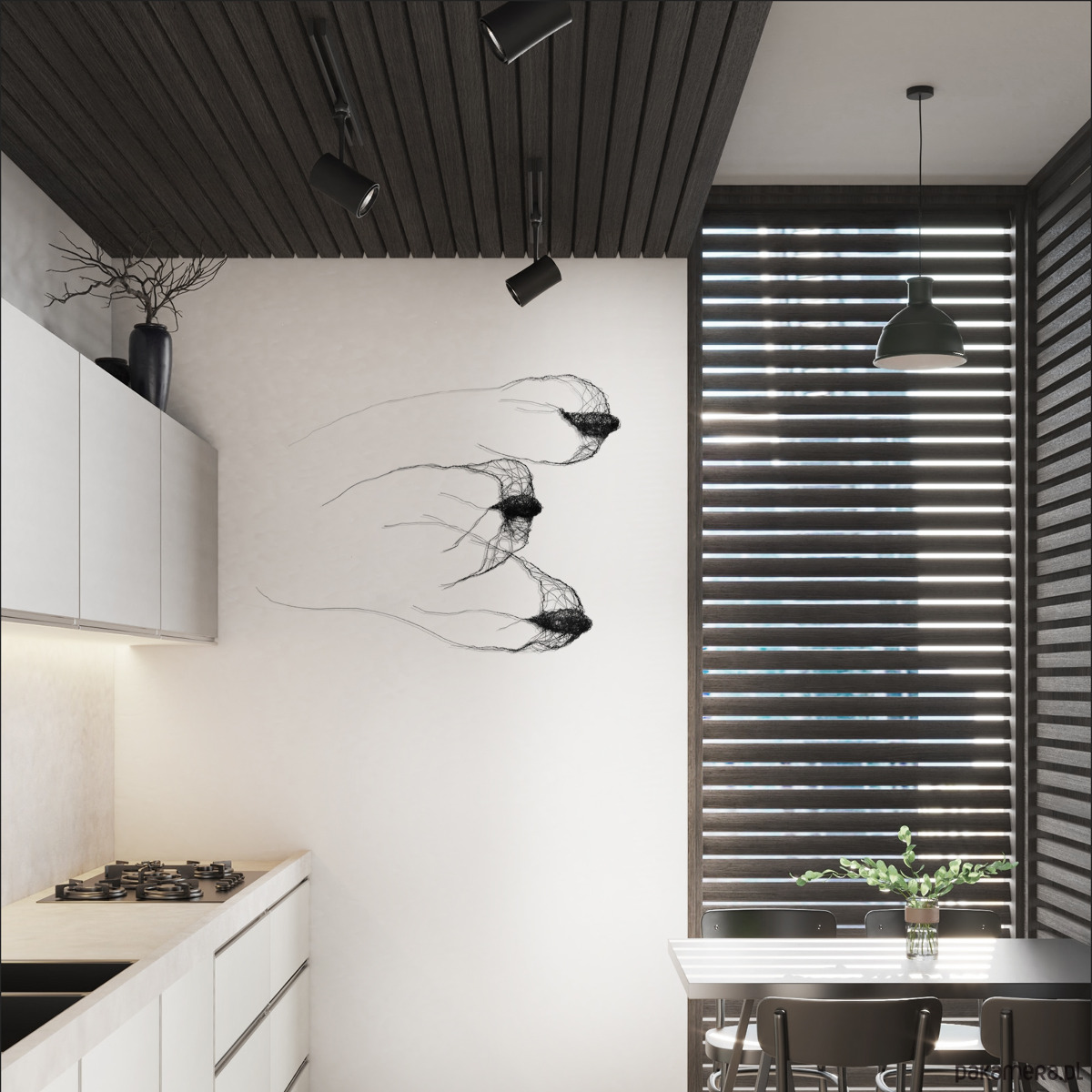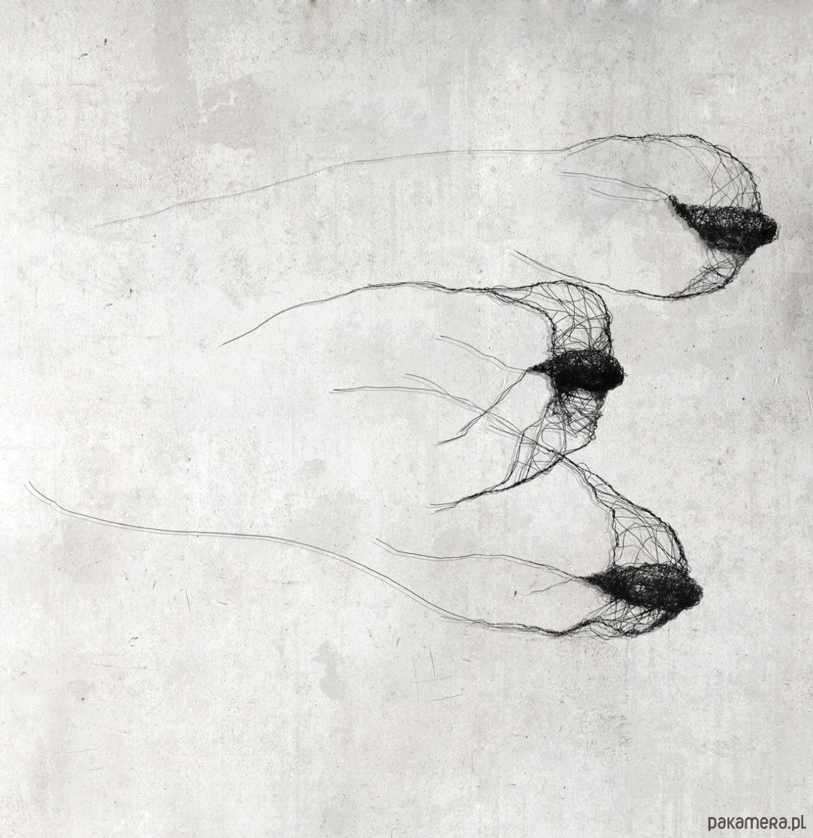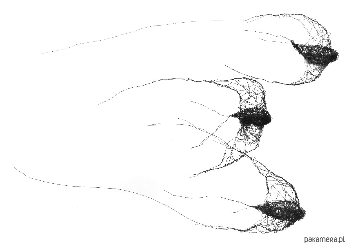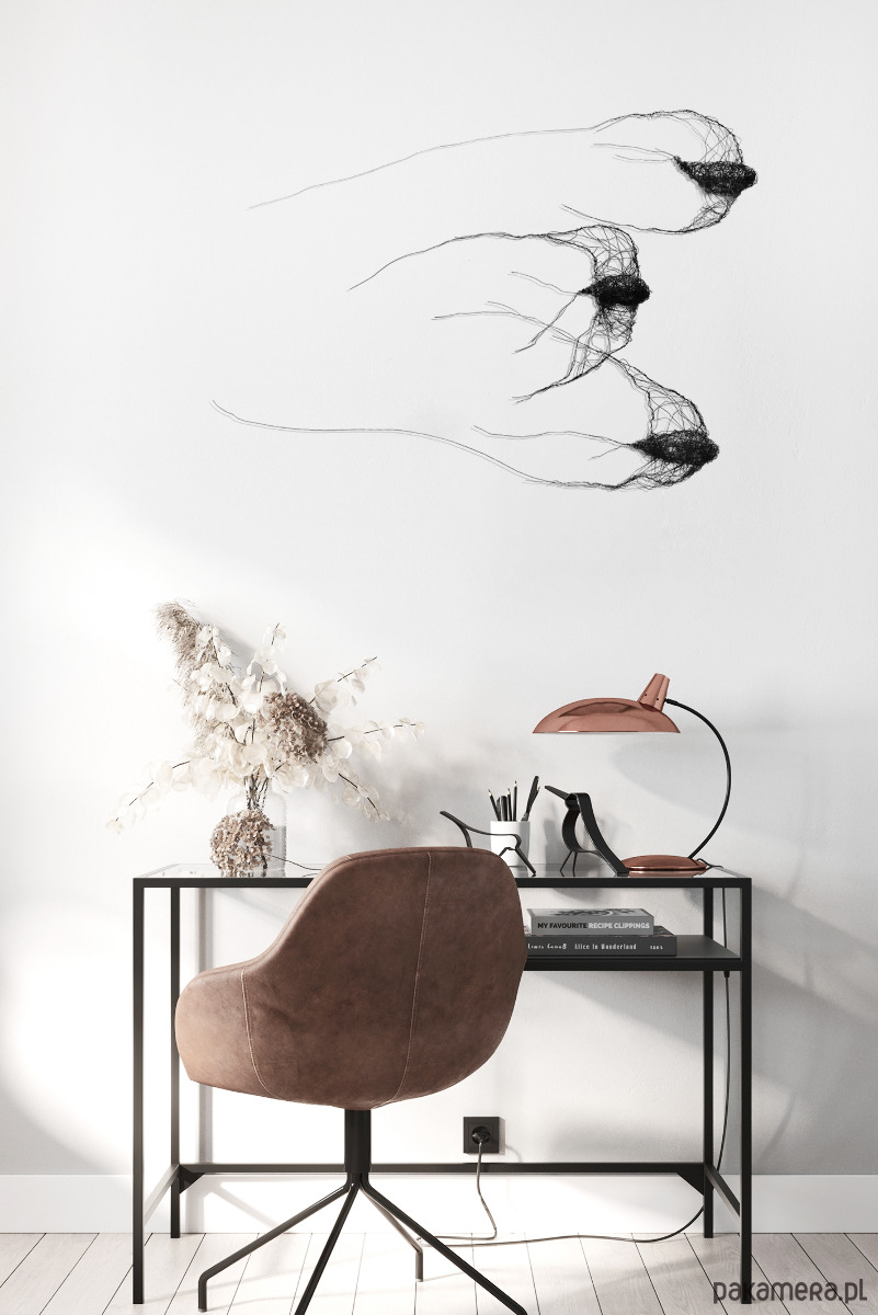 Jaskółki wykonane z drutu tworzą klucz w przestrzeni wnętrza. Ważne jest tworzenie prac z metalu bez tła, co dodaje ekspresji instalacji. Uproszczenie poszerza możliwości interpretacyjne, natomiast redukcja wzmacnia siłę wyrazu.