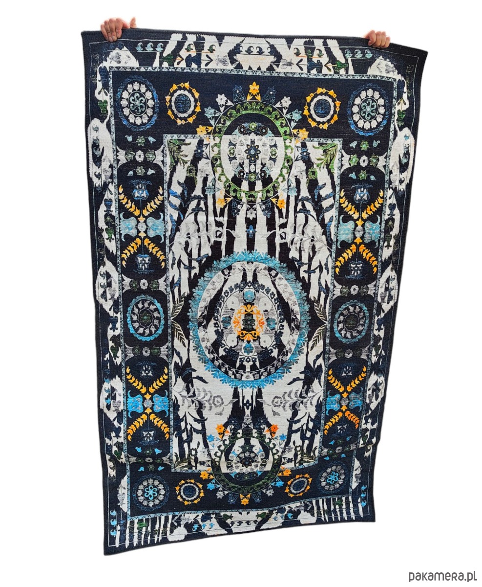 Zanurz się w bogactwie Orientu z naszym wyjątkowym perskim dywanem. Ten ręcznie wykonany kawałek prezentuje urzekającą mieszankę głębokich błękitów, ziemistej zieleni i delikatnych neutralnych kolorów, tworząc bogatą i zapraszającą atmosferę. Intrygujący kwiatowy motyw i centralny medalion zostały starannie utkane, aby zaprezentować kunszt i tradycję perskiego tkactwa. Wykonany z mieszanki wysokiej jakości polipropylenu i bawełny, ten dywan oferuje zarówno trwałość, jak i styl. Idealny, aby dodać odrobinę luksusu do Twojego salonu, jadalni lub sypialni.