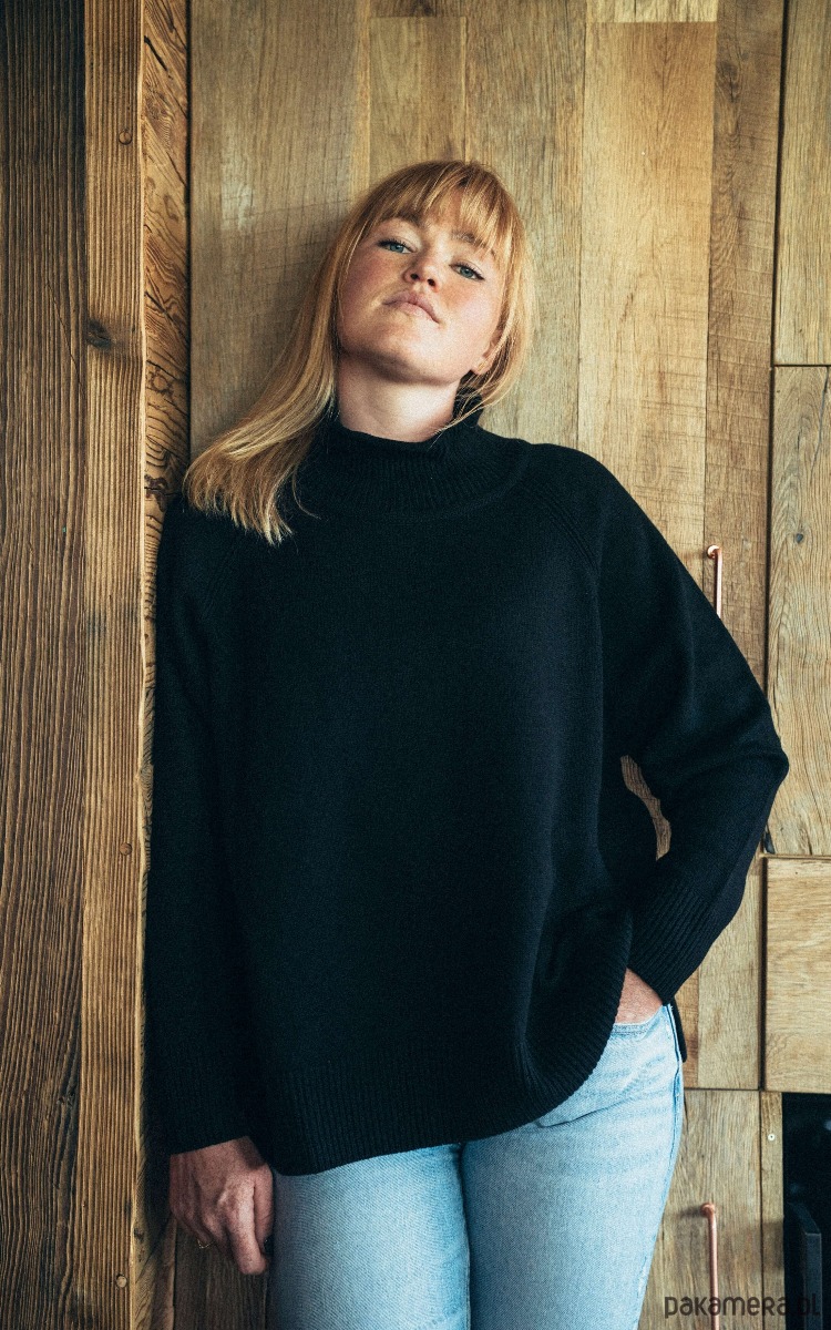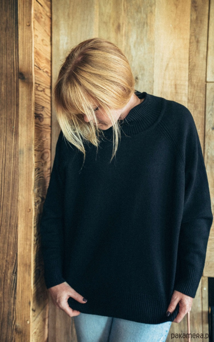 IRBIS Czarny Wełniany Sweter Oversize z Golfem 100% Wełny Merino RWS