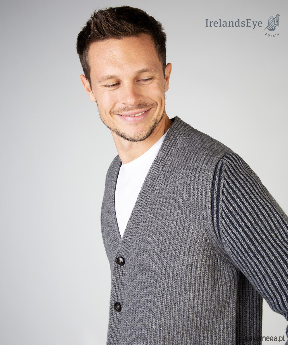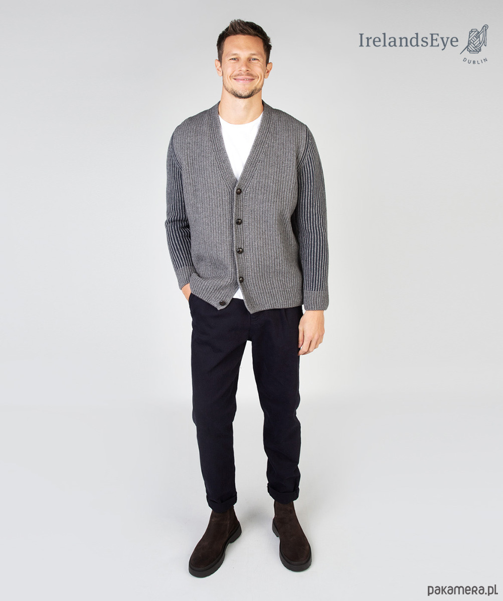Pinstripe Cardigan to minimalistyczny kardigan o swobodnym kroju, zapinany na guziki i z dekoltem w kształcie litery V, ze ściągaczowymi detalami w dwóch odcieniach. Sweter z miękkiej wełny jagnięcej 55% oraz bawełny organicznej 45%