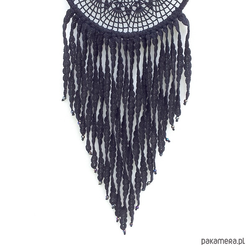 Czarny łapacz snów Isabel powstał z zaprojektowanej przeze mnie serwetki. Ozdobiłam go szydełkowymi koronkami i szklanymi koralikami. Wszystkie elementy łapacza stworzyłam ręcznie z dbałością o najdrobniejszy szczegół.