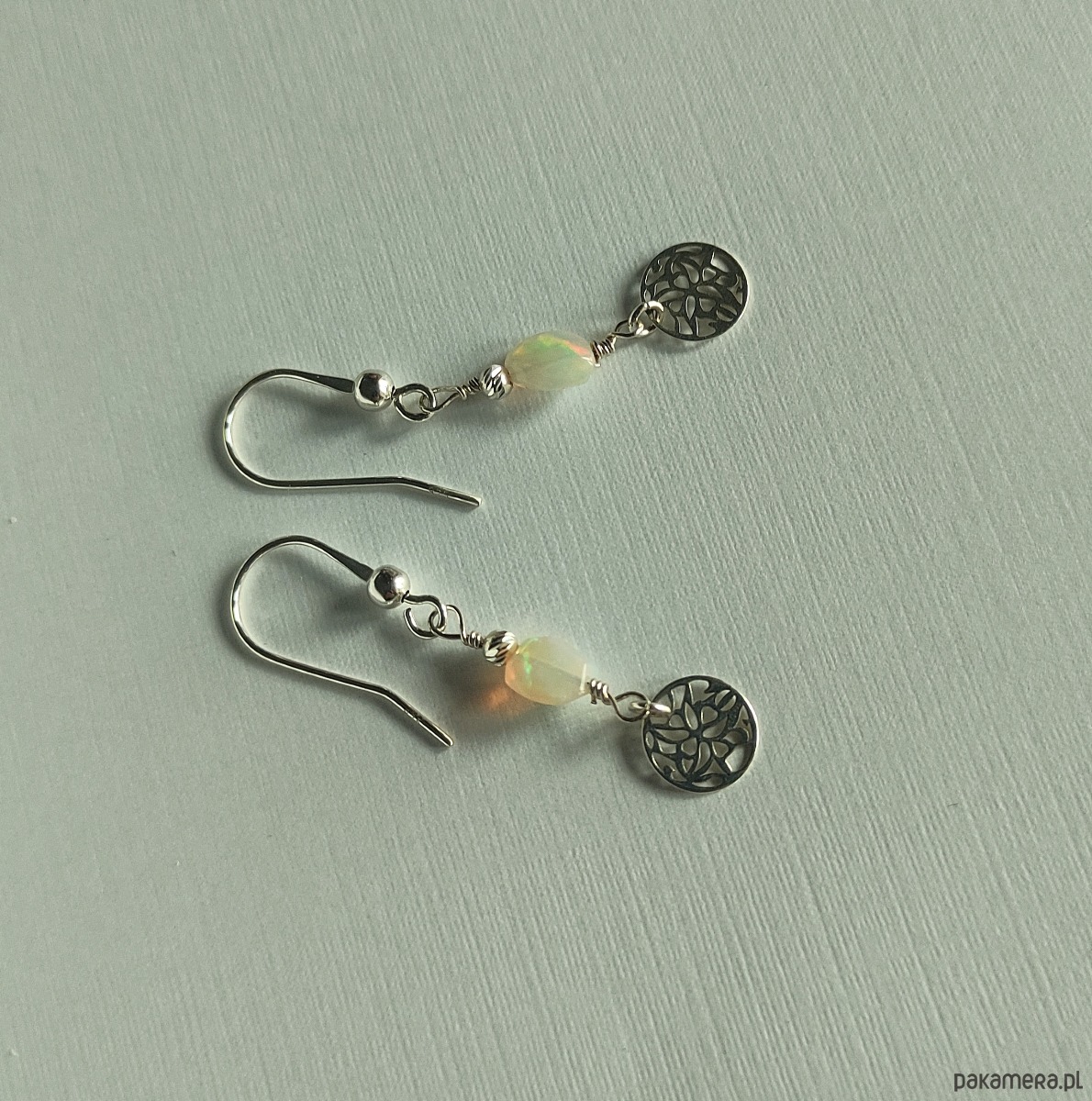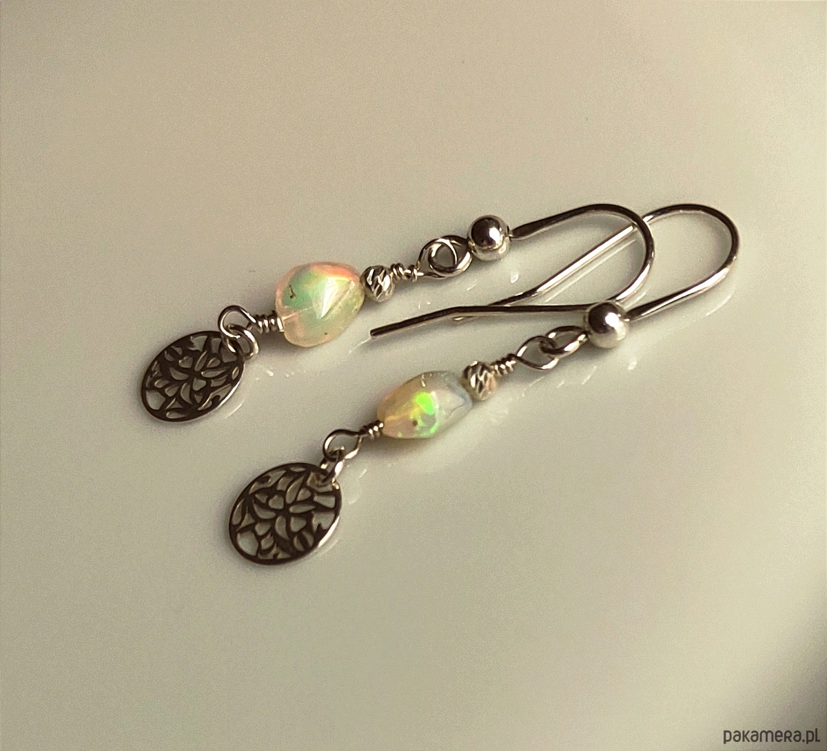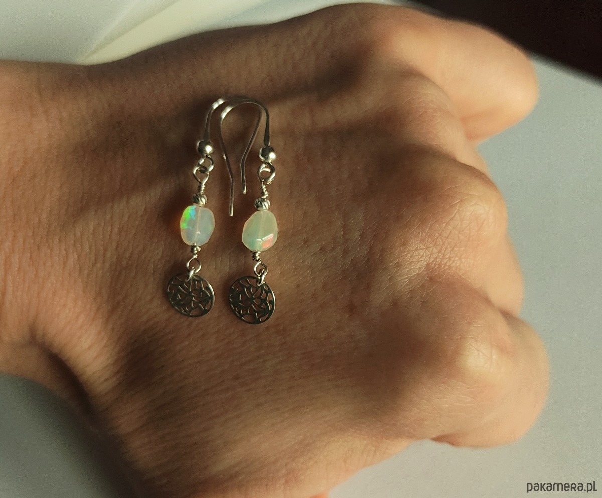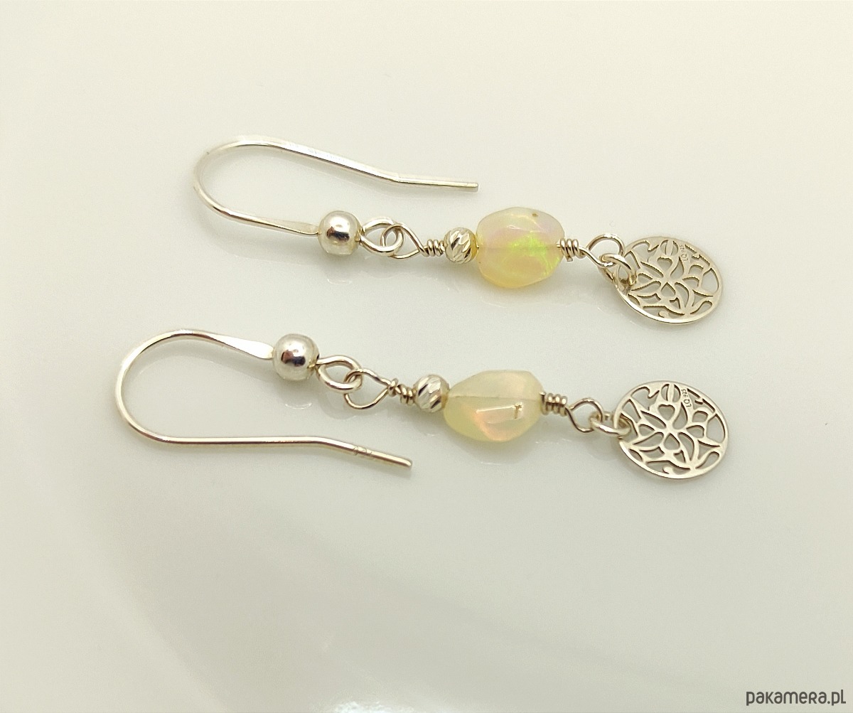 Delikatne kolczyki z urzekającym opalem etiopskim. Kamienie ukazują refleksy zmieniające się pod wpływem światła. Dominują barwy zielona i czerwona (głównie w naturalnym świetle), można też dojrzeć kolory niebieskie i żółte. Kolczyki zostały zawieszone na otwartym biglu i są wykończone ażurowym kółeczkiem.