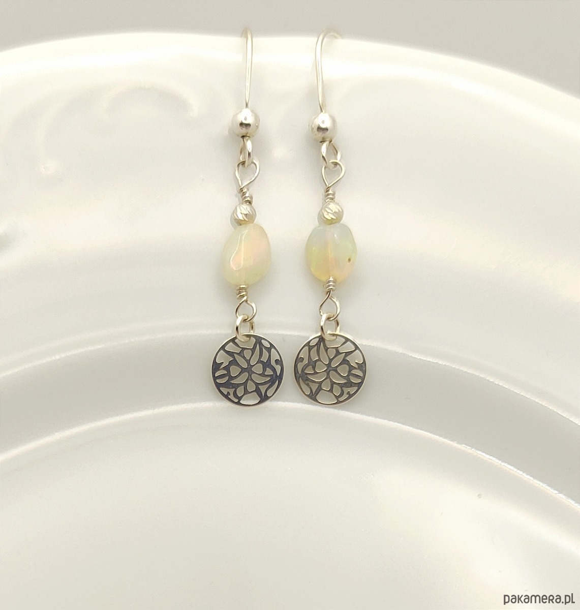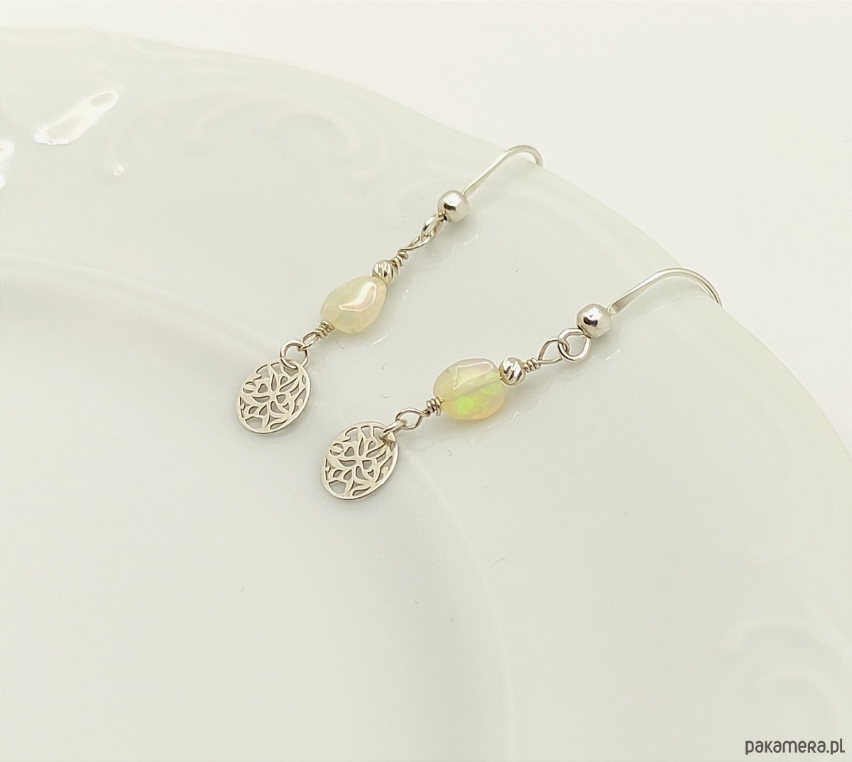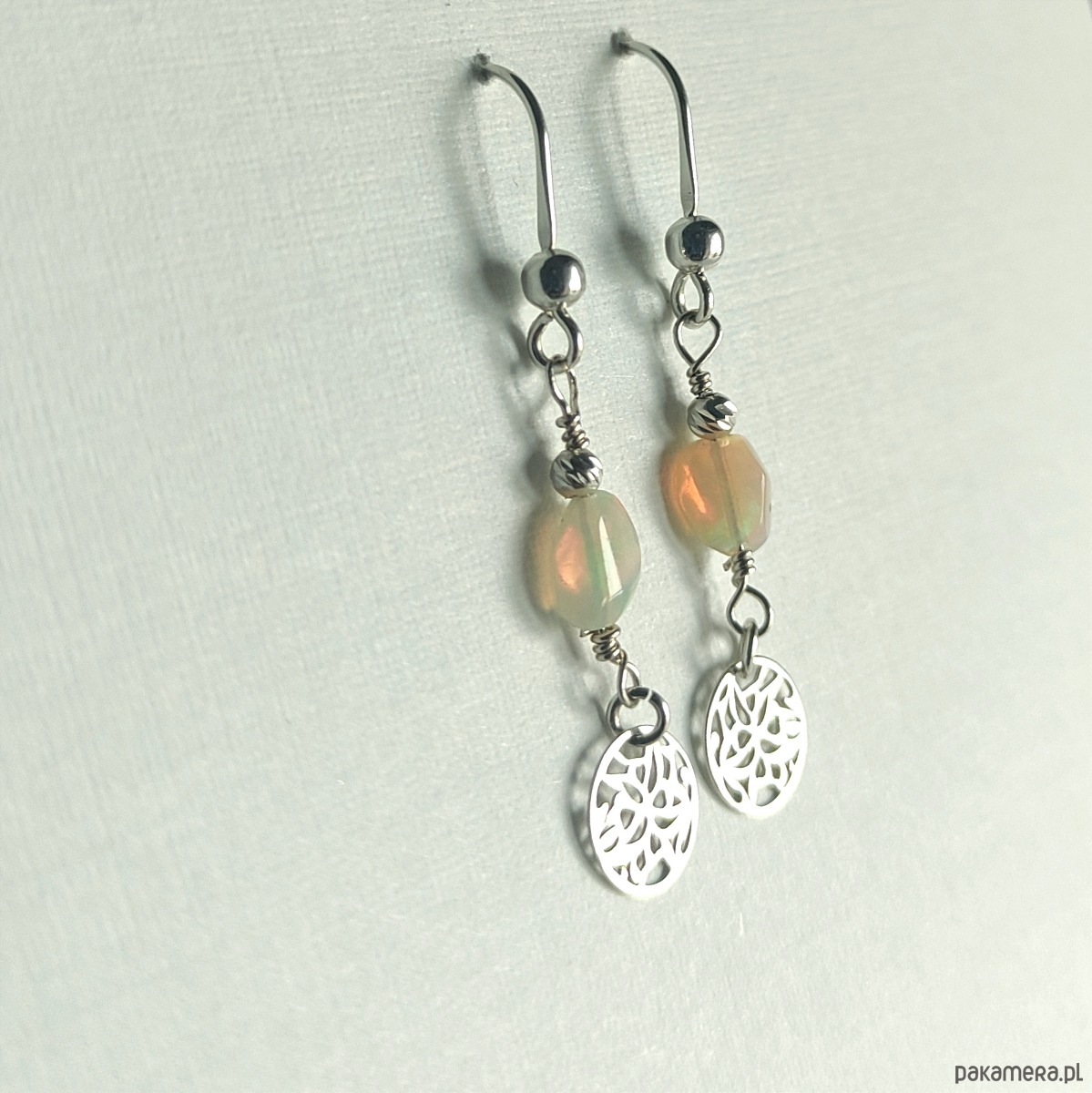 Delikatne kolczyki z urzekającym opalem etiopskim. Kamienie ukazują refleksy zmieniające się pod wpływem światła. Dominują barwy zielona i czerwona (głównie w naturalnym świetle), można też dojrzeć kolory niebieskie i żółte. Kolczyki zostały zawieszone na otwartym biglu i są wykończone ażurowym kółeczkiem.