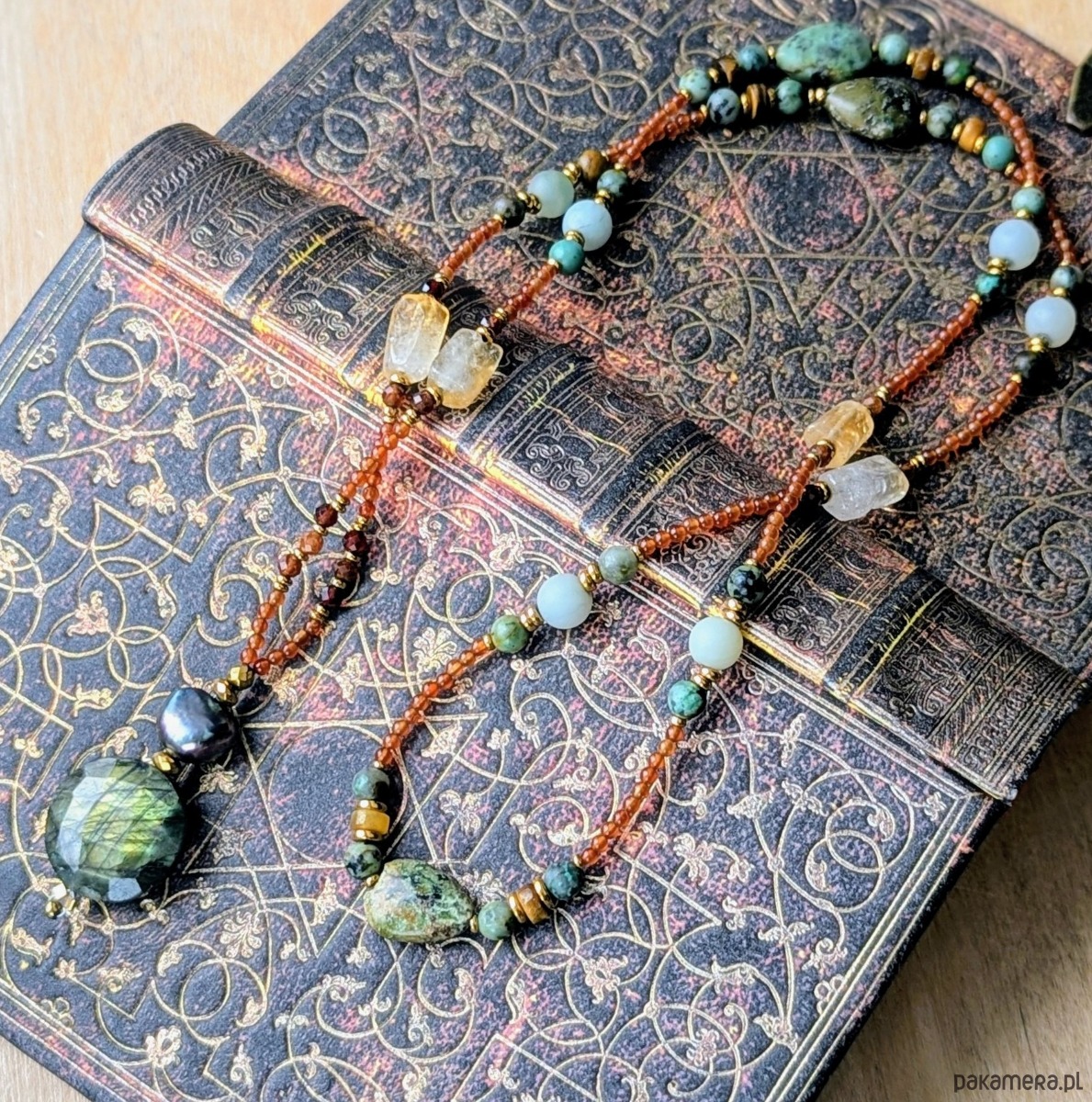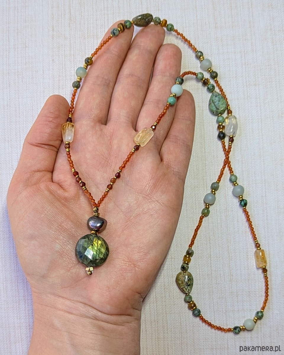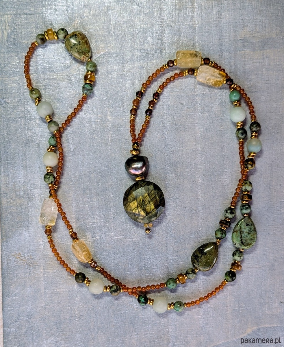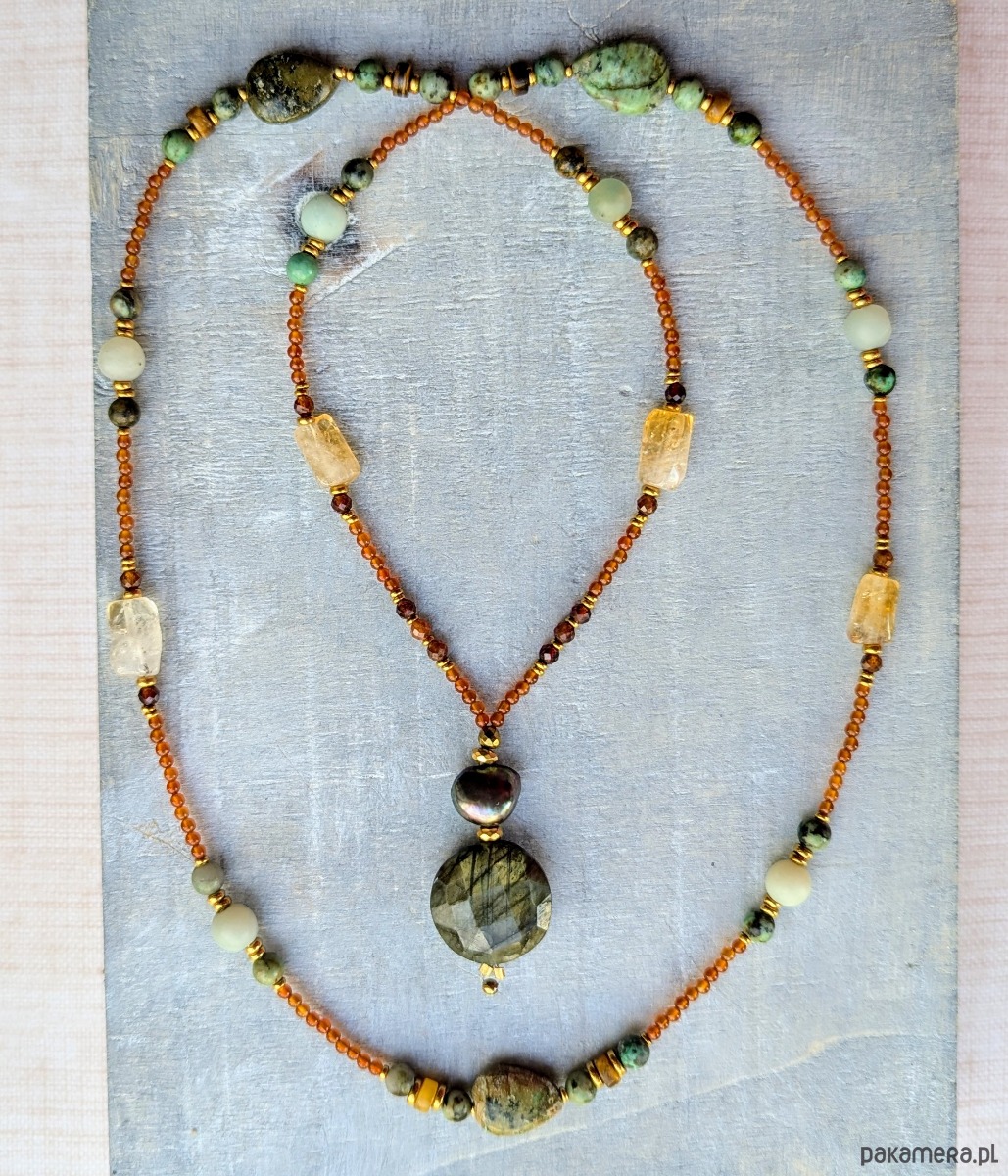Barwny, symetryczny i energetyczny naszyjnik. Na sznurze znajdziesz turkus afrykański, ognisty karneol i granat hessonit, spokojny amazonit oraz słoneczny cytryn i tygrysie oko.