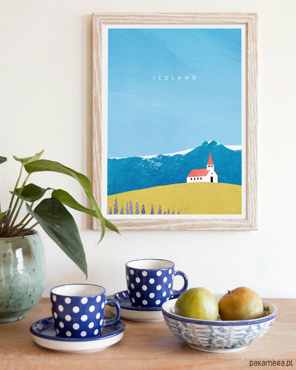 Północne regiony kojarzą się zwykle z surowym pięknem krajobrazu. Jednak w letnich miesiącach sytuacja całkowicie się odmienia i wszędzie gdzie okiem sięgnąć króluje zieleń i dzikie kwiaty. Plakat „Islandia - kościół Reyniskirkja z czerwonym dachem” przyłapuje wyspę w takim właśnie momencie letniej beztroski. Grafika idealnie sprawdzi się jako dekoracja domu wszystkich zakochanych w odkrywaniu północnych rubieży świata.