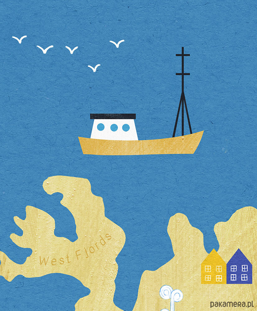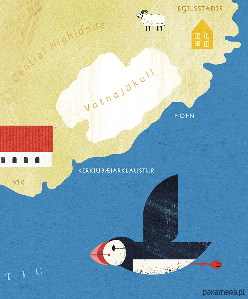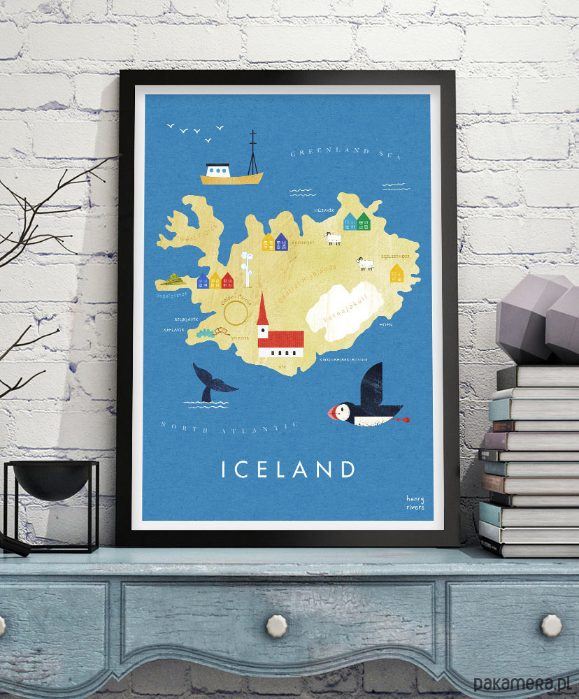 Plakat Islandia - mapa graficzna z wielorybami, pięknymi maskonurami, kolorowymi domkami i niesamowitymi gejzerami. Wszystkie te punkty zaznaczone zostały na naszym plakacie - mapie z obrysem tej niezwykłej wyspy. Plakat świetnie sprawdzi się w pokoju każdego podróżnika, niezależnie od wieku.