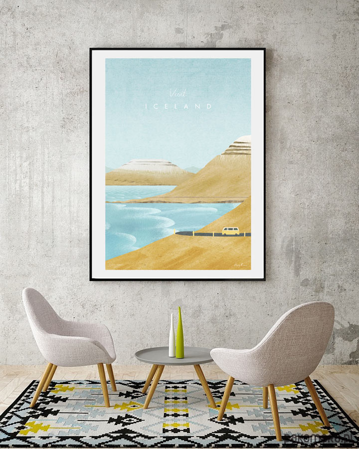 Plakat w stylu vintage przedstawiający panoramę islandzkiego wybrzeża z perspektywy obiegającej wyspę głównej Drogi 1 (Hringvegur). Inspirowany plakatami podróżniczymi z lat 20-tych XX wieku.