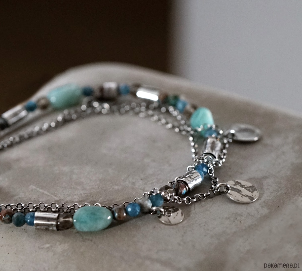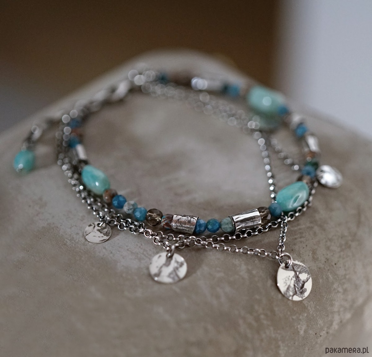 Bransoletka wykonana ze srebra i kamieni naturalnych: amazonitów, apatytów, jaspisów i kwarców.