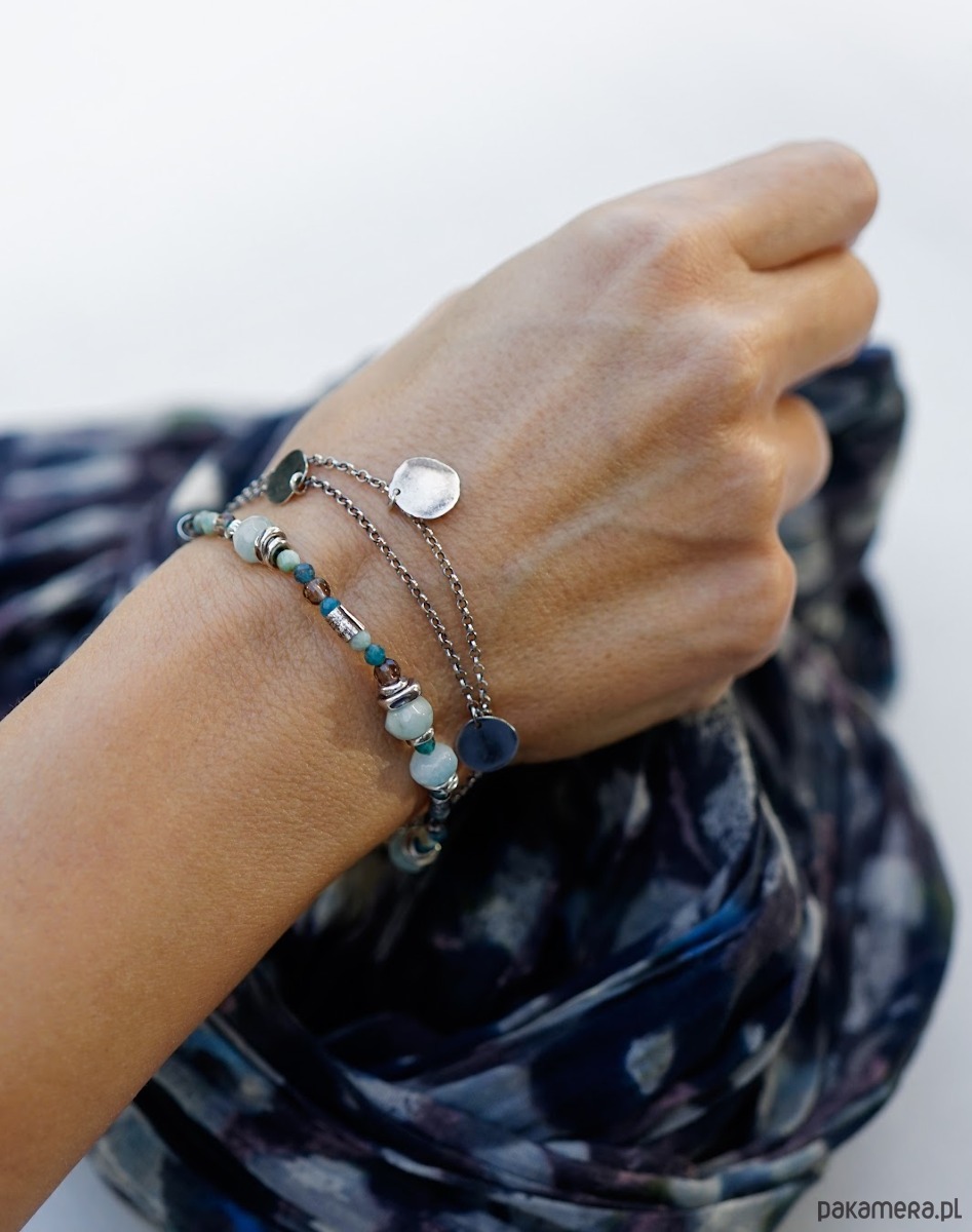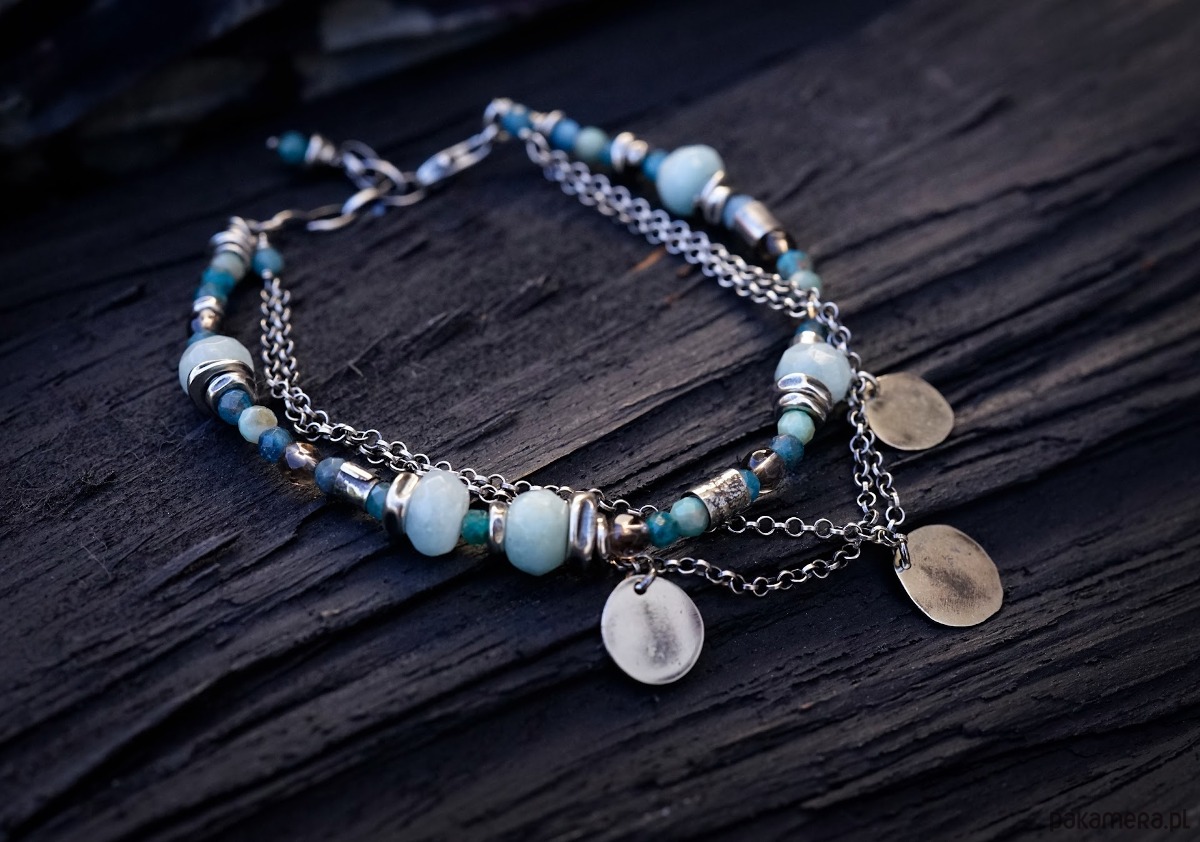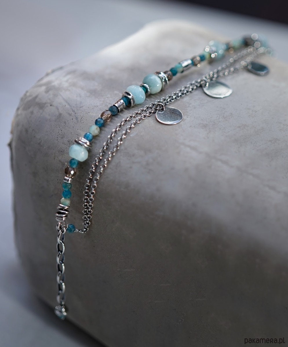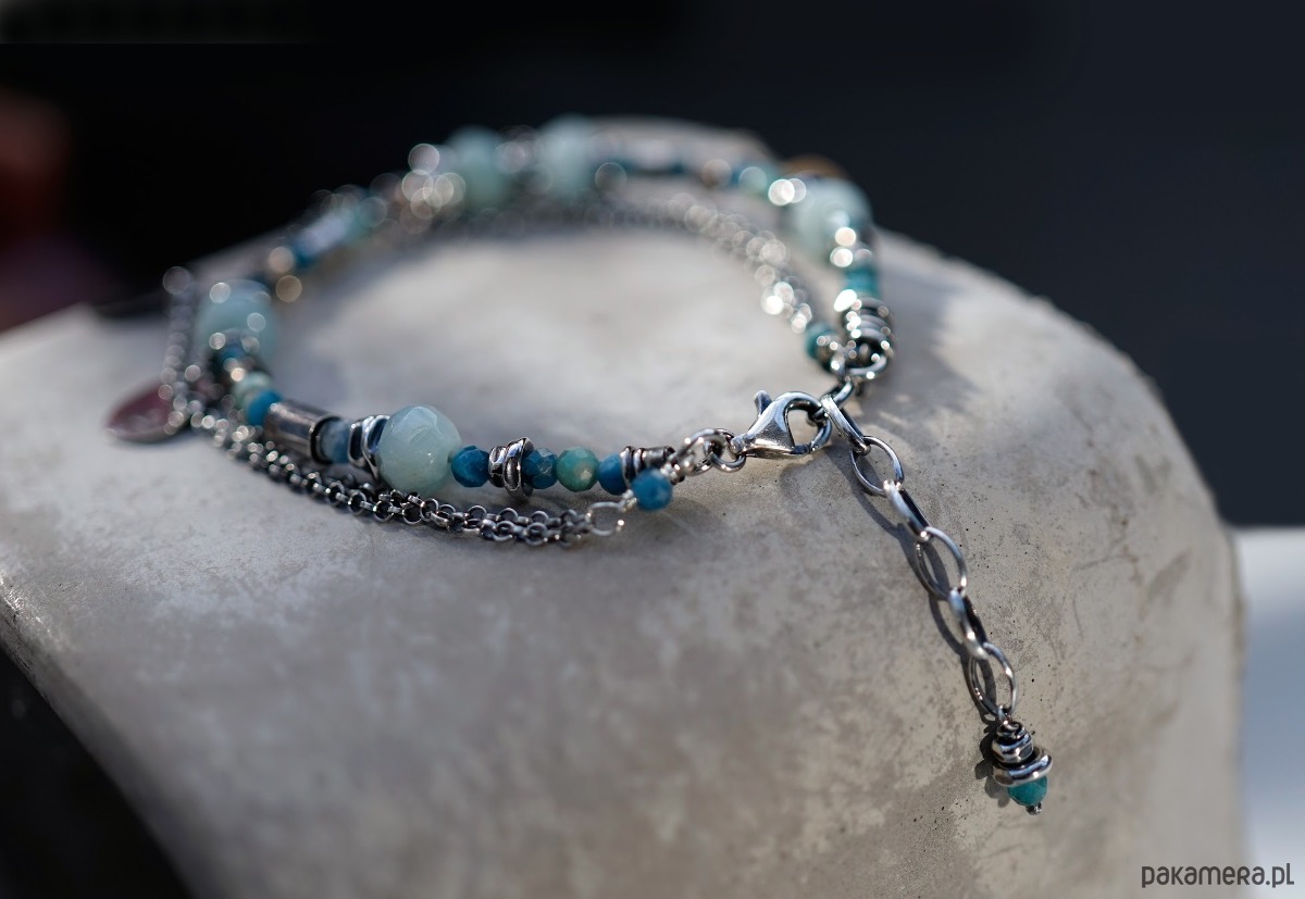 Bransoletka wykonana ze srebra i kamieni naturalnych: akwamarynów, amazonitów, apatytów i kwarców dymnych.
