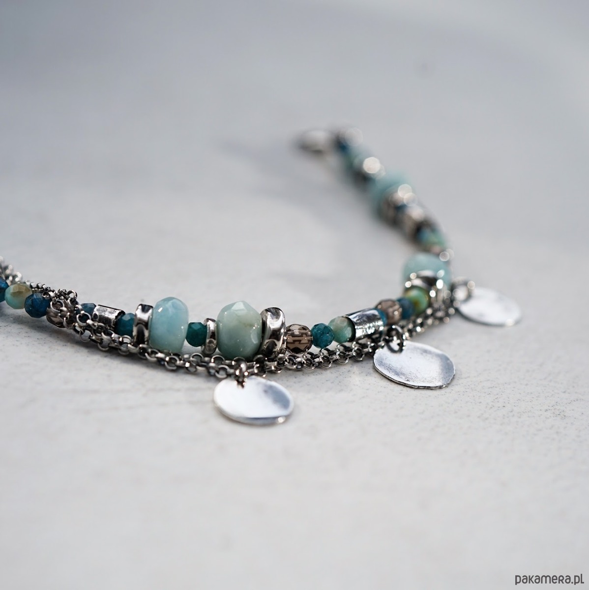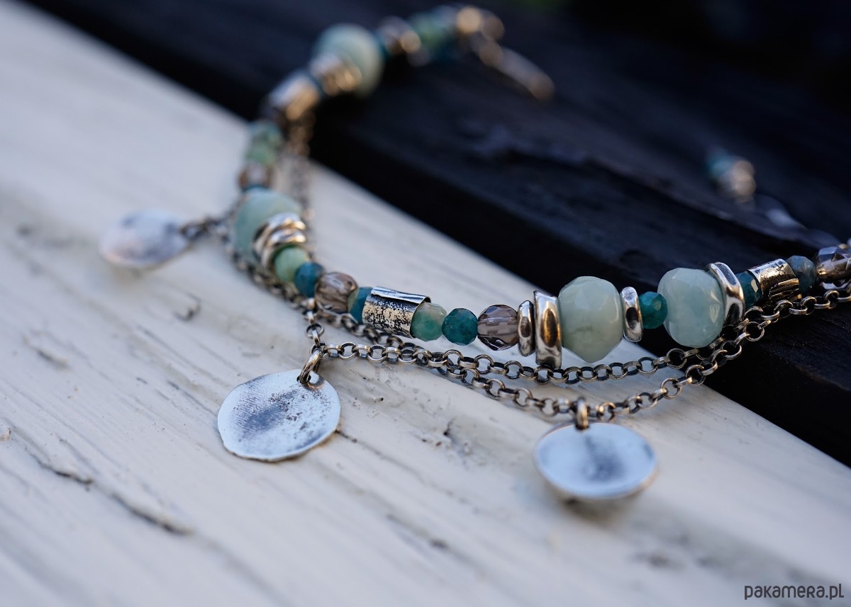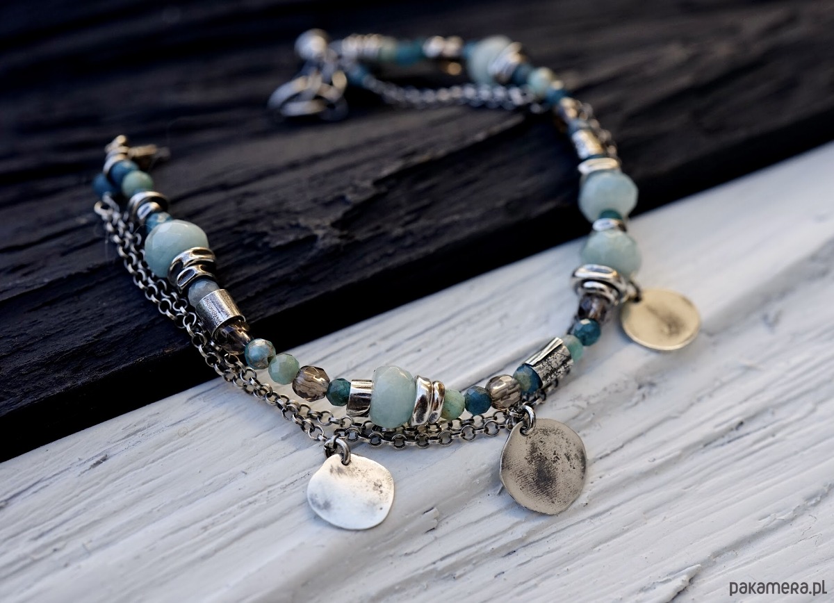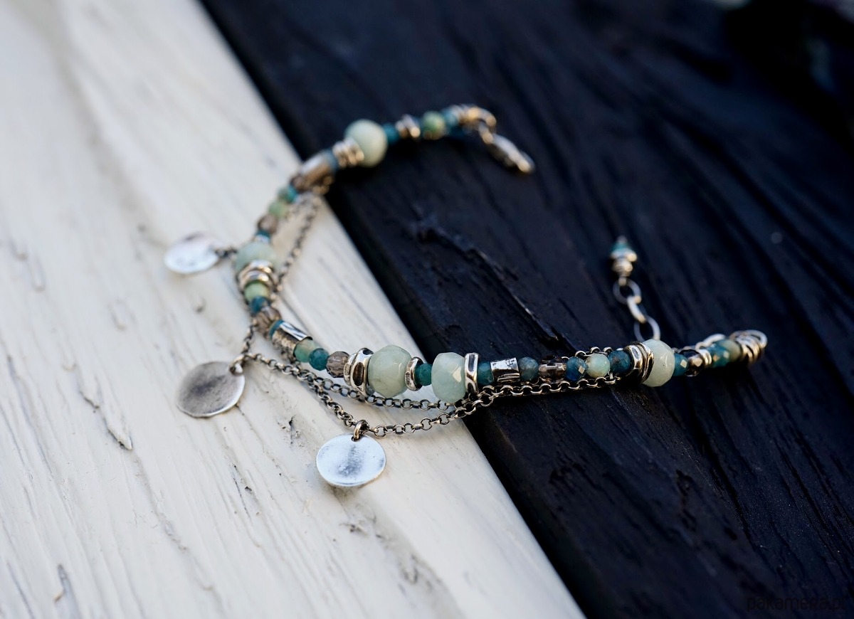 Bransoletka wykonana ze srebra i kamieni naturalnych: akwamarynów, amazonitów, apatytów i kwarców dymnych.