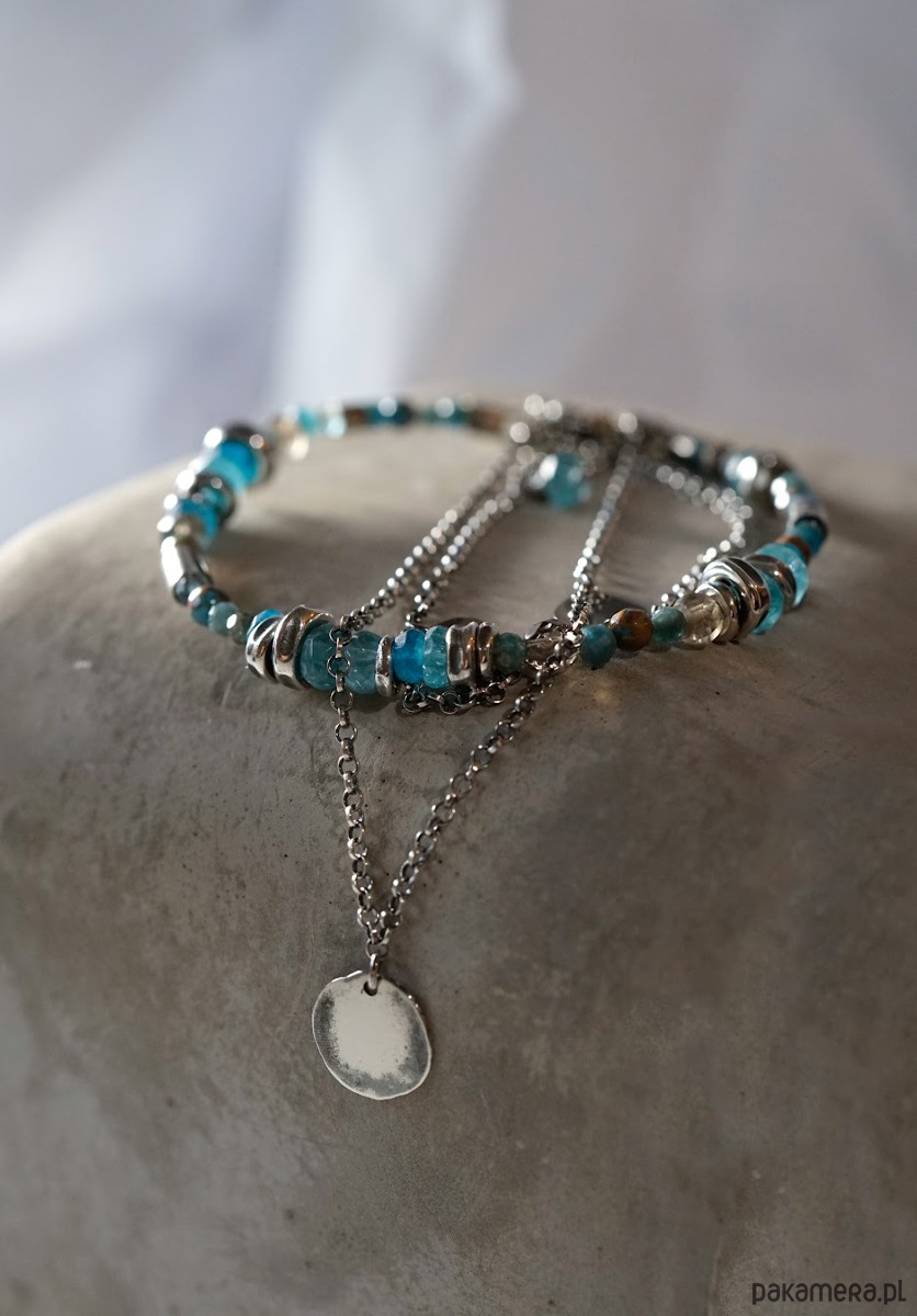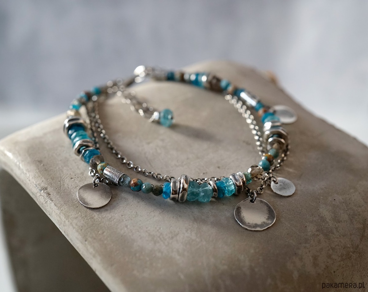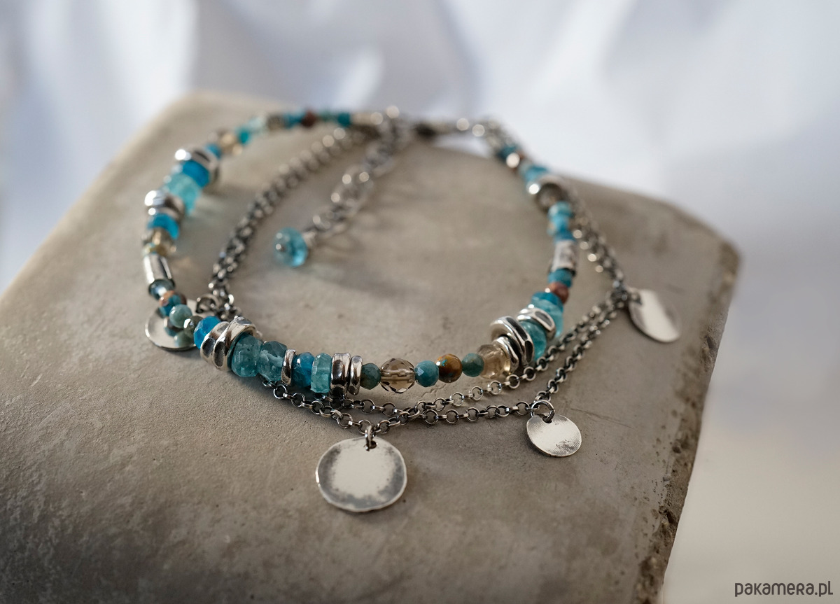 Bransoletka wykonana ze srebra i kamieni naturalnych: apatytów, jaspisów i kwarców dymnych.