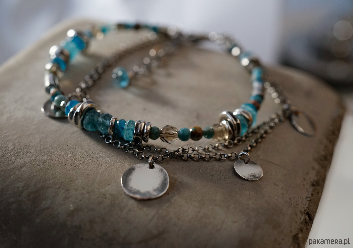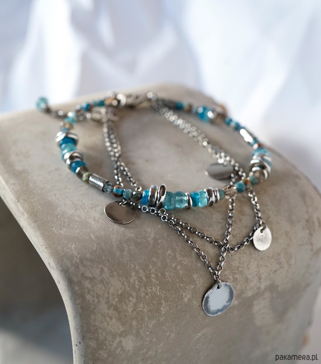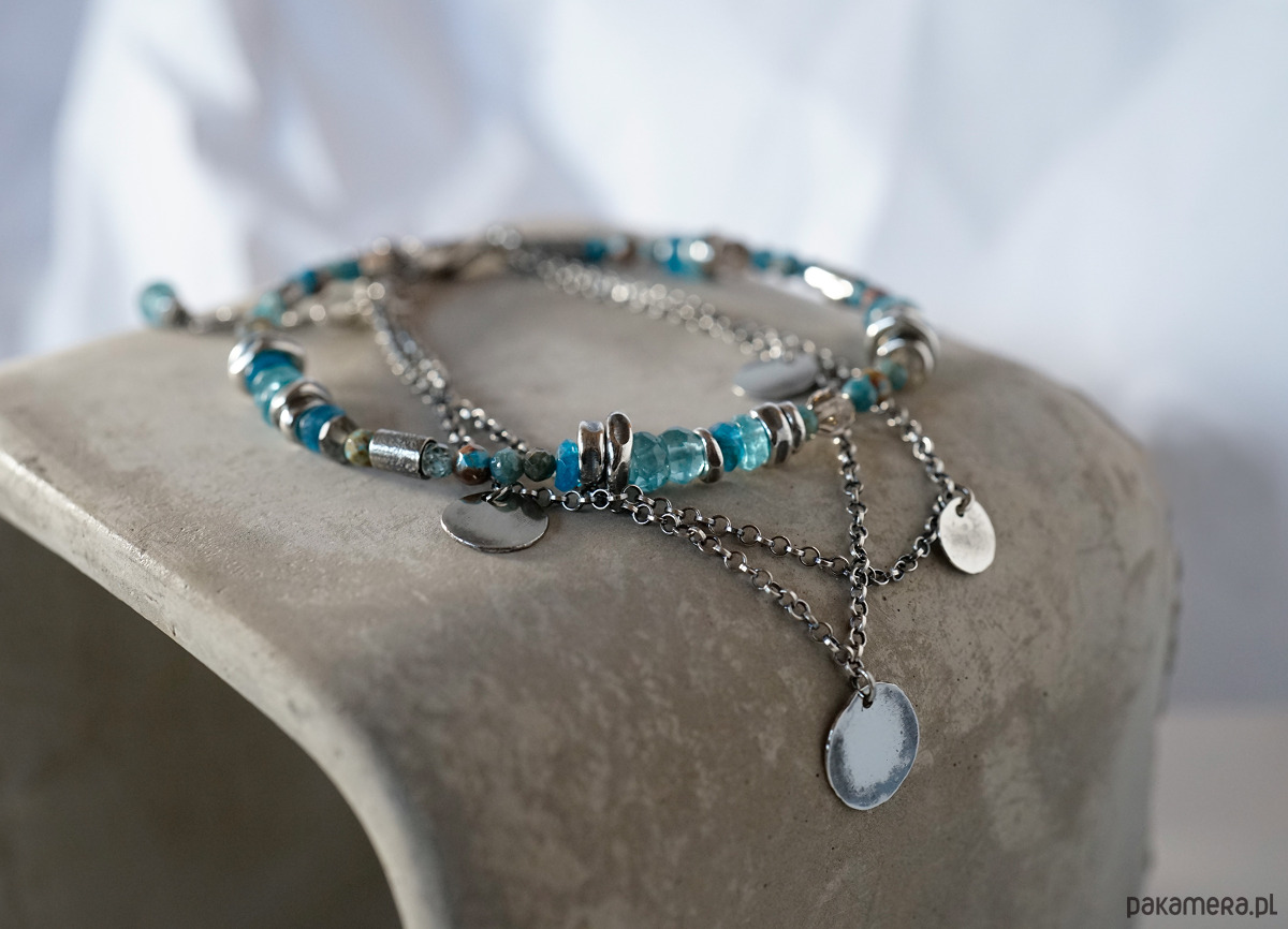 Bransoletka wykonana ze srebra i kamieni naturalnych: apatytów, jaspisów i kwarców dymnych.