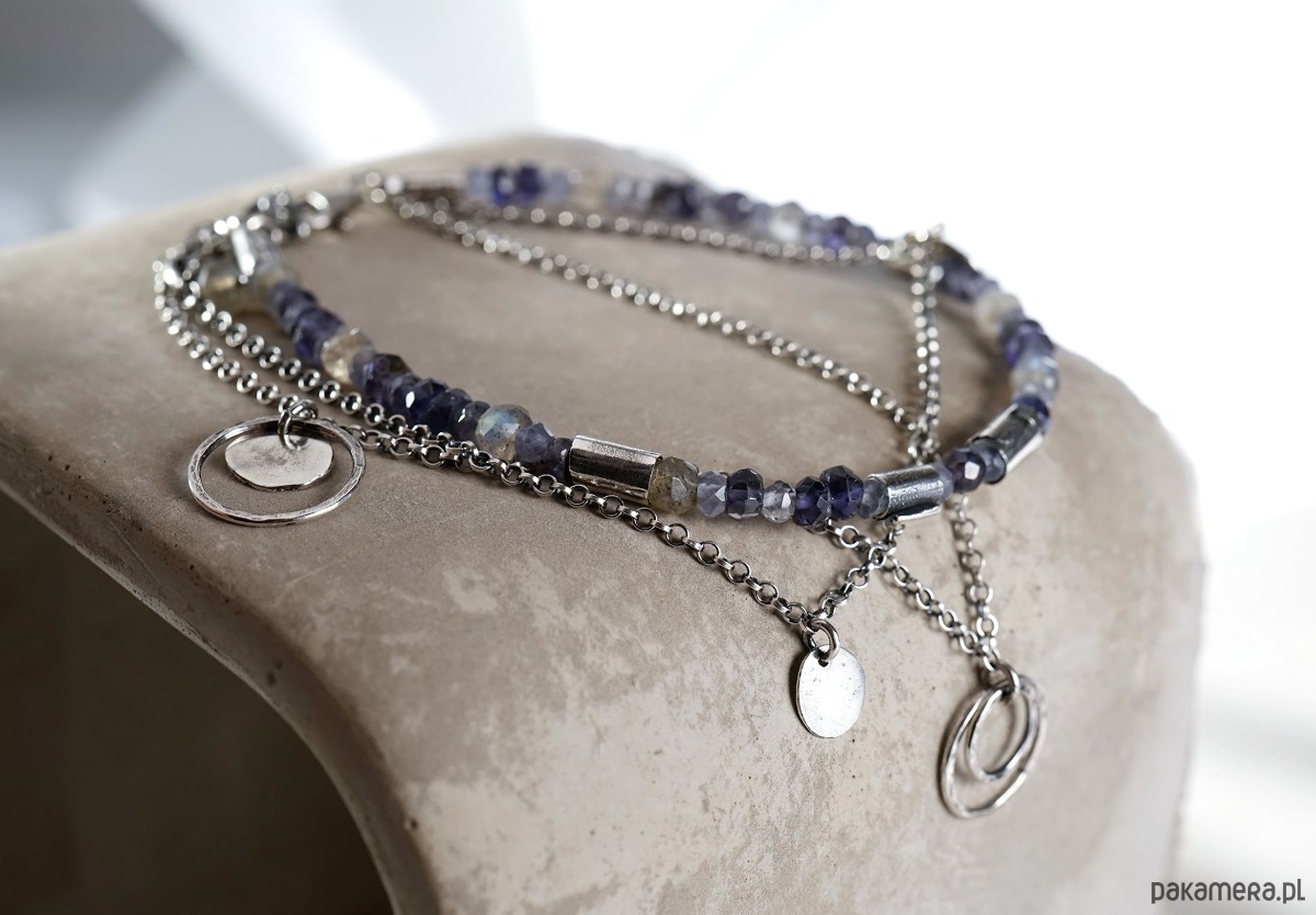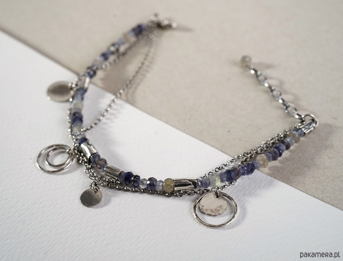 Bransoletka wykonana ze srebra i kamieni naturalnych: iolitów i labradorytów.