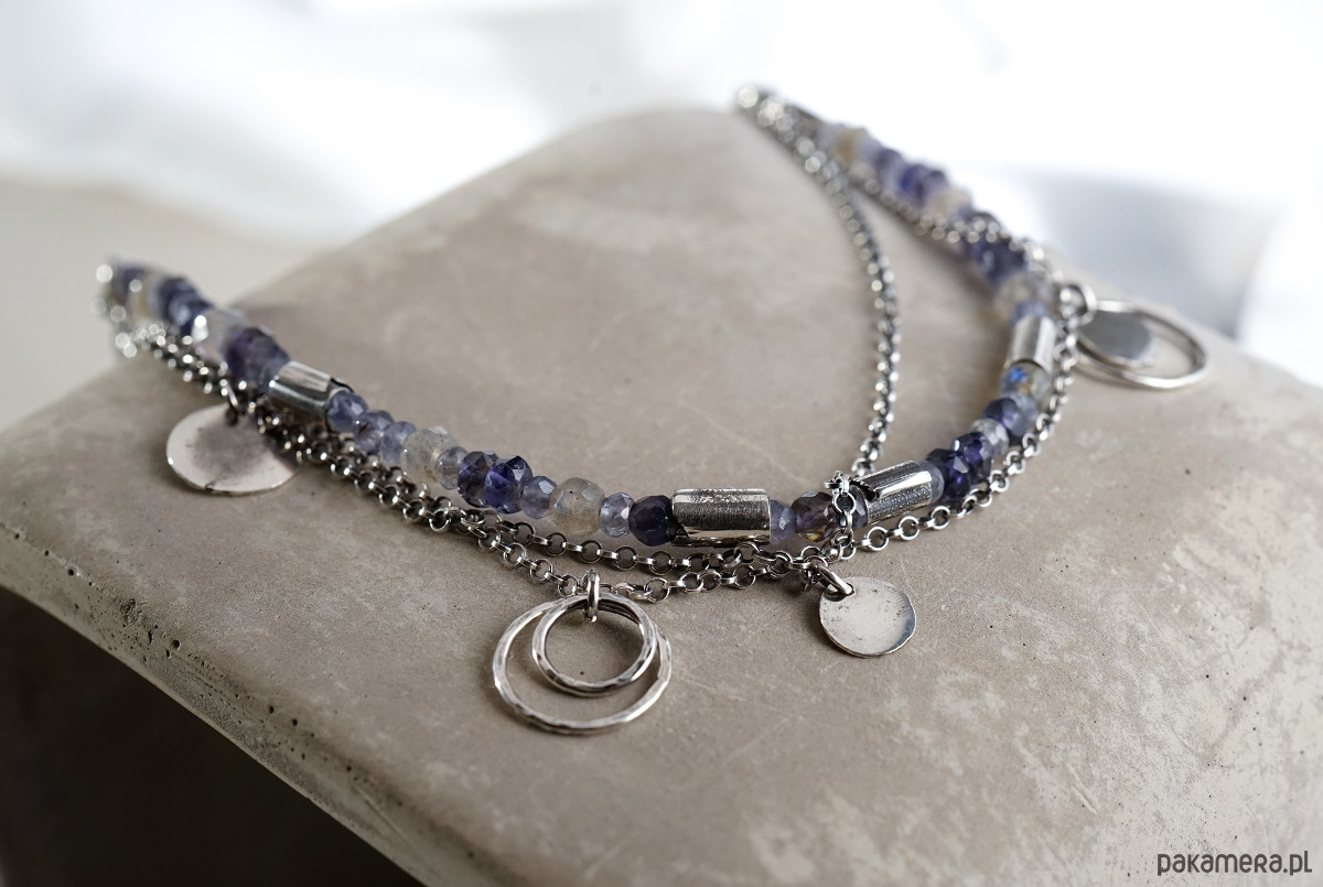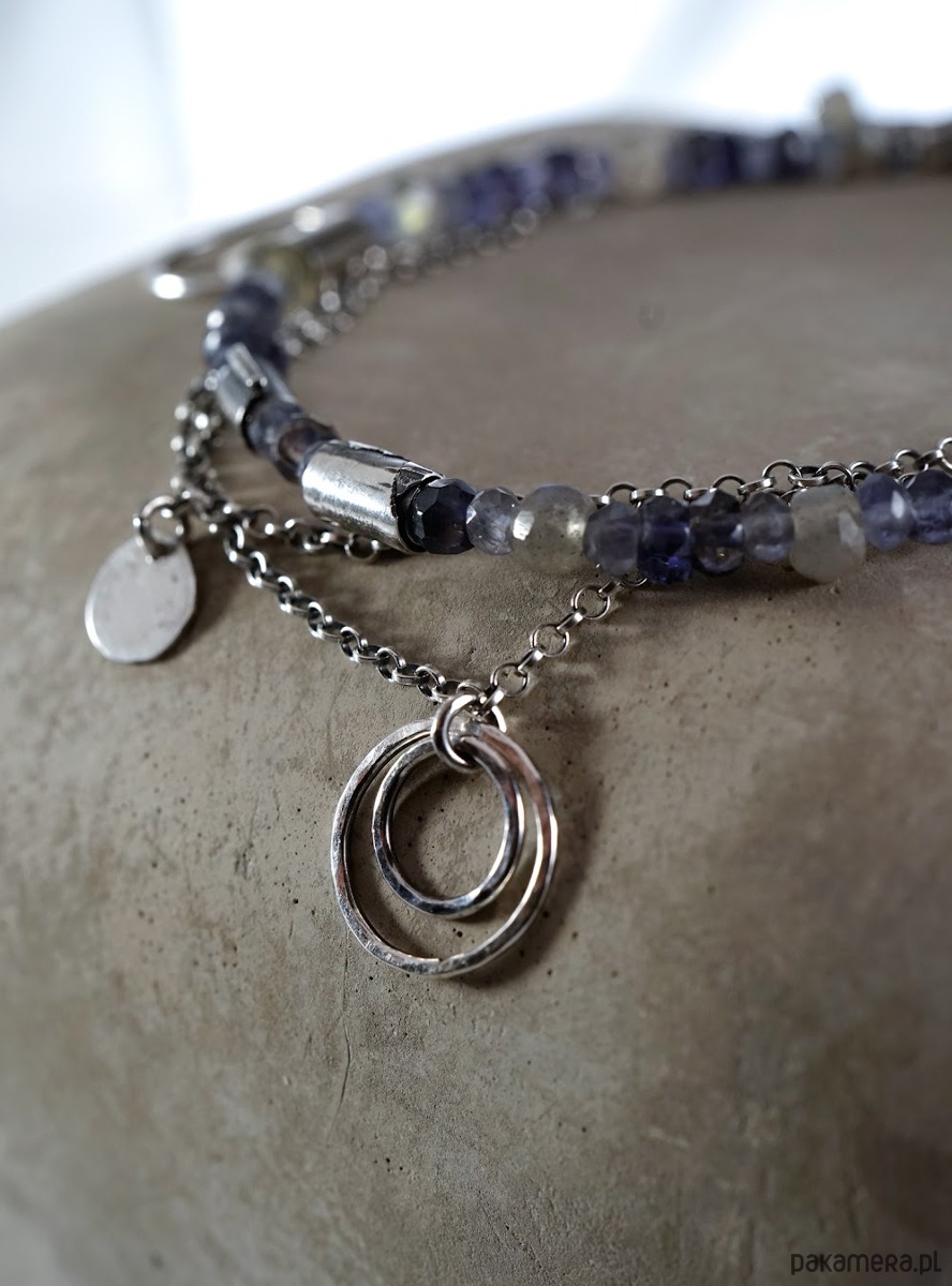 Bransoletka wykonana ze srebra i kamieni naturalnych: iolitów i labradorytów.