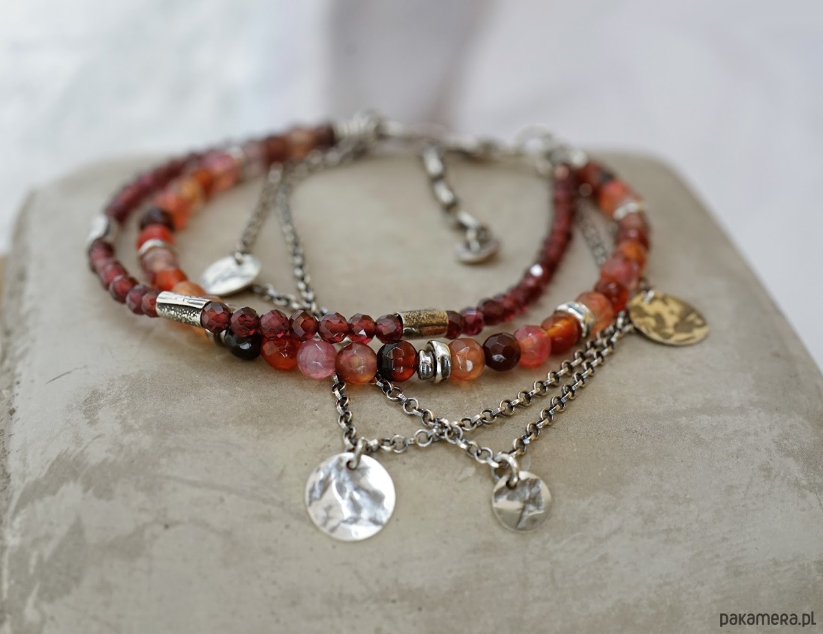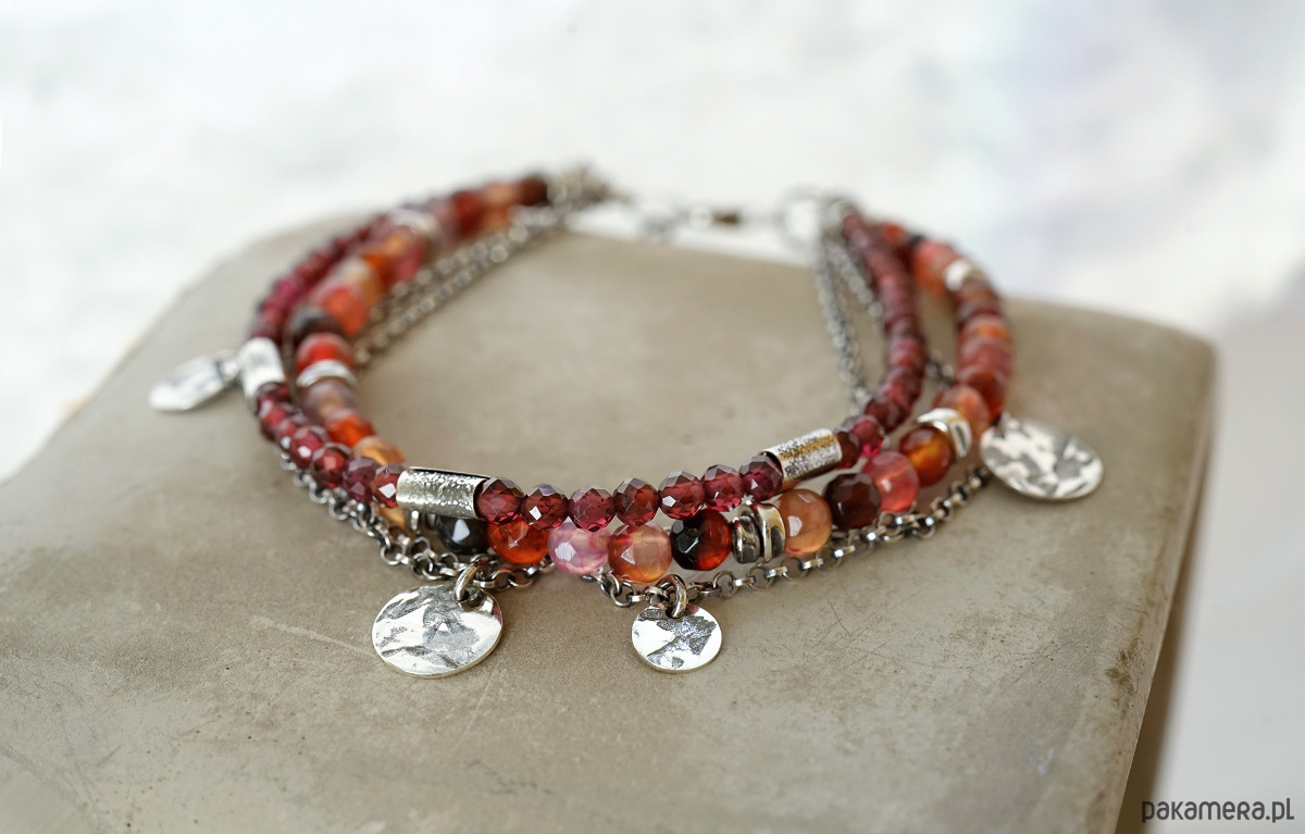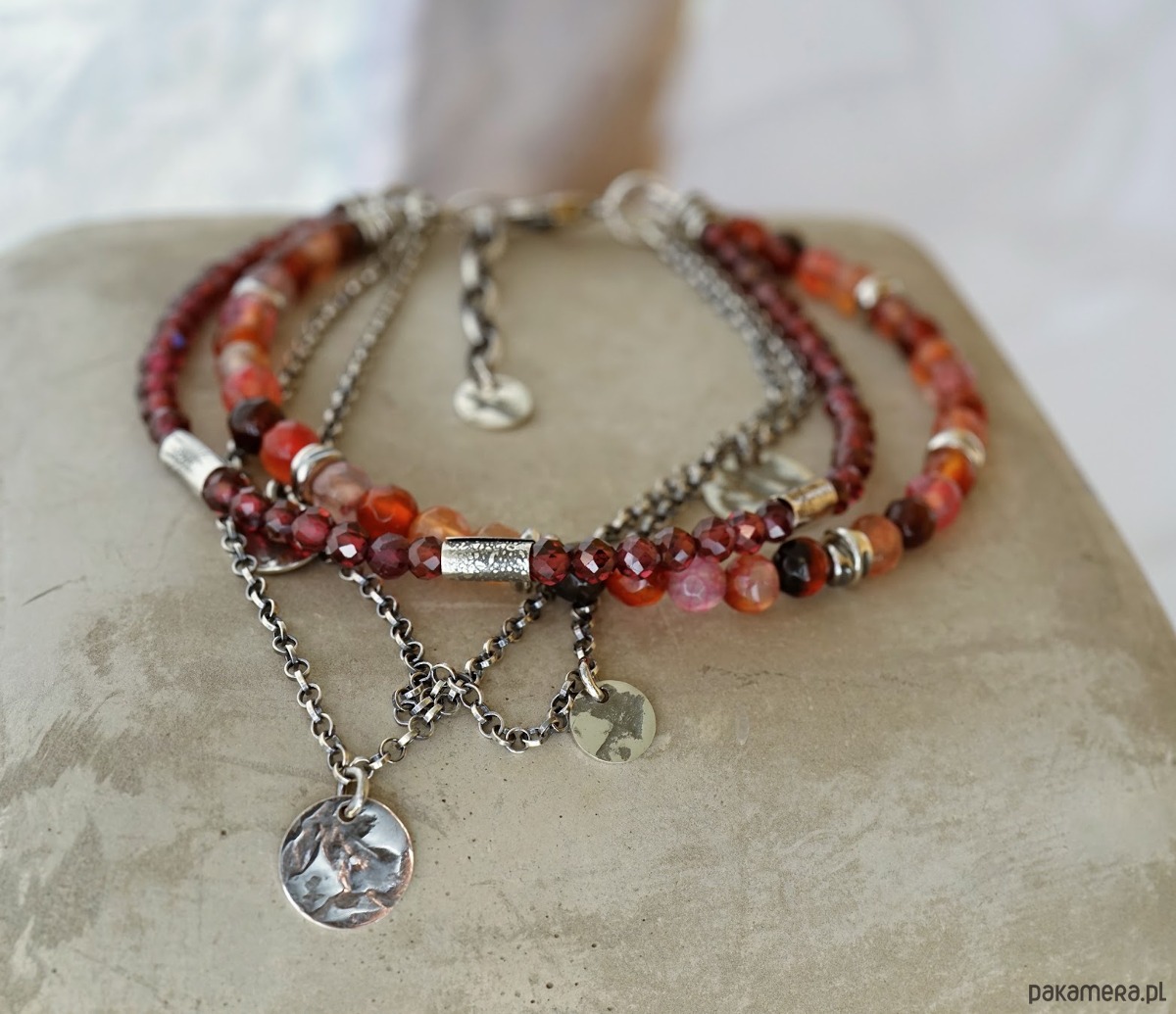 Bransoletka wykonana ze srebra i kamieni naturalnych: agatów i granatów.