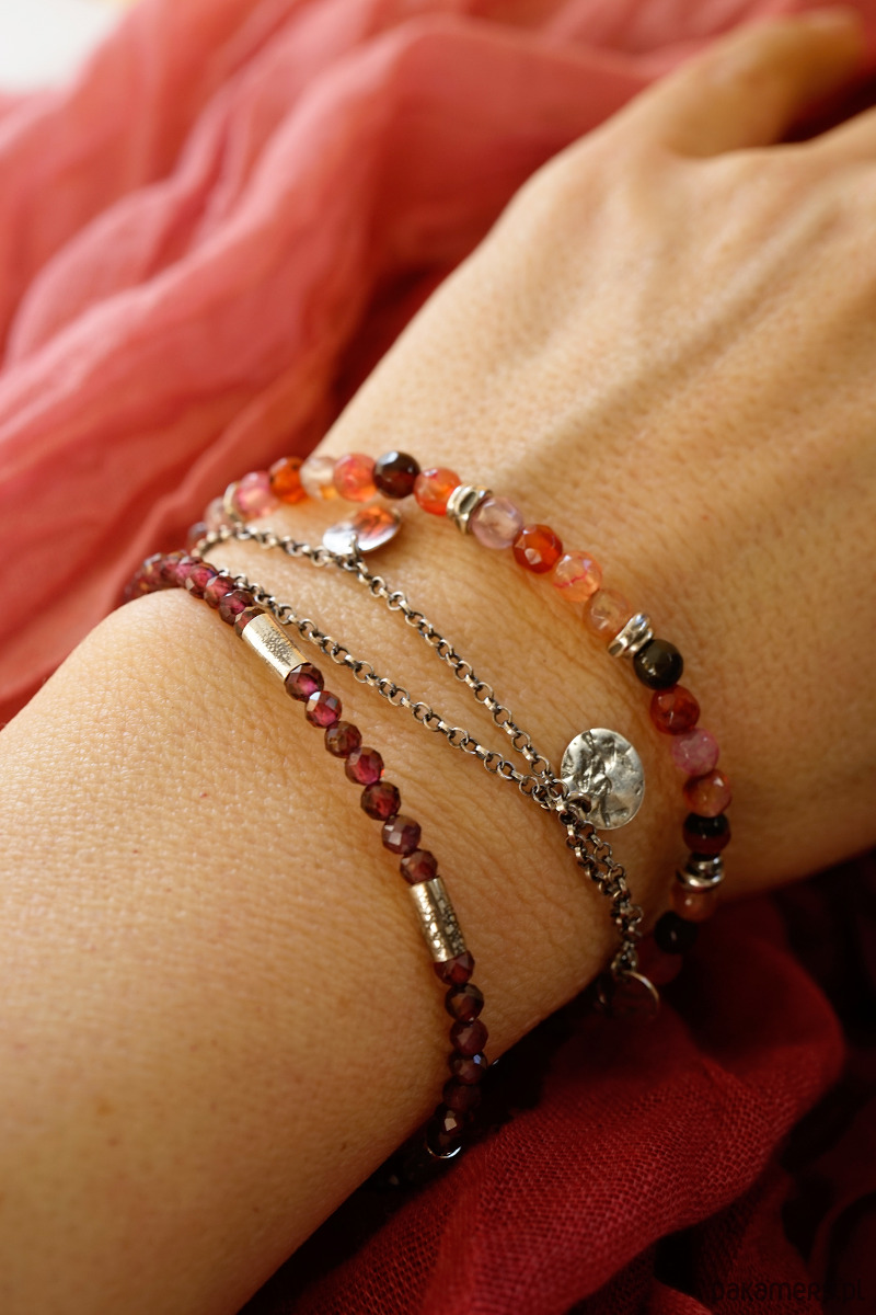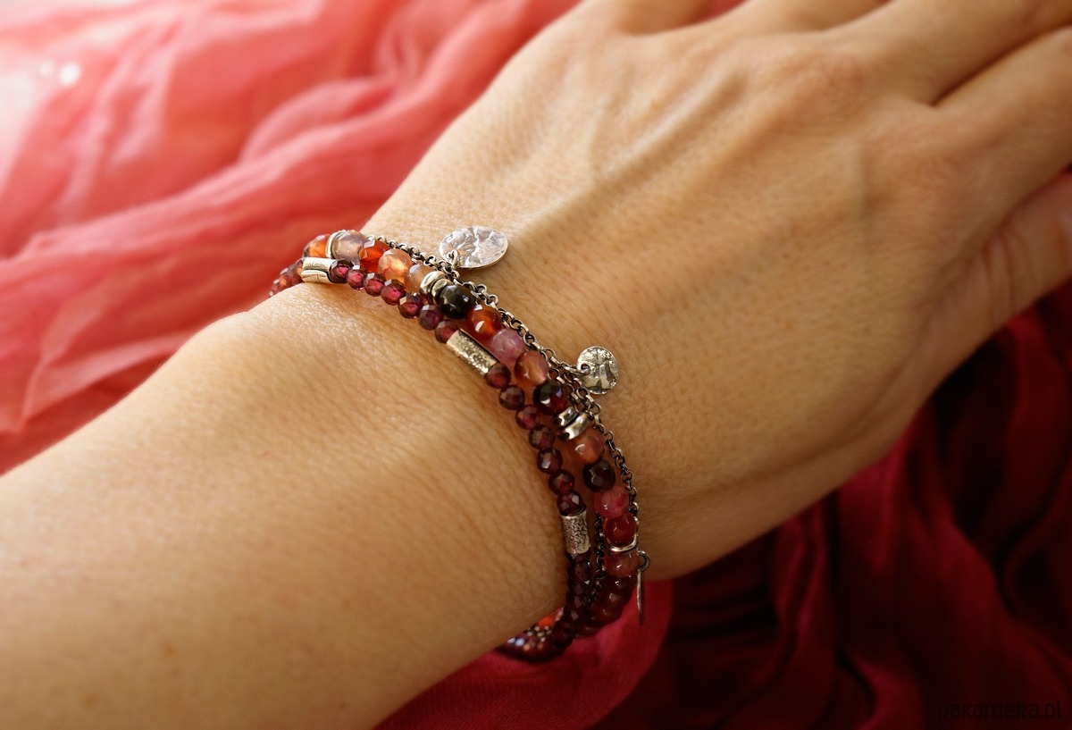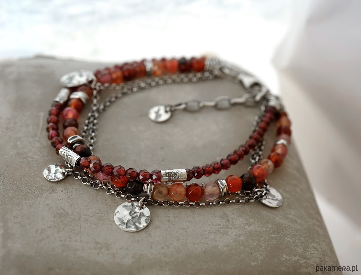 Bransoletka wykonana ze srebra i kamieni naturalnych: agatów i granatów.