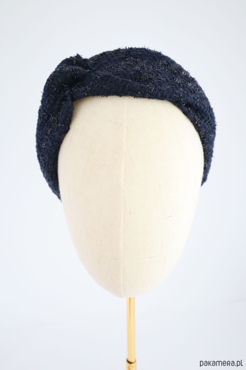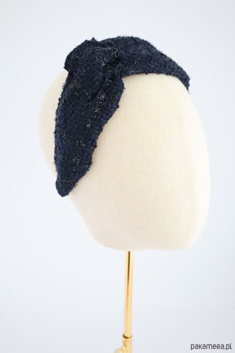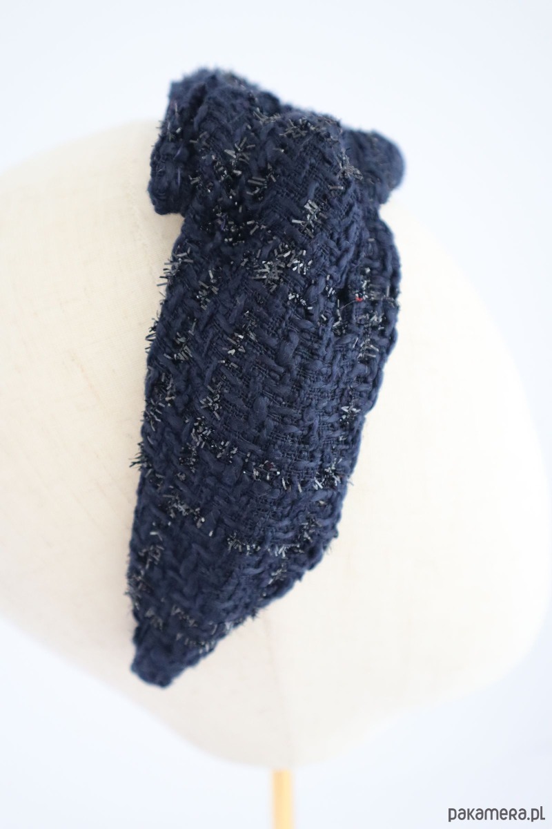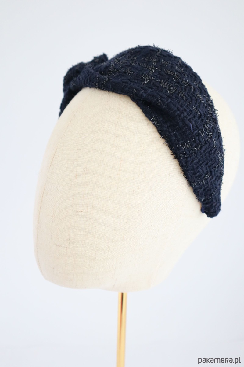 Opaska z grubej szanelki w stylu vintage. Gruby splot tkaniny a na boku ciekawe drapowanie. Kolor ciepłej eleganckiego, głębokiego granatu z delikatną błyszcząca nicią w kolorze złota. Szerokość bazy opaski to 2,5cm, ale sama tkanina masz większą szerokość około 4 cm w najszerszym miejscu. Opaska bardzo dobrze trzyma włosy. Uszyta w naszej pracowni.