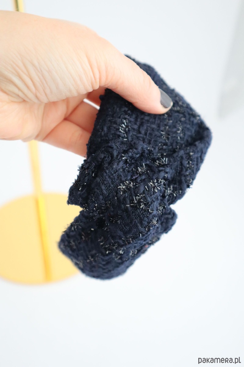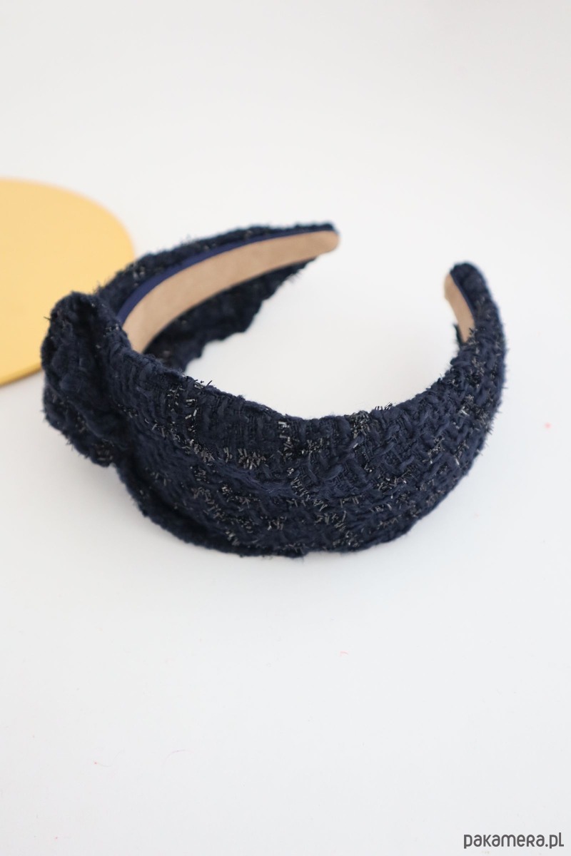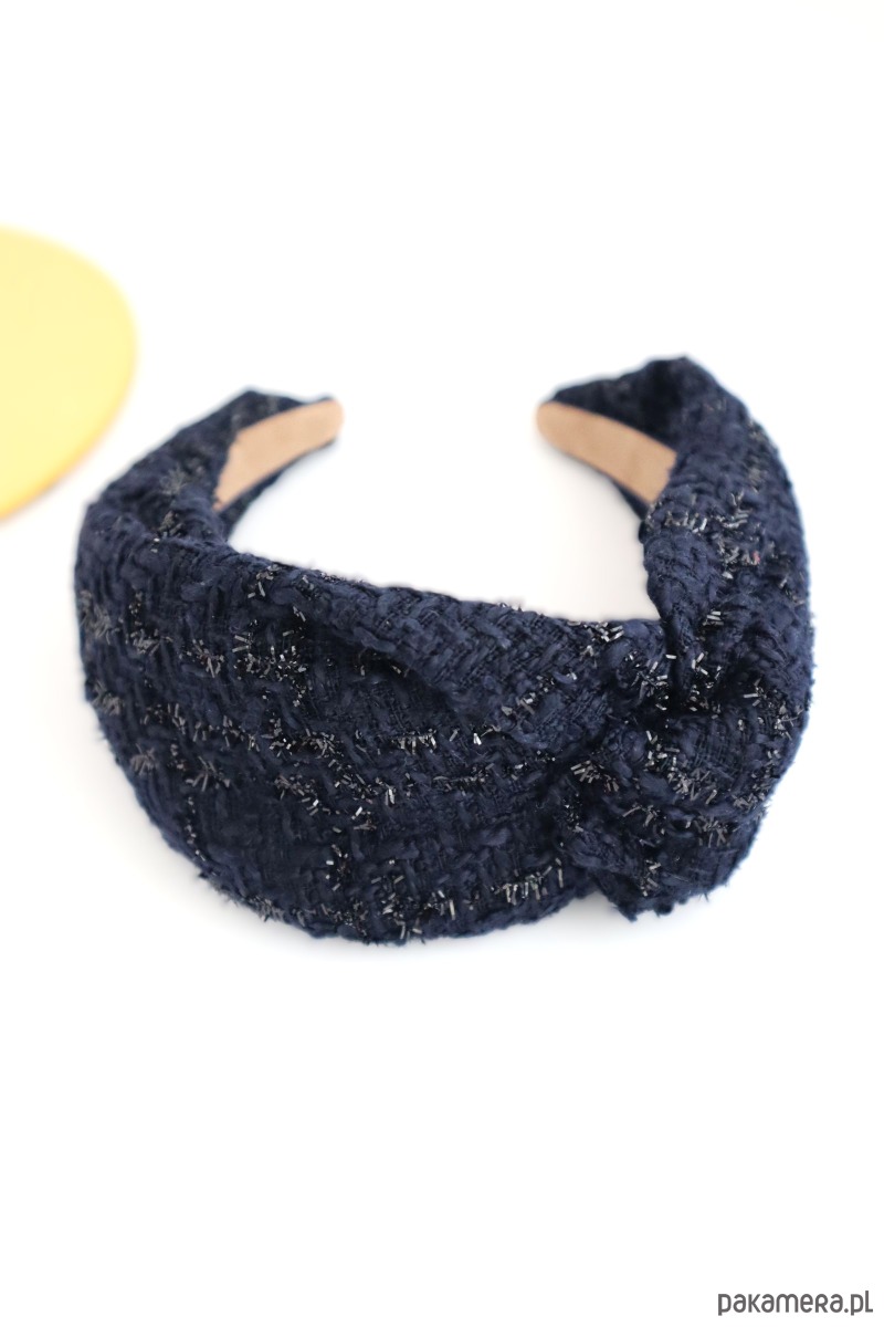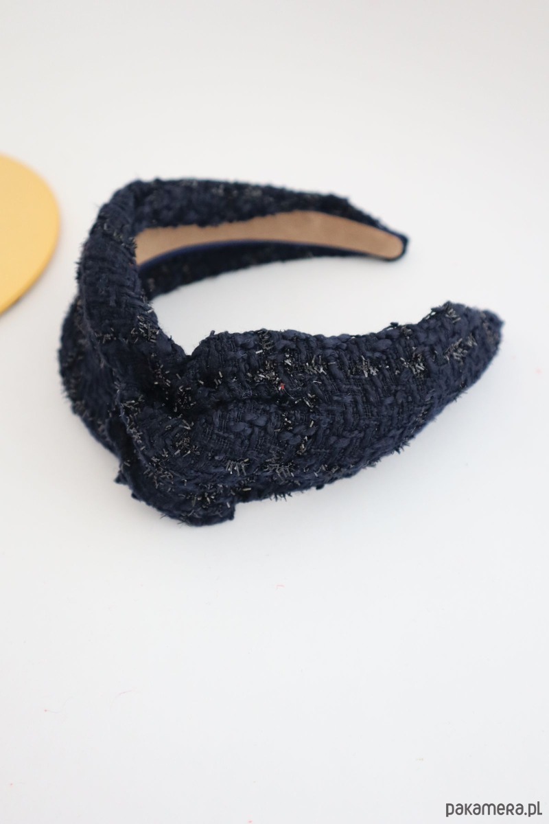 Opaska z grubej szanelki w stylu vintage. Gruby splot tkaniny a na boku ciekawe drapowanie. Kolor ciepłej eleganckiego, głębokiego granatu z delikatną błyszcząca nicią w kolorze złota. Szerokość bazy opaski to 2,5cm, ale sama tkanina masz większą szerokość około 4 cm w najszerszym miejscu. Opaska bardzo dobrze trzyma włosy. Uszyta w naszej pracowni.