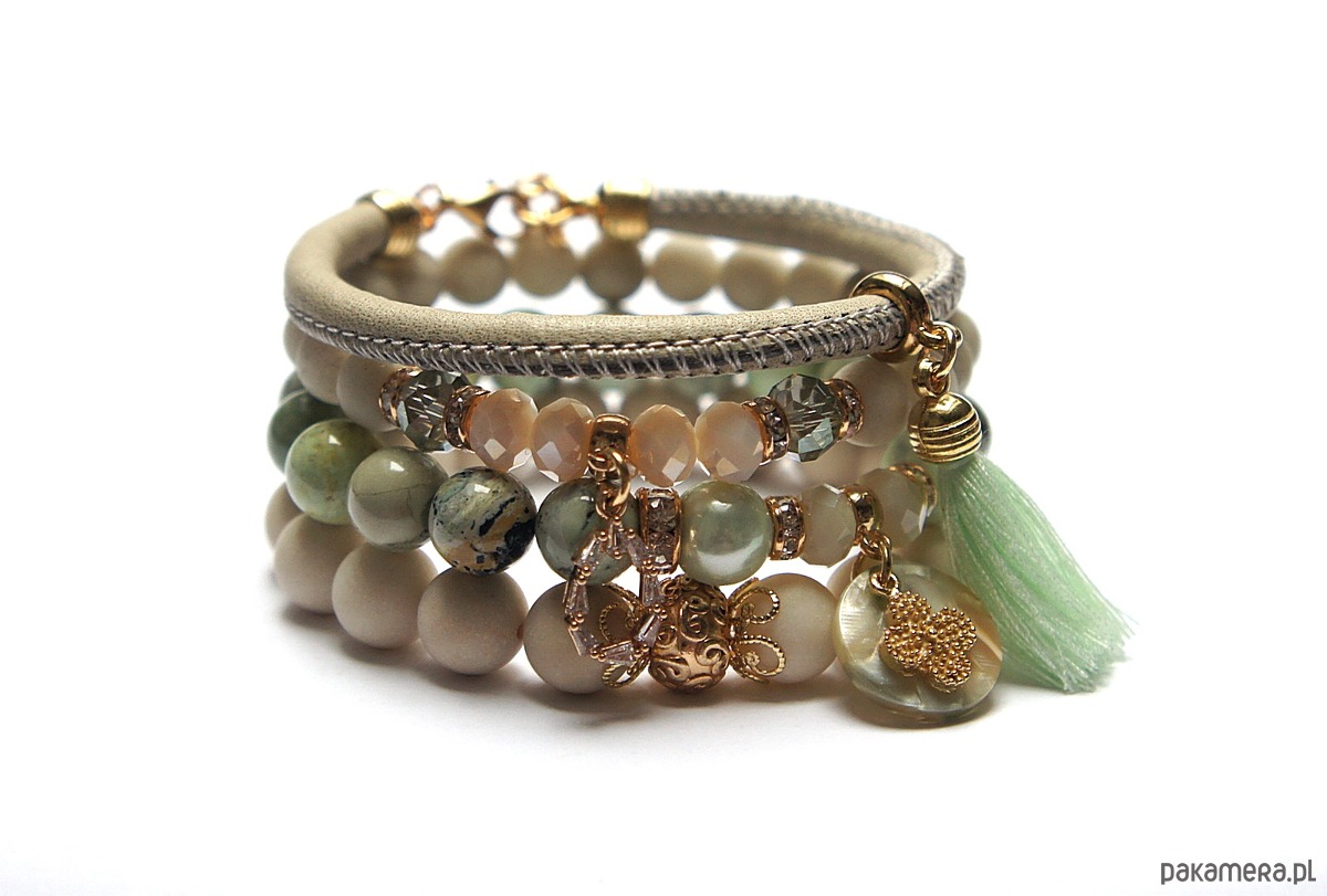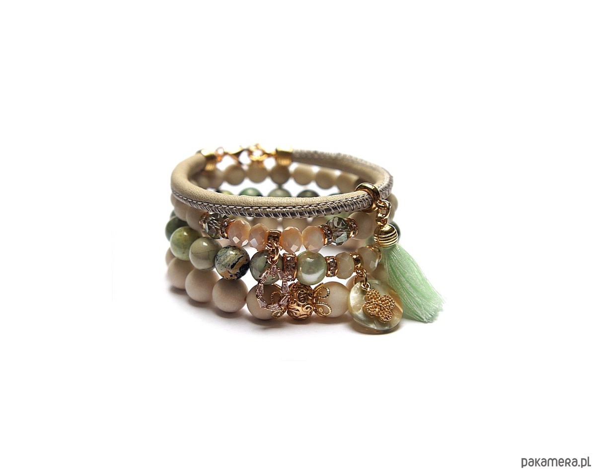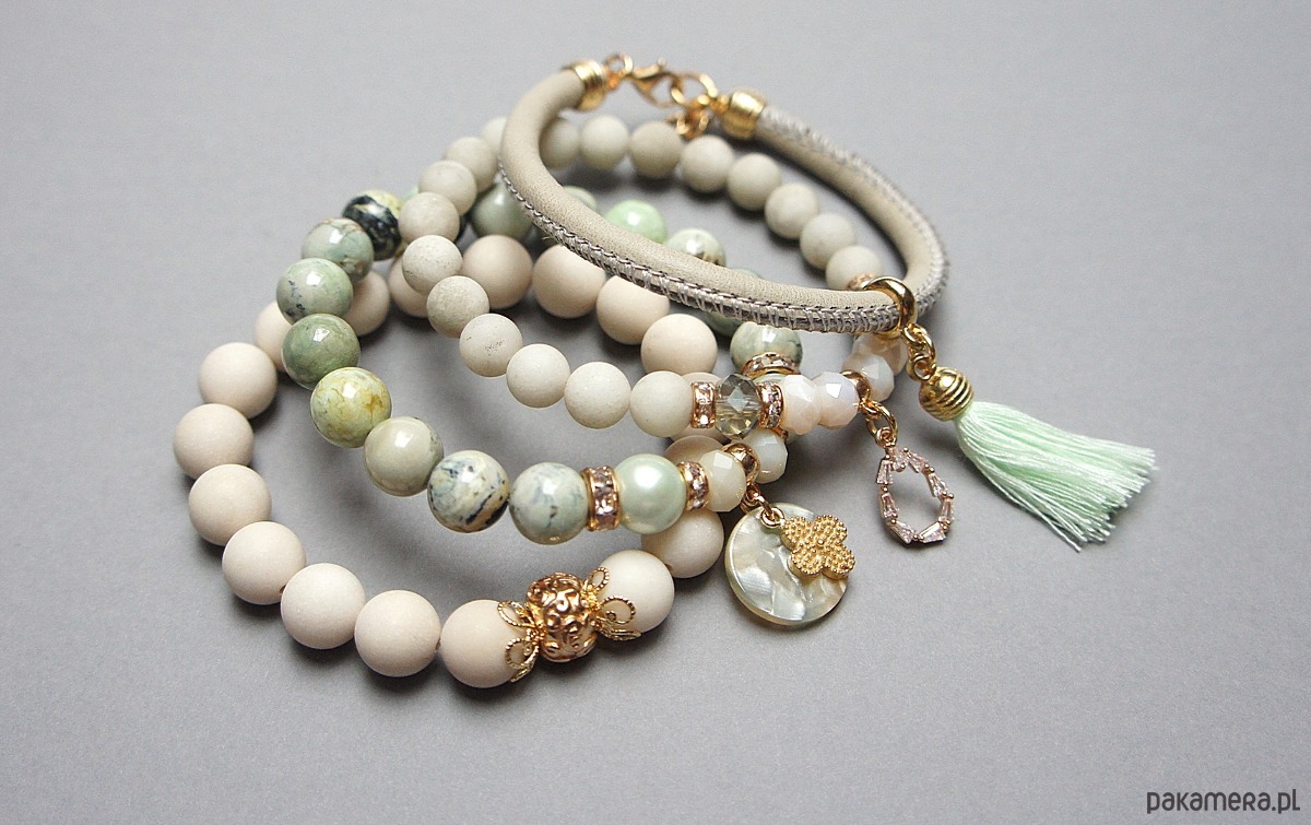 Komplet czterech bransoletek wykonanych z naturalnych kamieni - jadeity [8 i 10mm], opalit [8mm], jaspis matowy [8mmi 10mm], jaspis [10mm], pereł majorka [10mm], kryształków fasetowanych [8mm], rzemienia z naturalnej skóry, chwostu, zawieszki z żywicy, zawieszki wysadzanej cyrkoniami oraz elementów metalowych w kolorze złotym. Bransoletki pasują na nadgarstek 16-17cm.