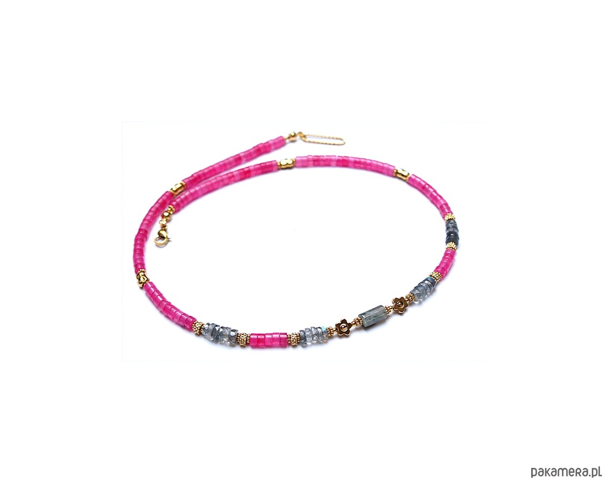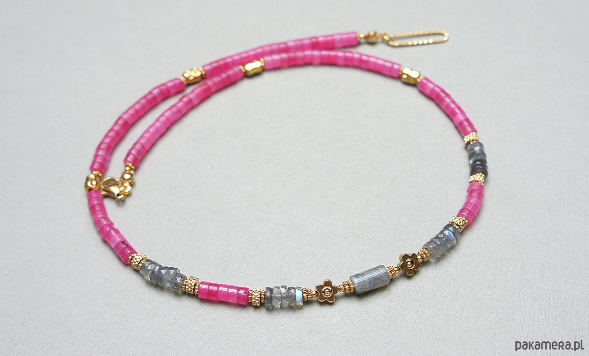 Krótki naszyjnik wykonany w całości z pozłacanej stali szlachetnej oraz minerałów - nieregularne talarki labradorytów [4 x 2mm; kamienie wysokiej jakości, każdy labradoryt o wysokiej labradoryzacji], talarki jadeitu [4 x 2mm], wałeczka labradorytu [12mm], kwiatków z hematytu [6mm]. Naszyjnik o długości ok. 45cm.