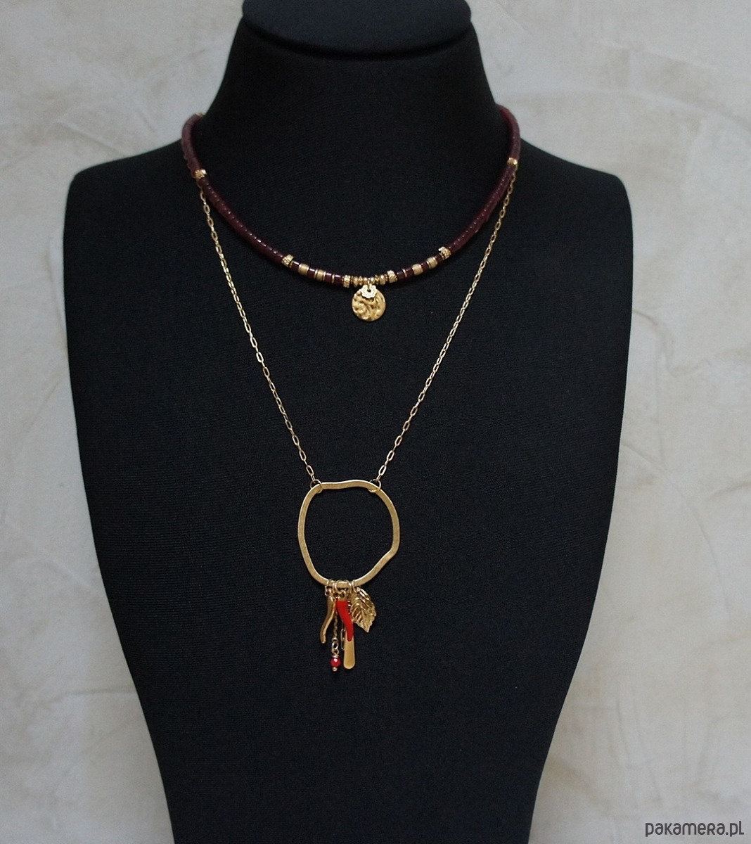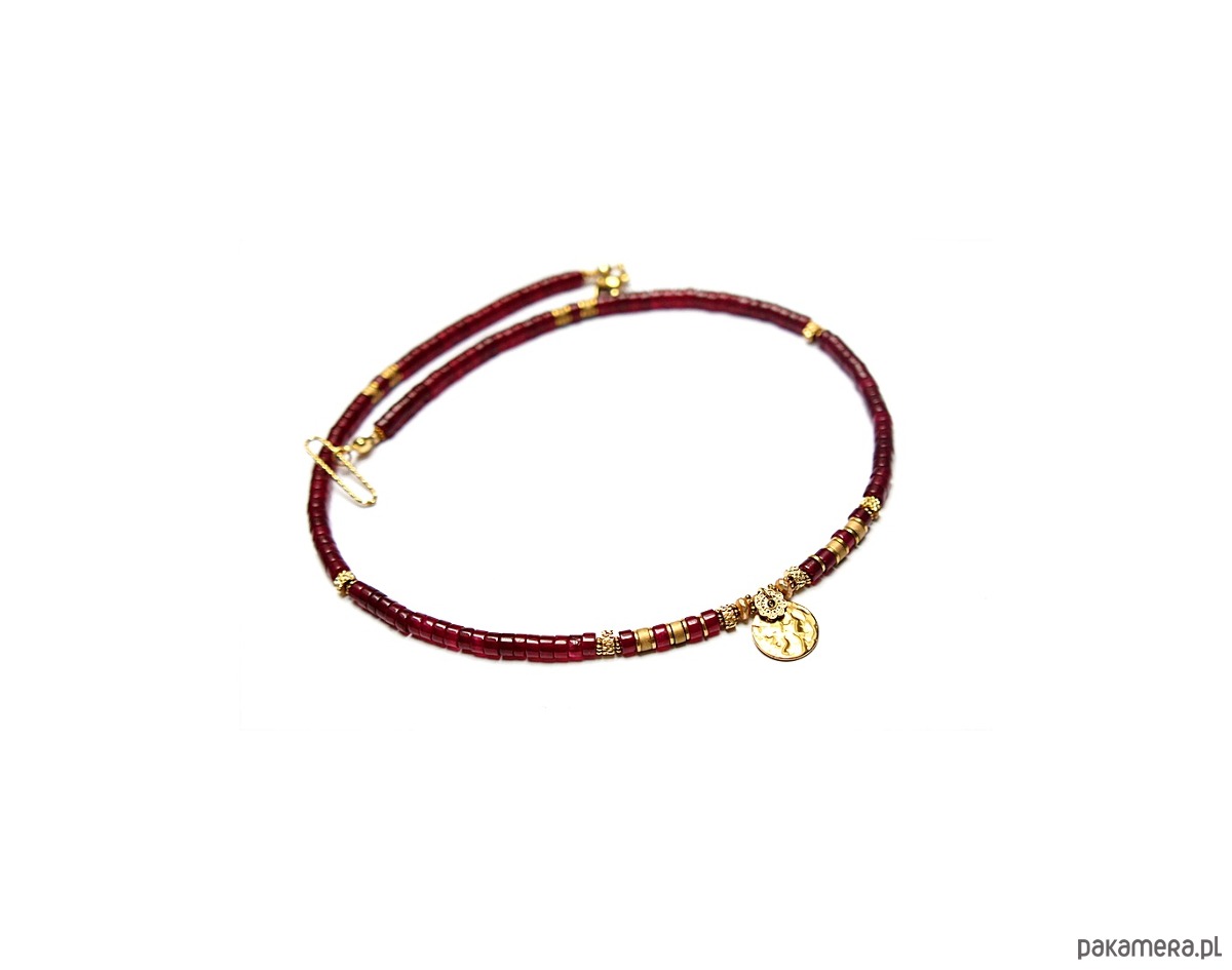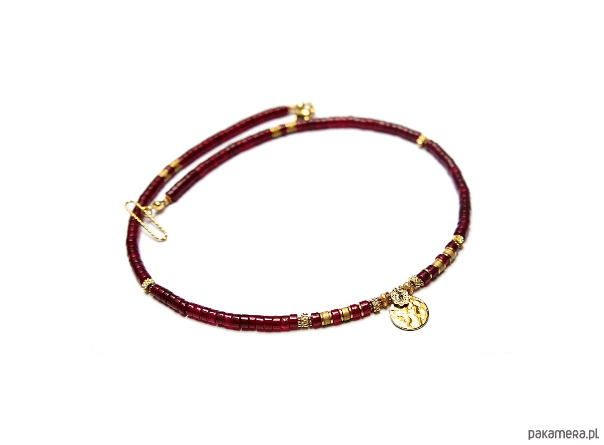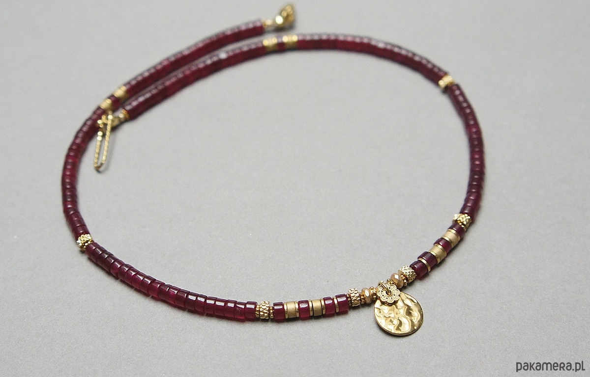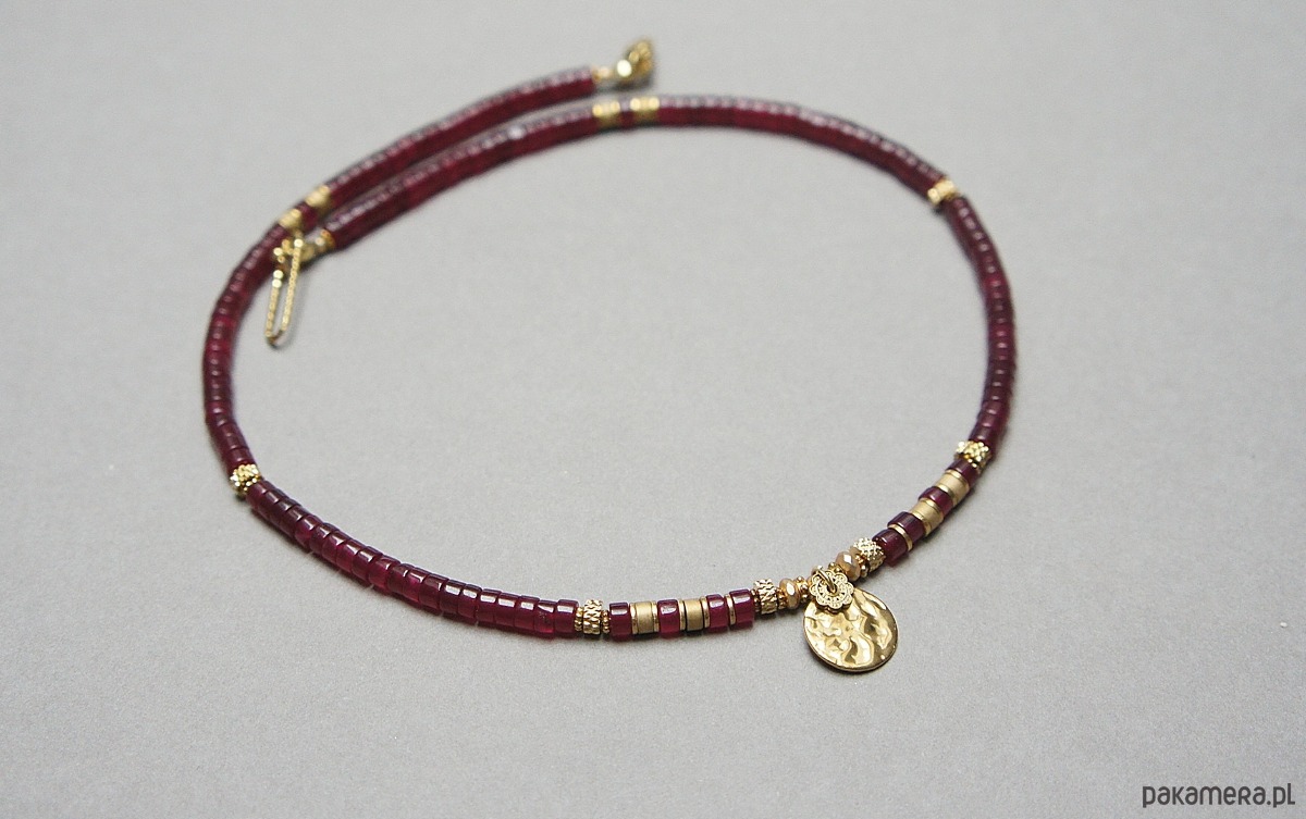 Krótki naszyjnik wykonany w całości z pozłacanej stali szlachetnej oraz kamieni - talarki jadeitu w bordowym kolorze [4 x 2mm], talarki matowego hematytu [4 x 2mm], oponki matowego, platerowanego hematytu [3x2mm oraz 2 x1mm]. Naszyjnik o długości ok. 43cm.