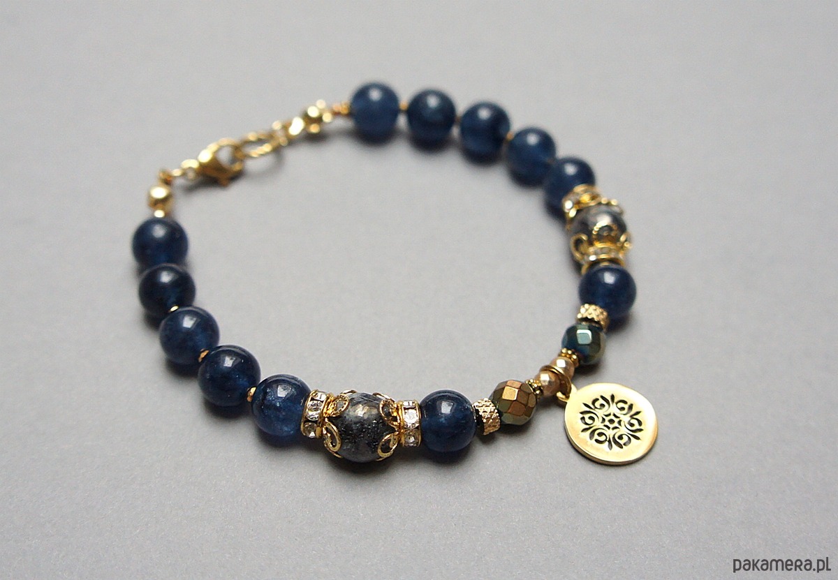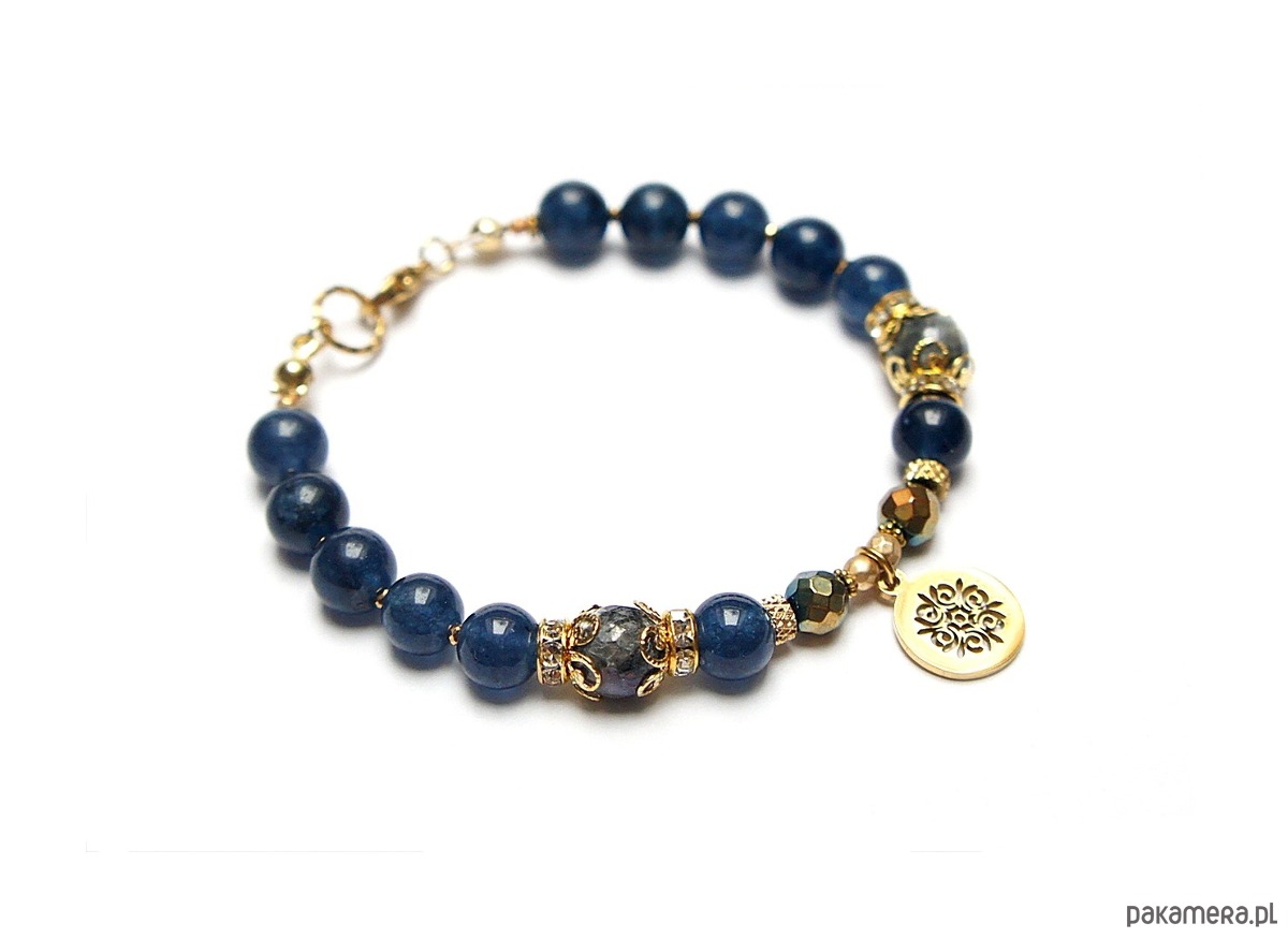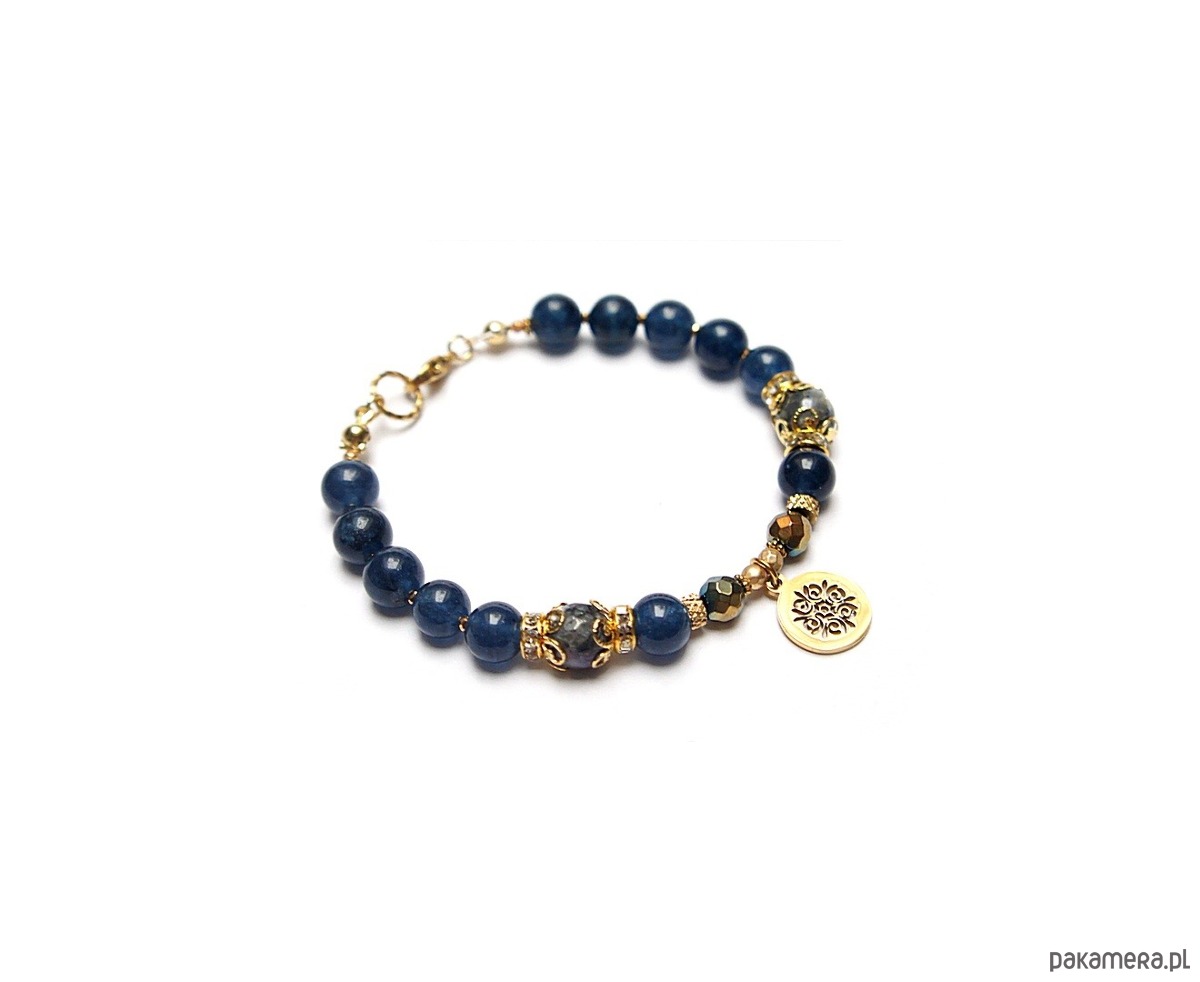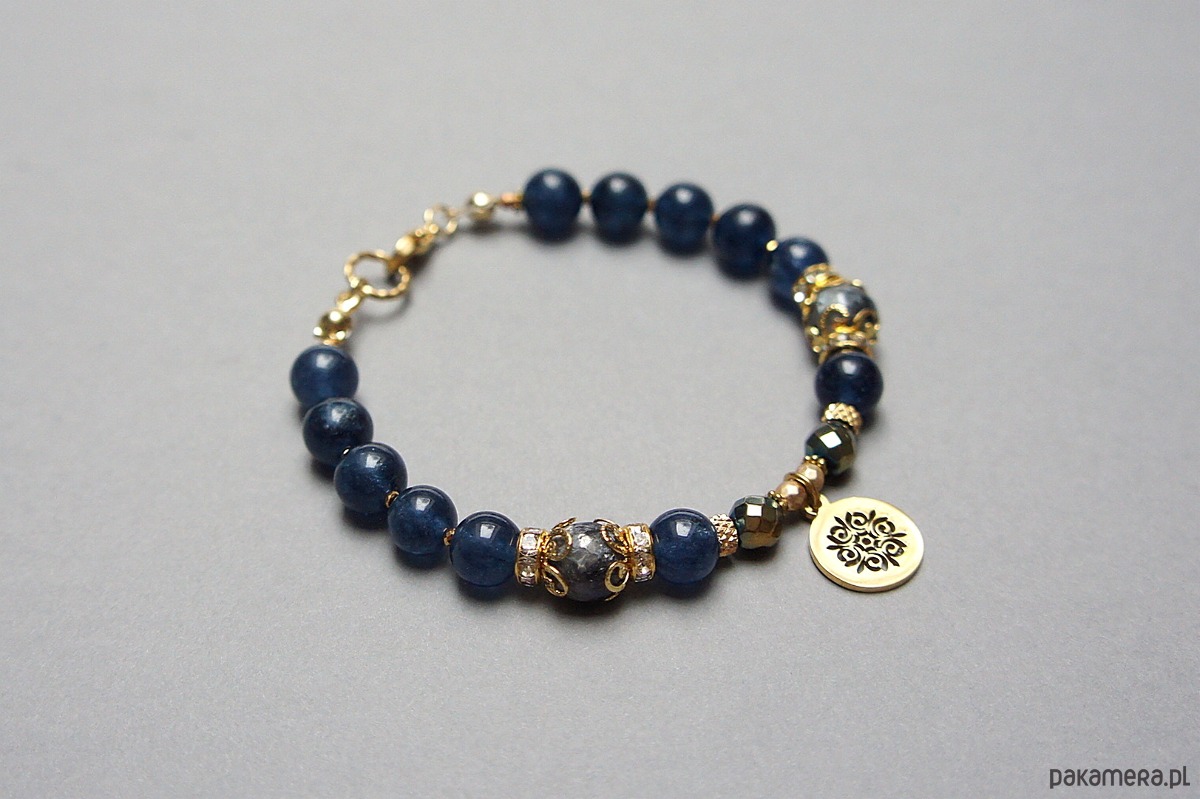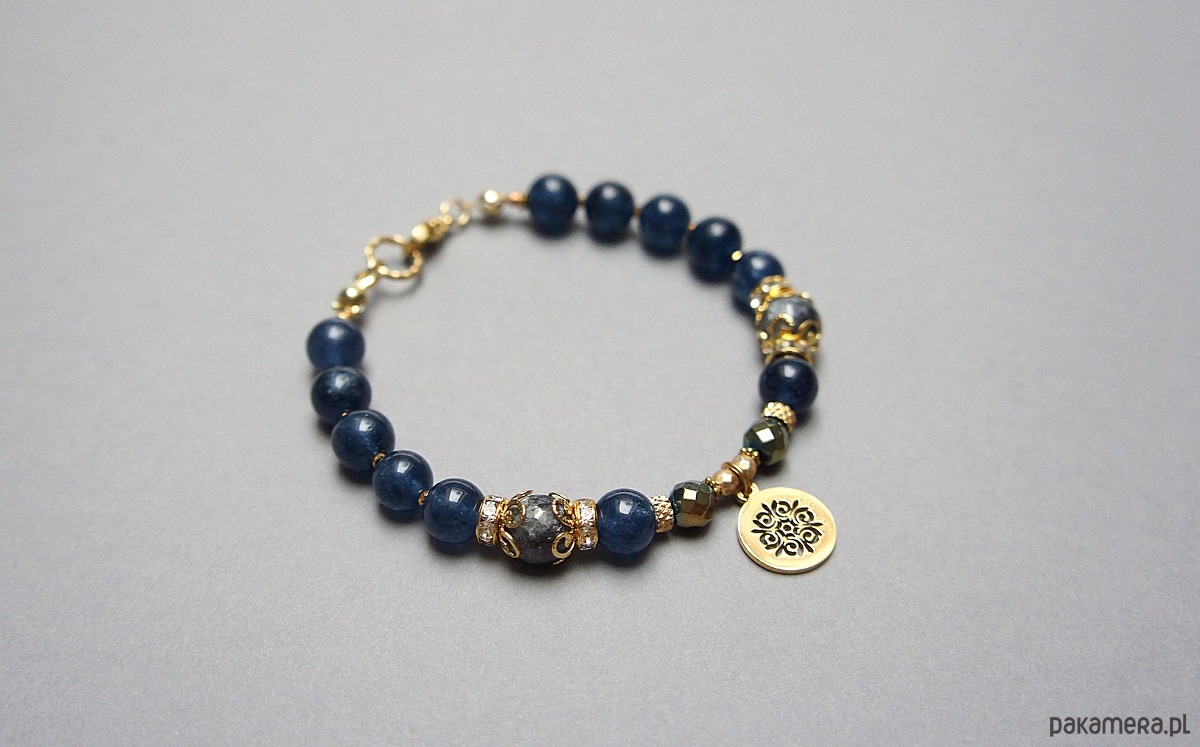 Delikatna bransoletka wykonana w całości ze stali szlachetnej pozłacanej, naturalnych kamieni - jadeity w kolorze granatowym [8mm], larvikit fasetowany z opalizującą powłoką mystic [8mm], fasetowanych hematytów [3mm i 6mm]. Całkowita długość bransoletki ok. 19cm. Biżuteria ozdobnie zapakowana.