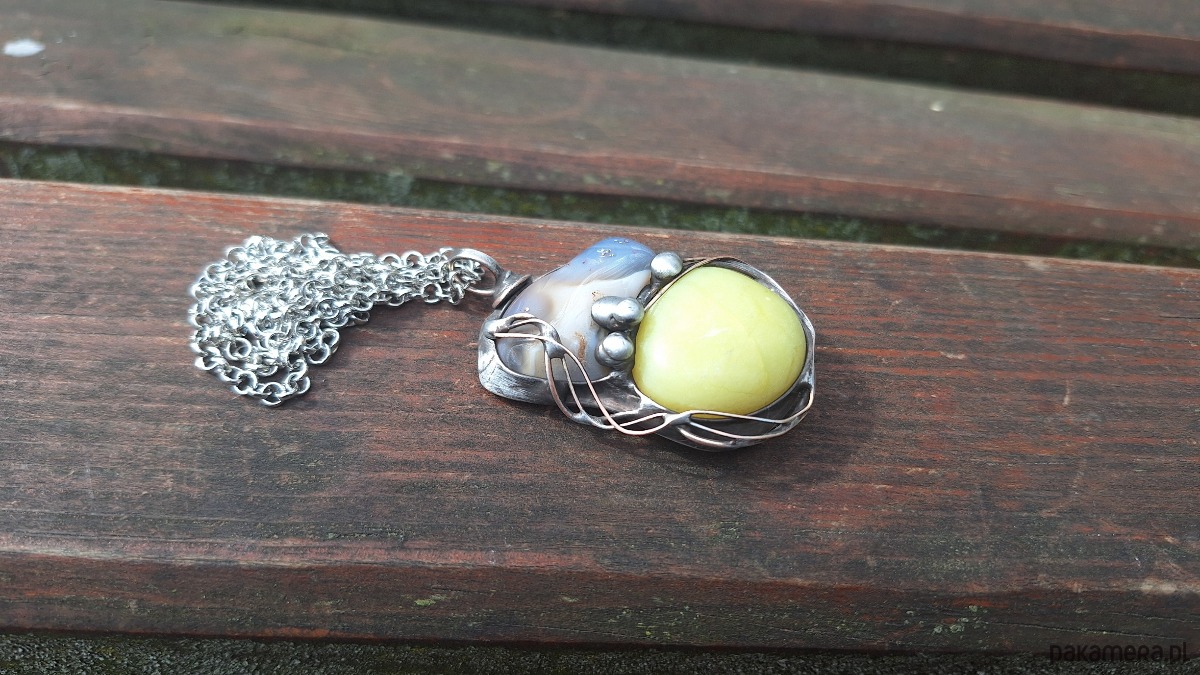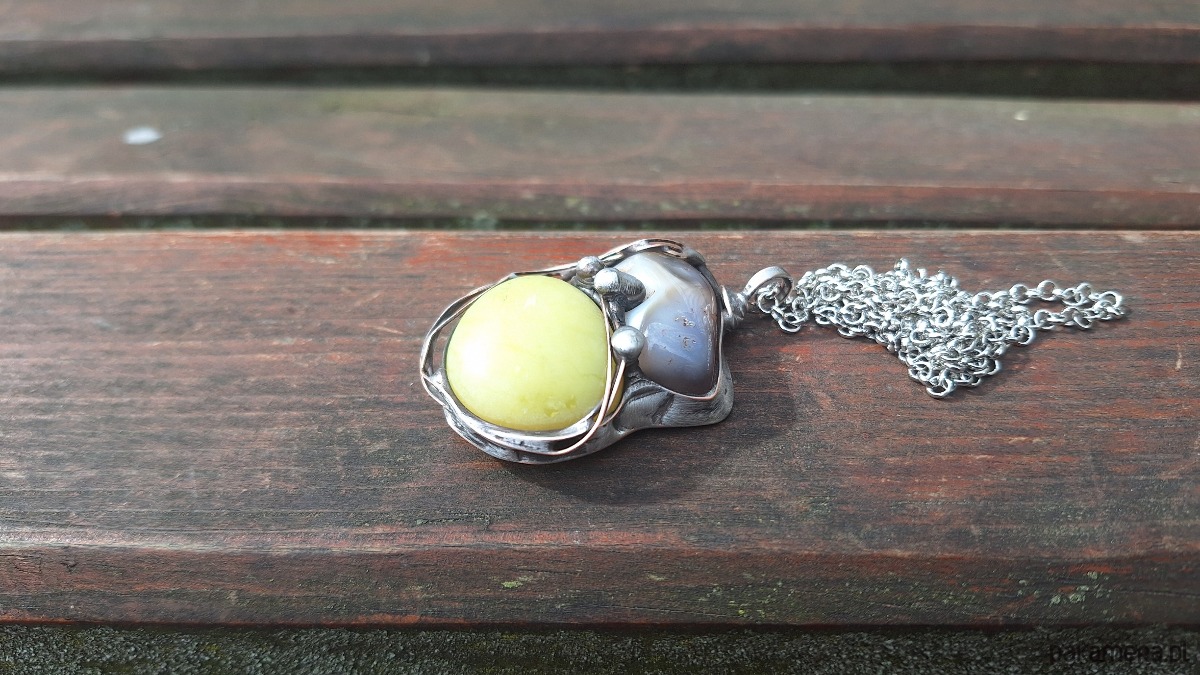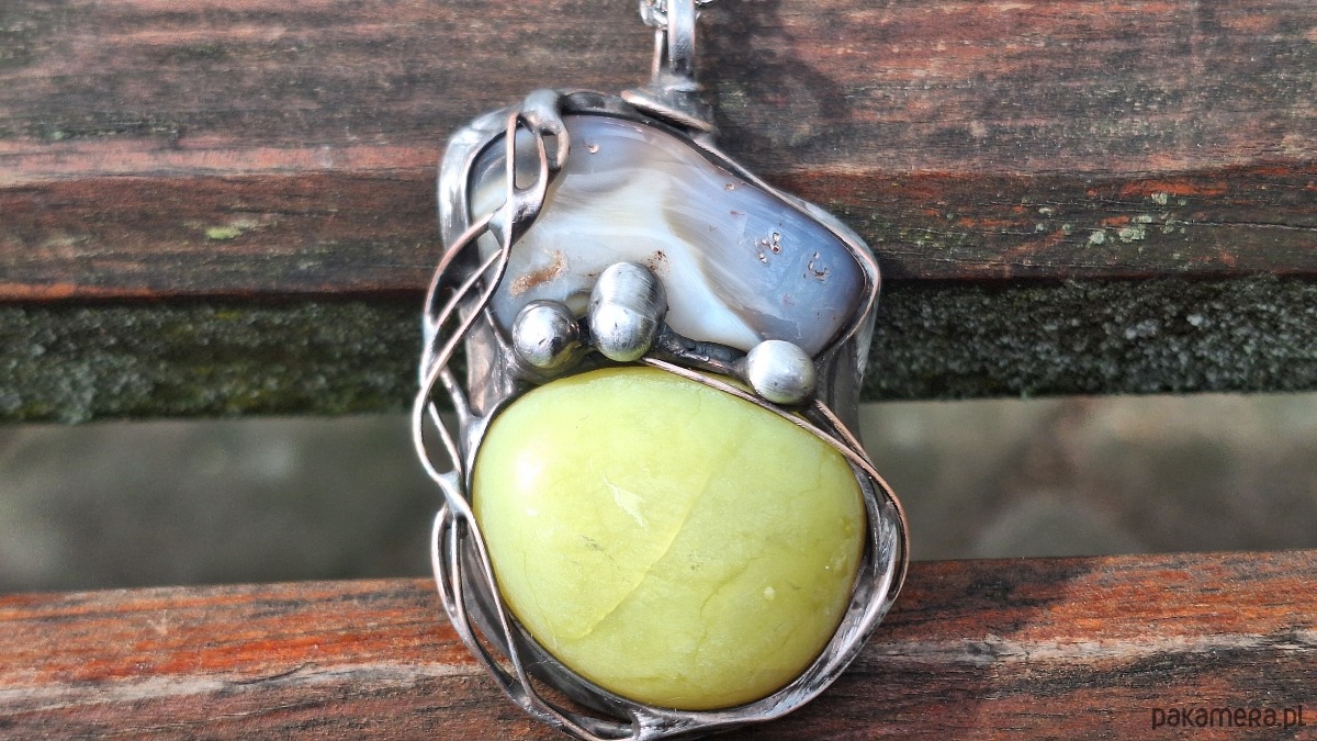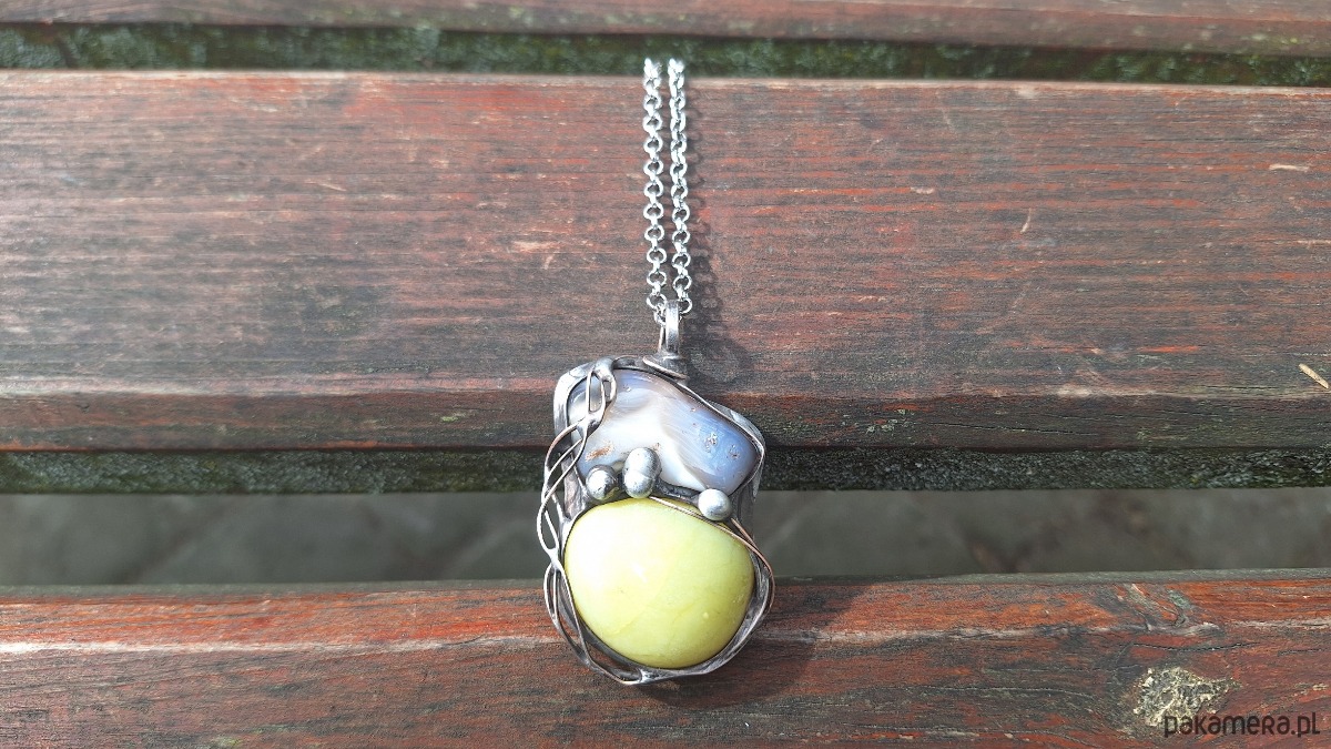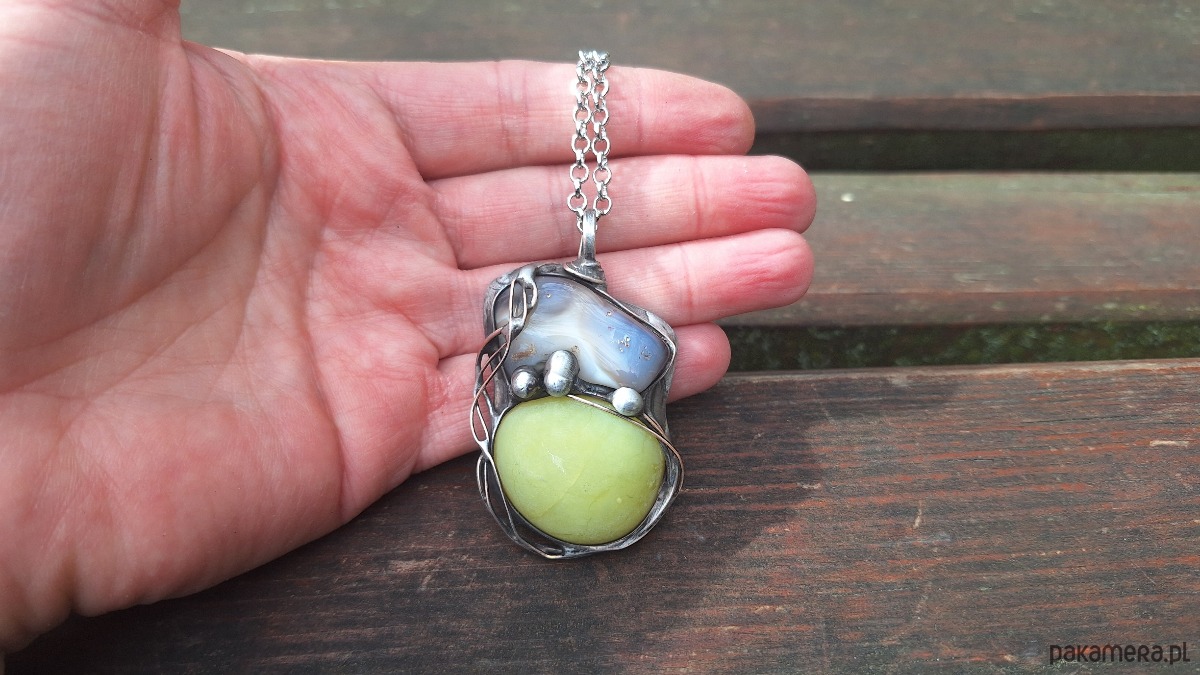 Wisiorek wykonany z miedzi, cyny, naturalnego agatu i jadeitu. Wymiary ok. 5 na 3 cm. Zawieszony na łańcuszku o długości ok. 50 cm.