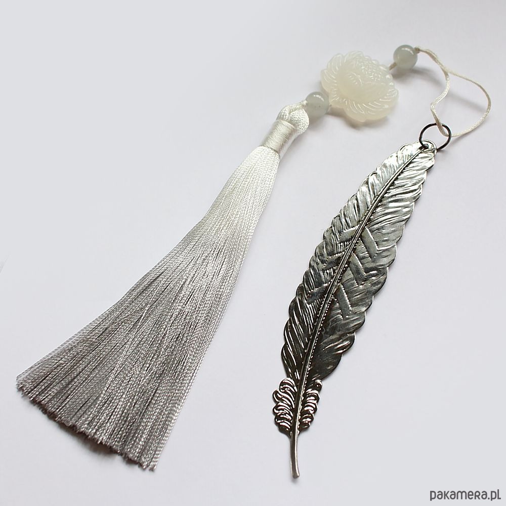 Elegancka etno zakładka do książki w odcieniu bieli, , szarości i srebra z przepięknym ręcznie rzeźbionym białym jadeitem, agatem szarym i cieniowanym chwostem.