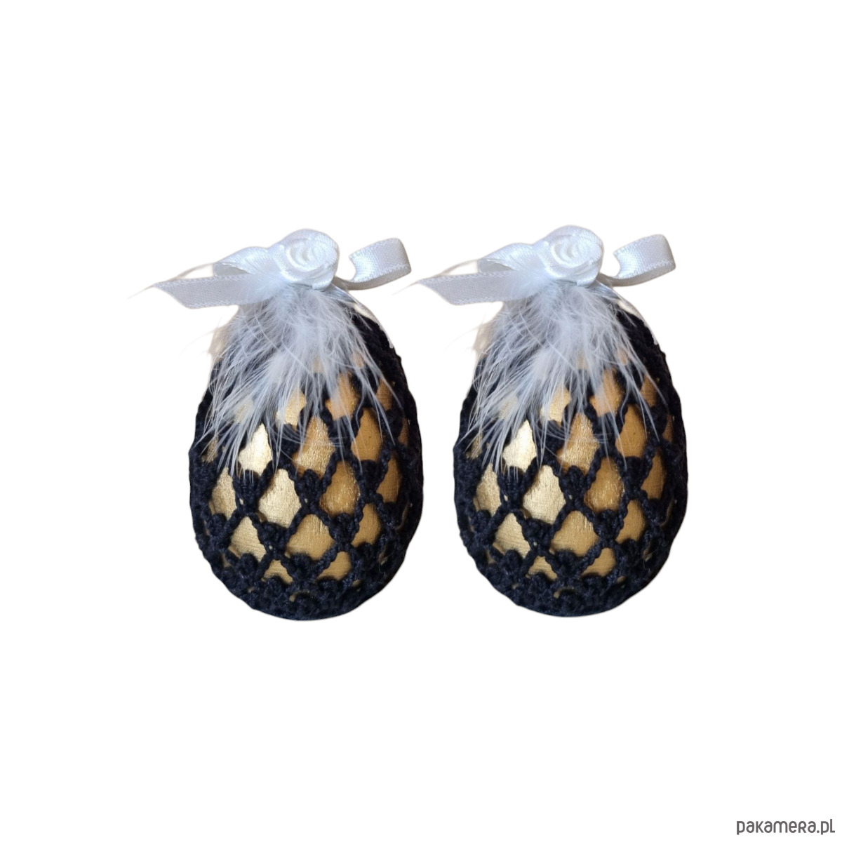 Kwintesencja stylu Glamour zaklęta w wielkanocnych jajkach. Czarna koronkowa siateczka delikatnie oplata złote jajko. Biała atłasowa różyczka oraz naturalne piórko dopełniają wyrafinowany charakter tej dekoracji wielkanocnej.