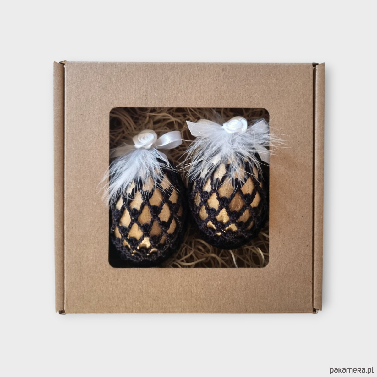 Dzięki odpowiednio zaprojektowanemu szydełkowemu wzorowi, jajko może samodzielnie stać. Jajka Glamour zapakowane z pietyzmem w pudełeczko z okienkiem, mogą być uroczym upominkiem dla bliskich.
