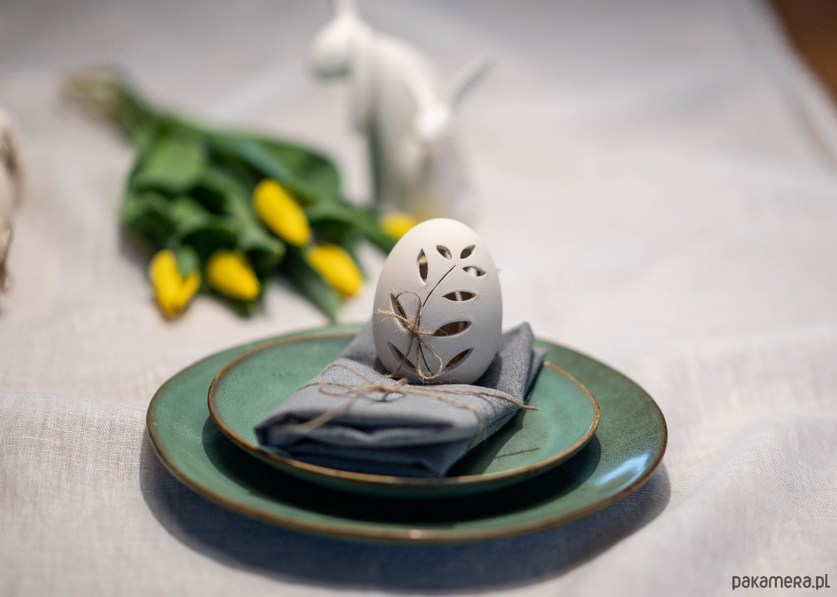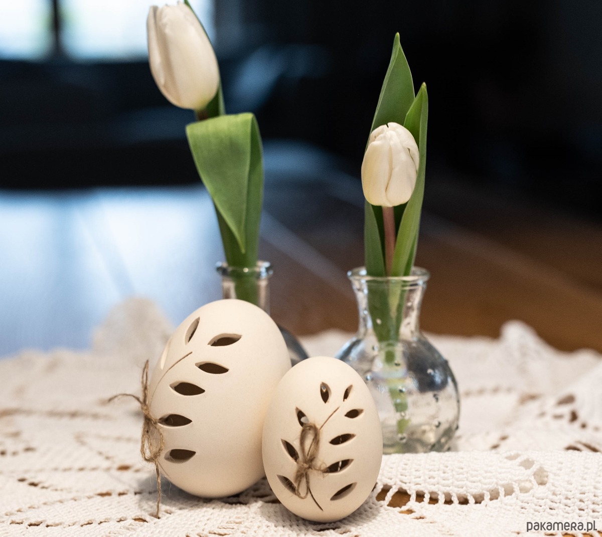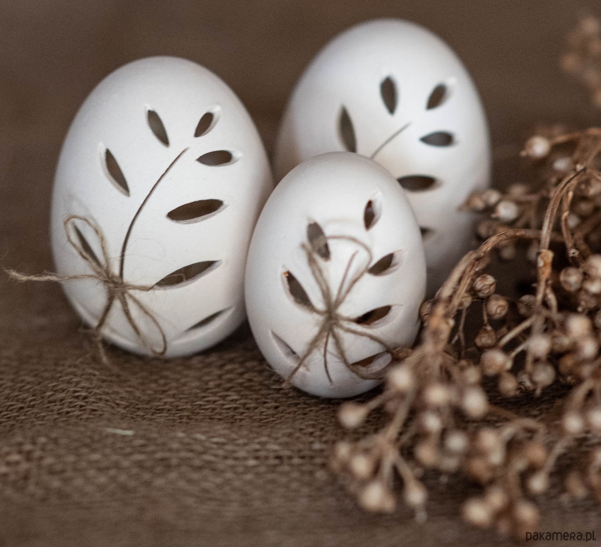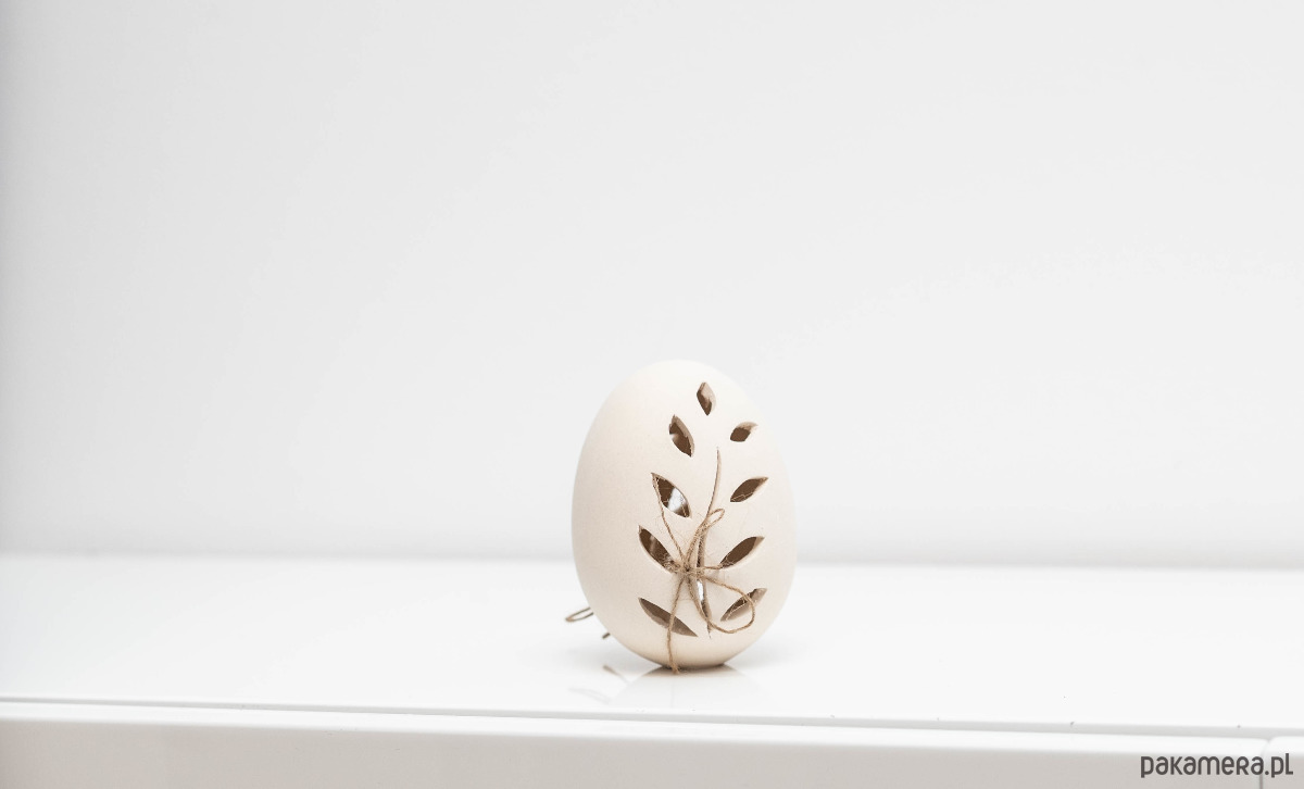 Jajko ceramiczne w naturalnym beżowym kolorze z wyciętym motywem roślinnym (przód i tył) oraz ozdobione kokardą z naturalnego sznurka.