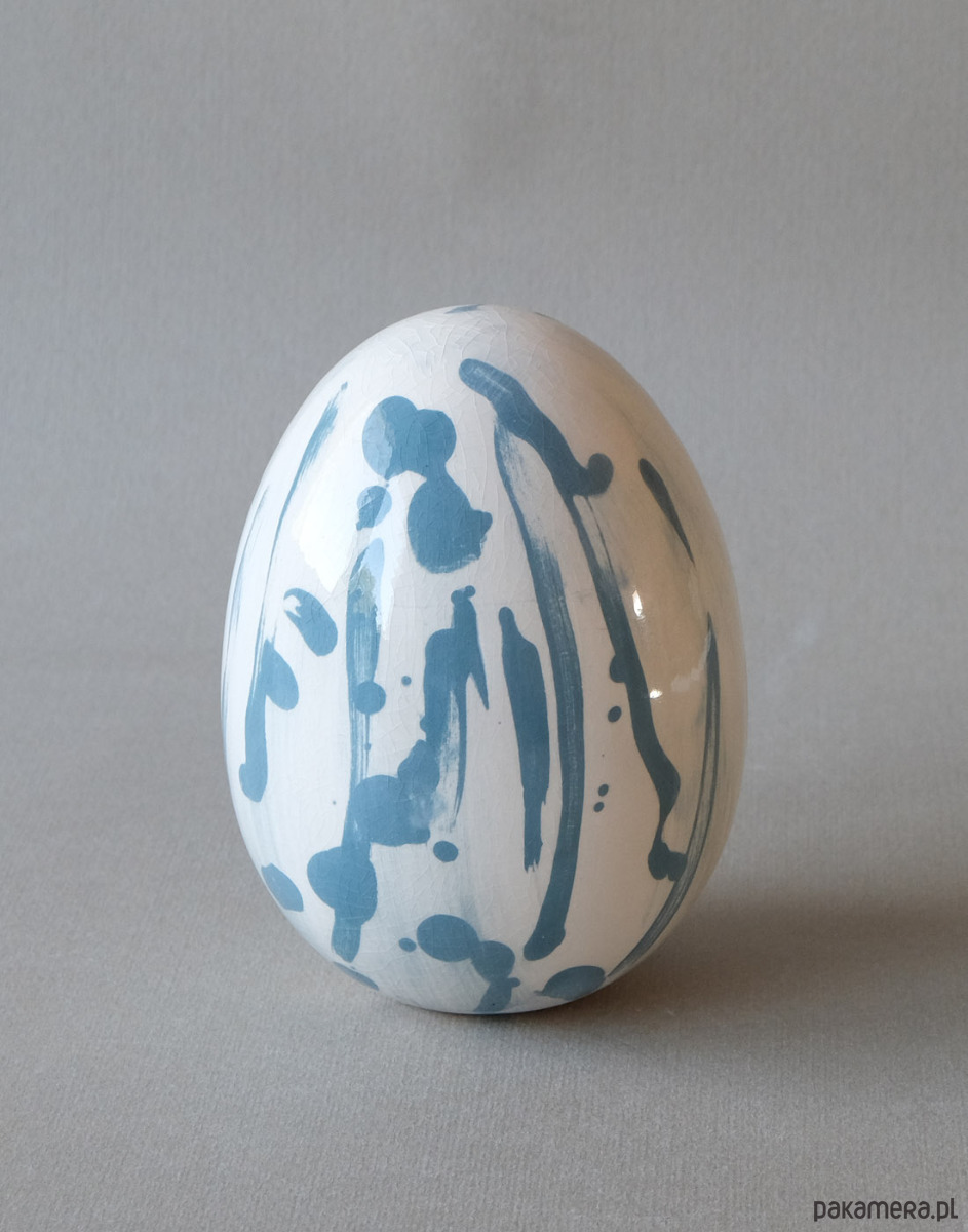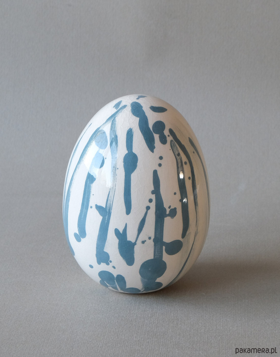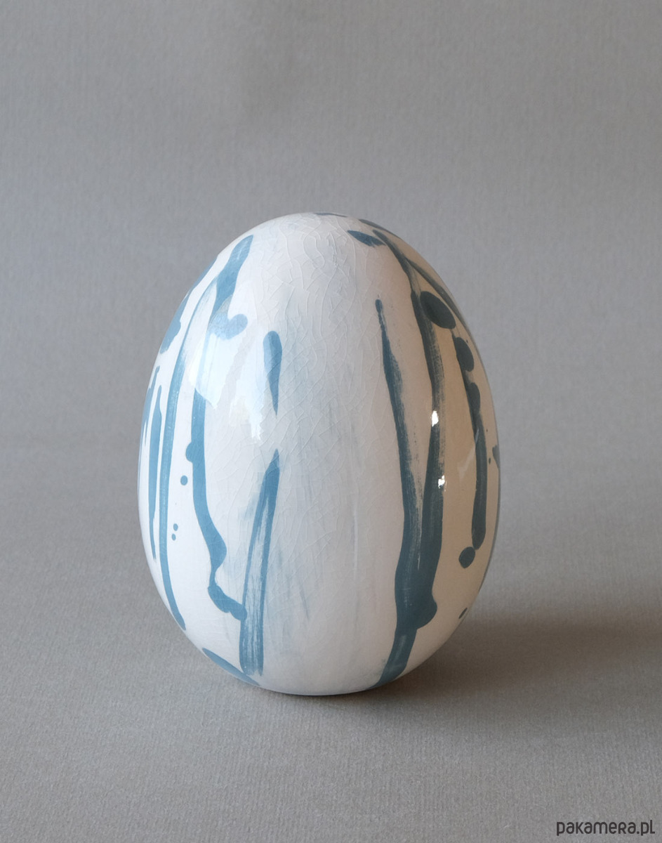 Jajko ceramiczne w kolorze białym, z niebieską dekoracją. Pokryte błyszczącym szkliwem. Jajko wykonane z masy lejnej, dwukrotnie wypalane, puste w środku, posiada otwór od spodu, wysokość 10,5 cm. Można go postawić, nadaje się do dekoracji stołu, do świątecznych stroików, koszyków i kompozycji z kwiatami.