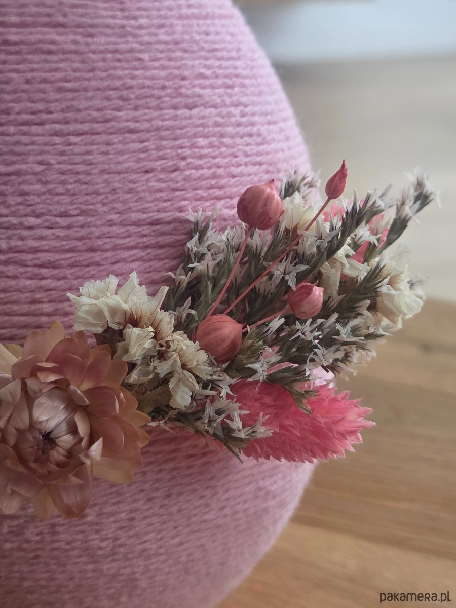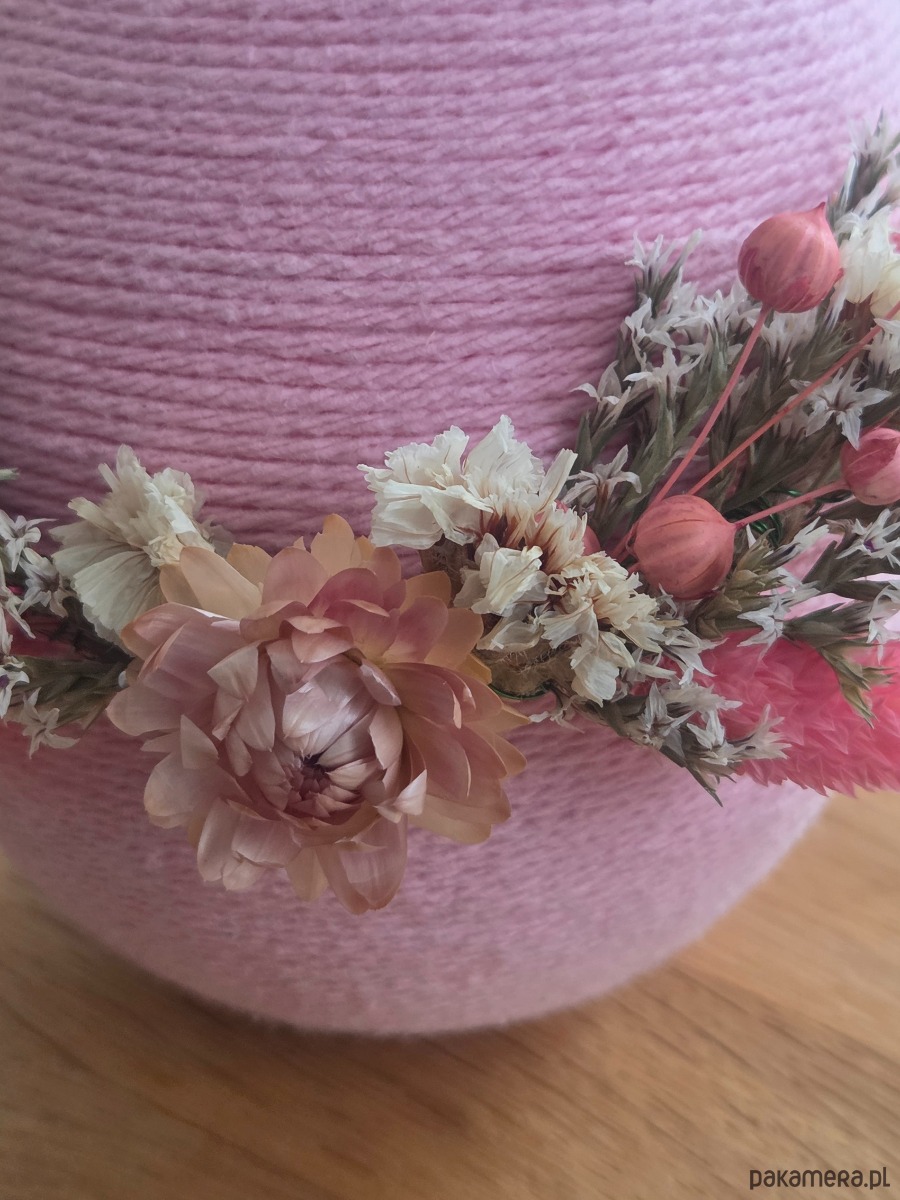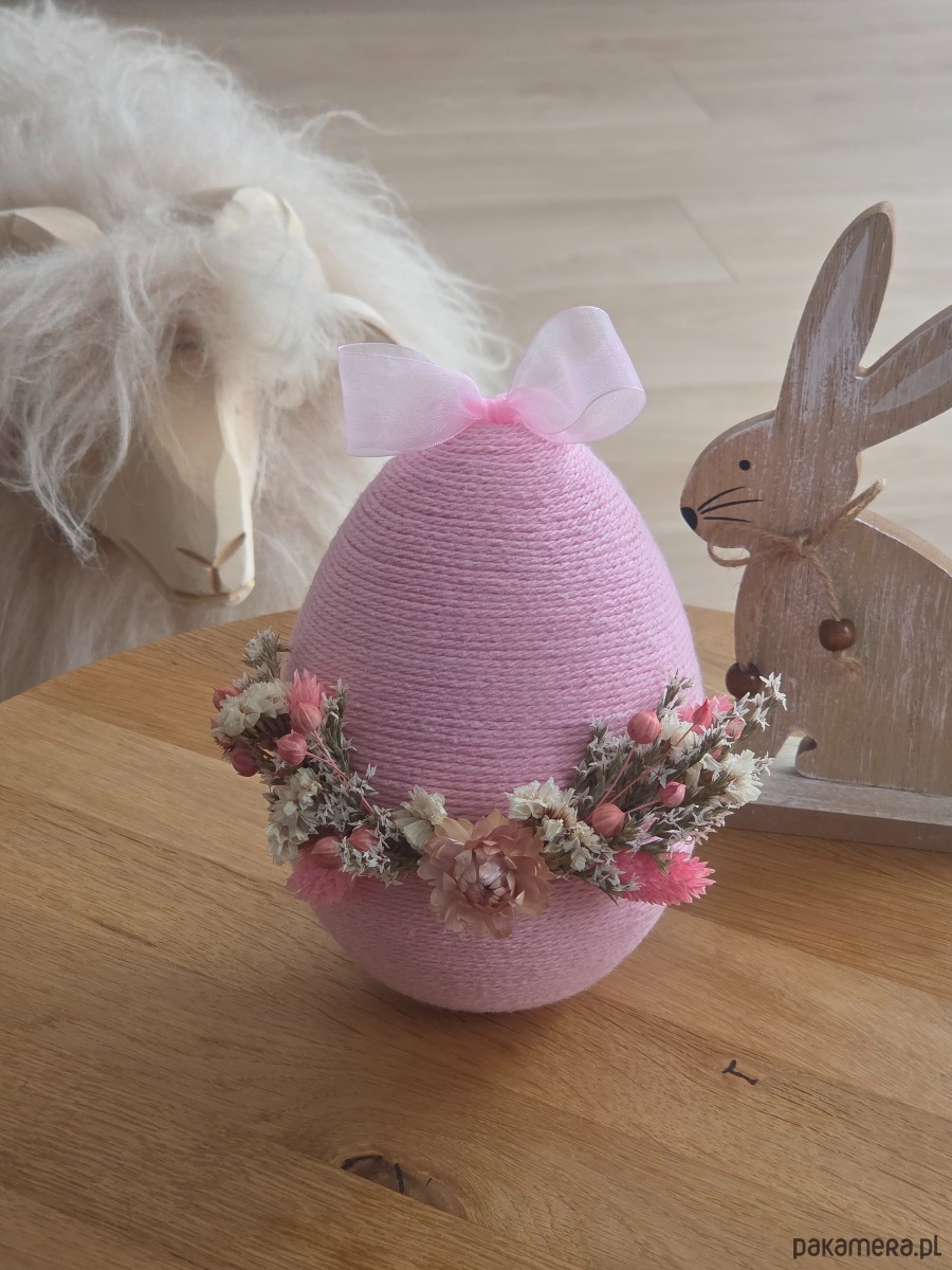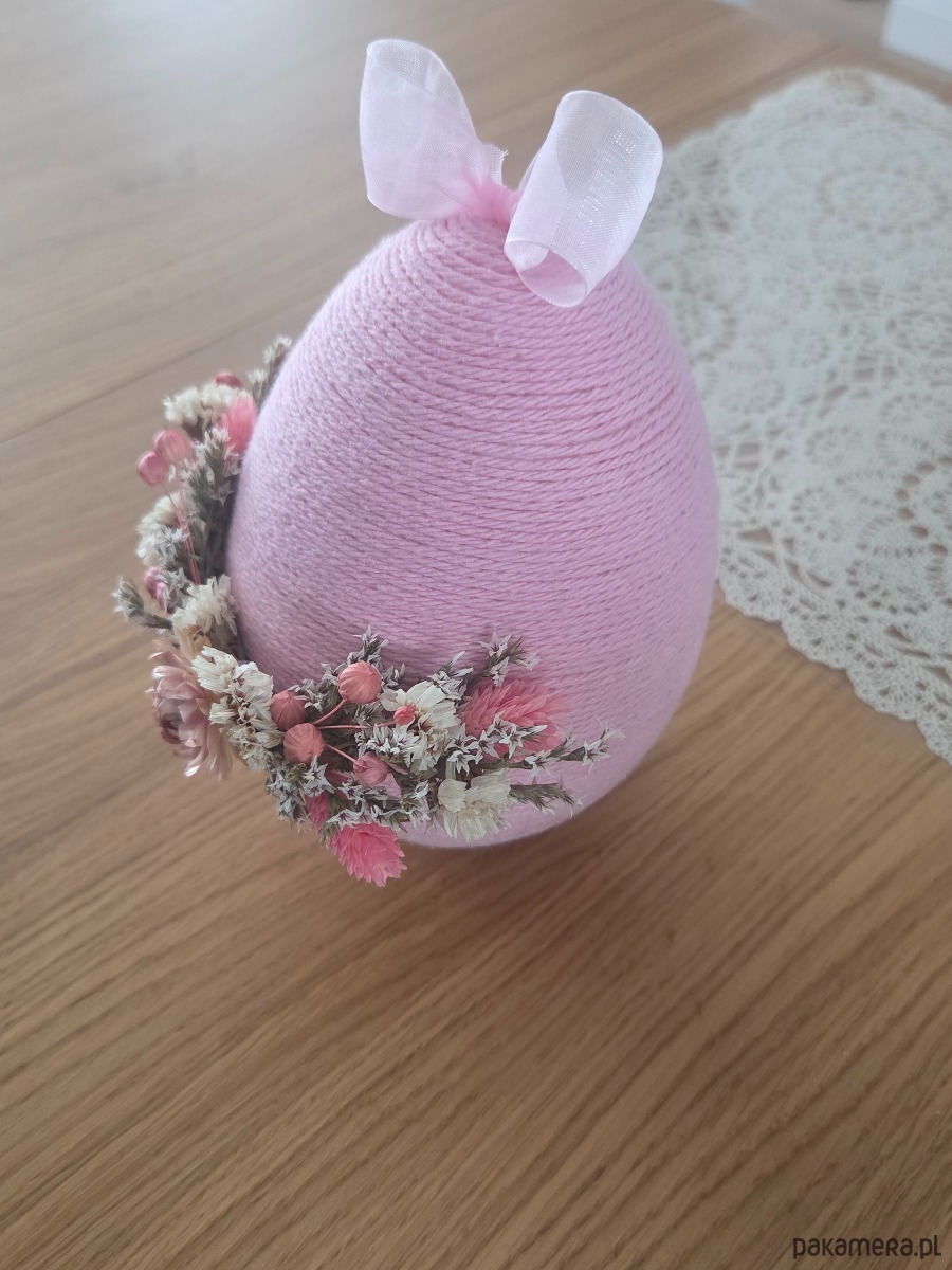 Ręcznie wykonana ze styropianowego jajka owiniętego bawełnianym sznurkiem, ozdobiona subtelnymi suszonymi kwiatami i trawami. Ozdoba z kwiatów jest tylko z przodu jajka.