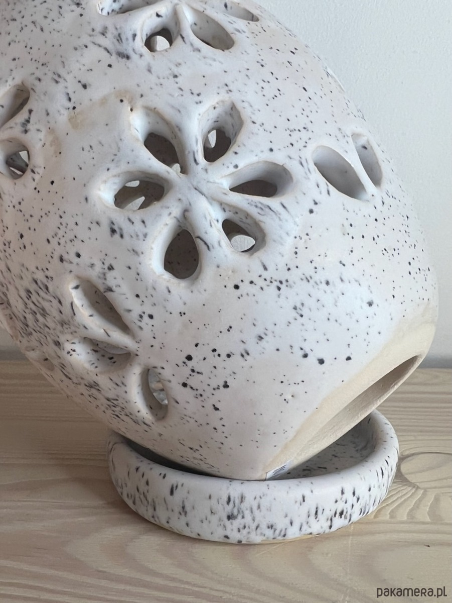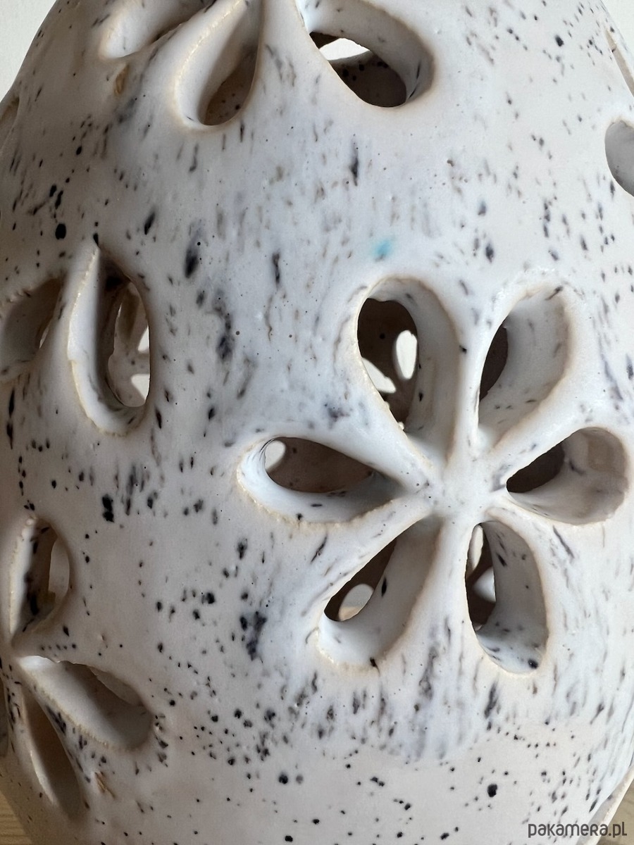 Duże jajko ceramiczne z podstawkiem, z odręcznie wyciętymi otworami w kształcie kwiatków - jak wielka pisanka, pokryte białym, matowym szkliwem z piegami.