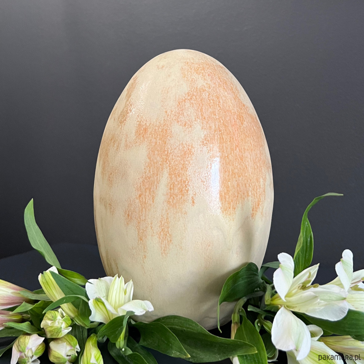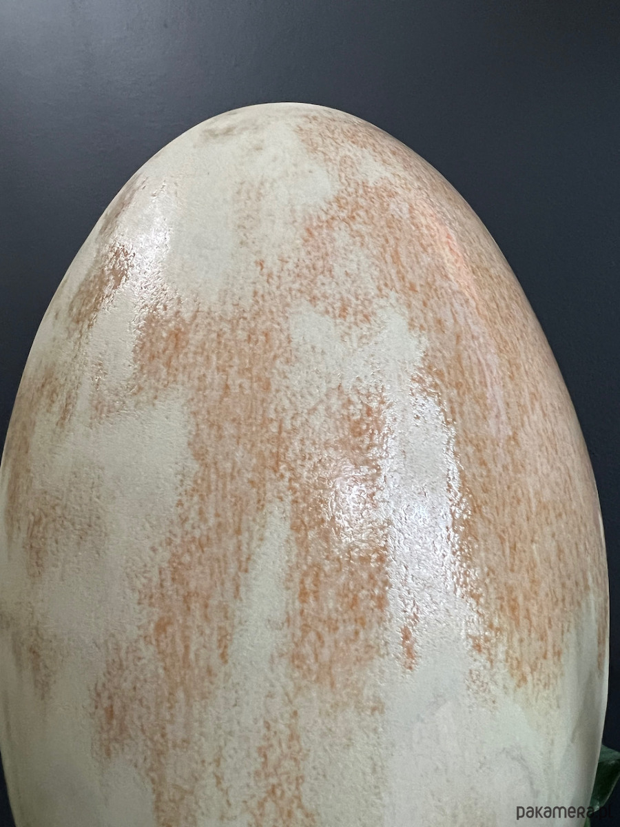 Duże jajko ceramiczne, pokryte cieniowanym szkliwem z beżowych odcieniach.