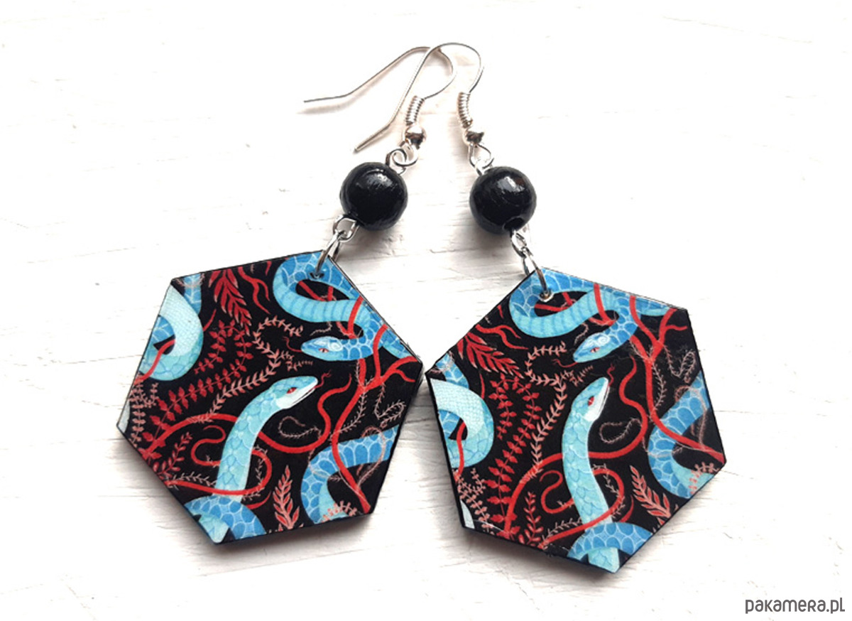 kolczyki drewniane, ozdobione metodą decoupage, dwustronne, starannie wykończone farbami akrylowymi i zabezpieczone wielokrotnie lakierem, koraliki drewniane, bigle posrebrzane, długość kolczyków bez bigli: 5 cm, szerokość: 3,3 cm, bardzo lekkie